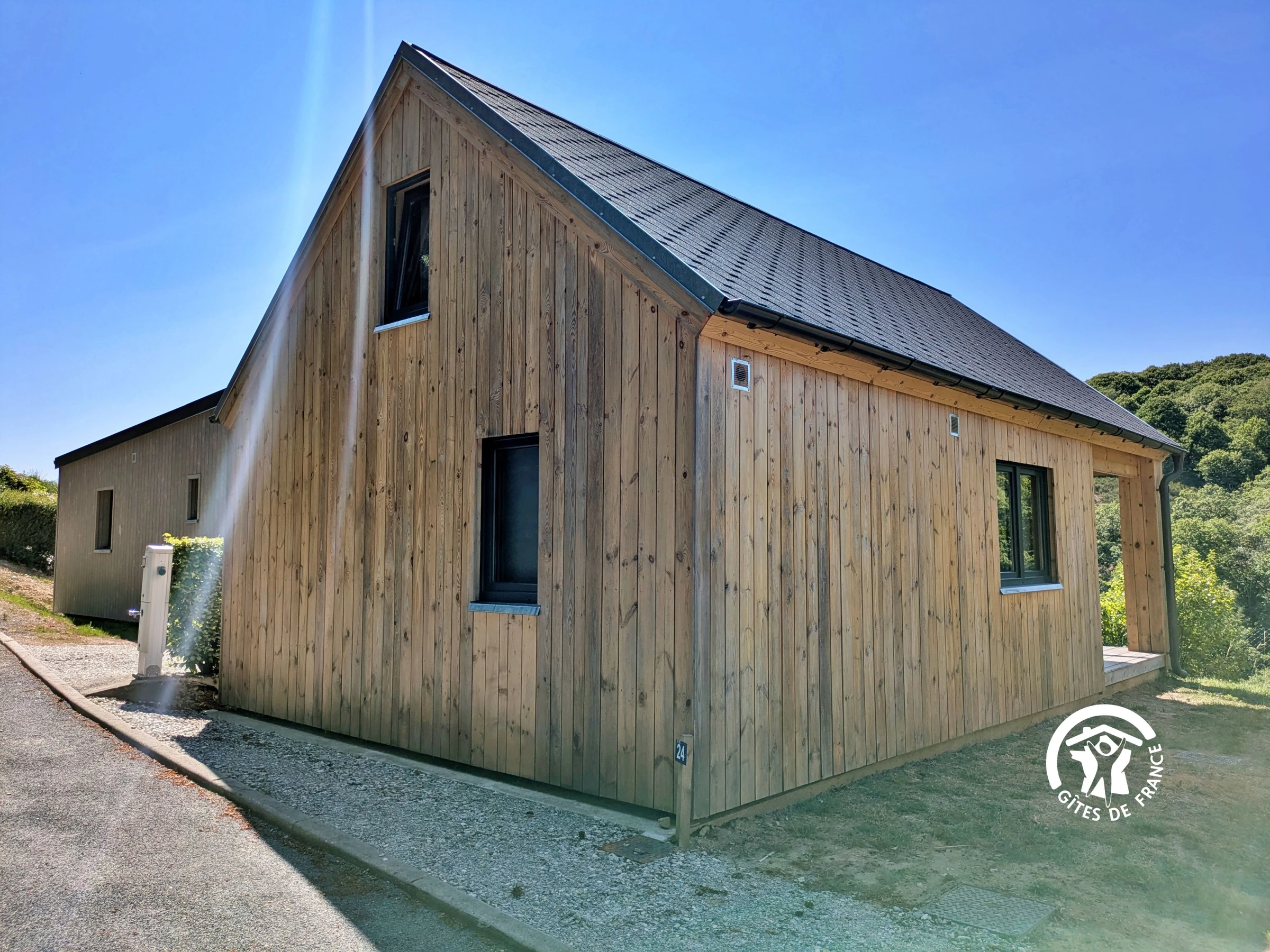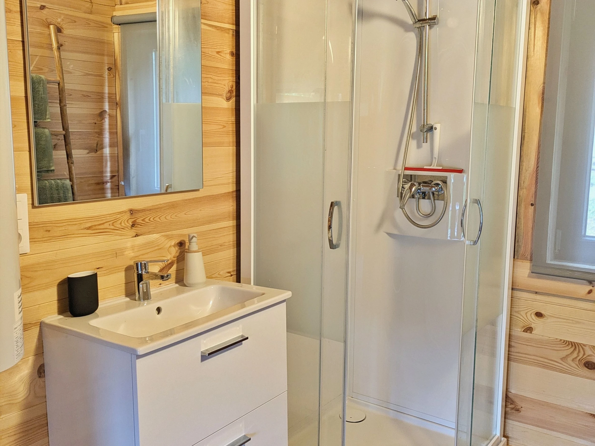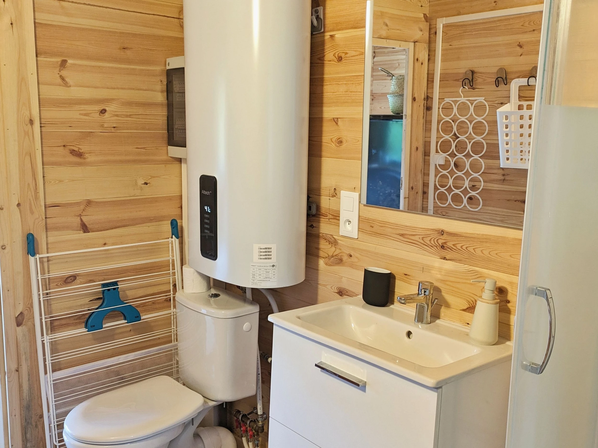 Business stay: Maximum 2 adults for 1-month bookings, 3 people for a maximum of 4 nights. 39 m² wooden chalet. Entrance via a 13 m² terrace (without railings) equipped with garden furniture. LEVEL 0: Living room with kitchenette (refrigerator with freezer compartment, microwave, 1 electric hob, toaster, kettle, filter coffee machine), dining table and high chairs, lounge area with sofa and coffee table - 1 bedroom with two 80x190cm twin beds (can be joined to make a 160x190cm double), storage, bedside table, two bedside tables - Shower room with shower, sink, toilet and towel warmer. MEZZANINE, accessible by a steep ladder (not recommended for children under 6), two 80x190cm twin beds and two bedside tables, safety gate. Shared facilities at the campsite (mid-April to early October): washing machine (€4), tumble dryer (€3) - electric barbecue - ping-pong table. Baby equipment: high chair (on request). Parking: temporary parking available in front of the chalet, then a space near the chalet from mid-October to mid-April. In summer, parking is available near the campsite.