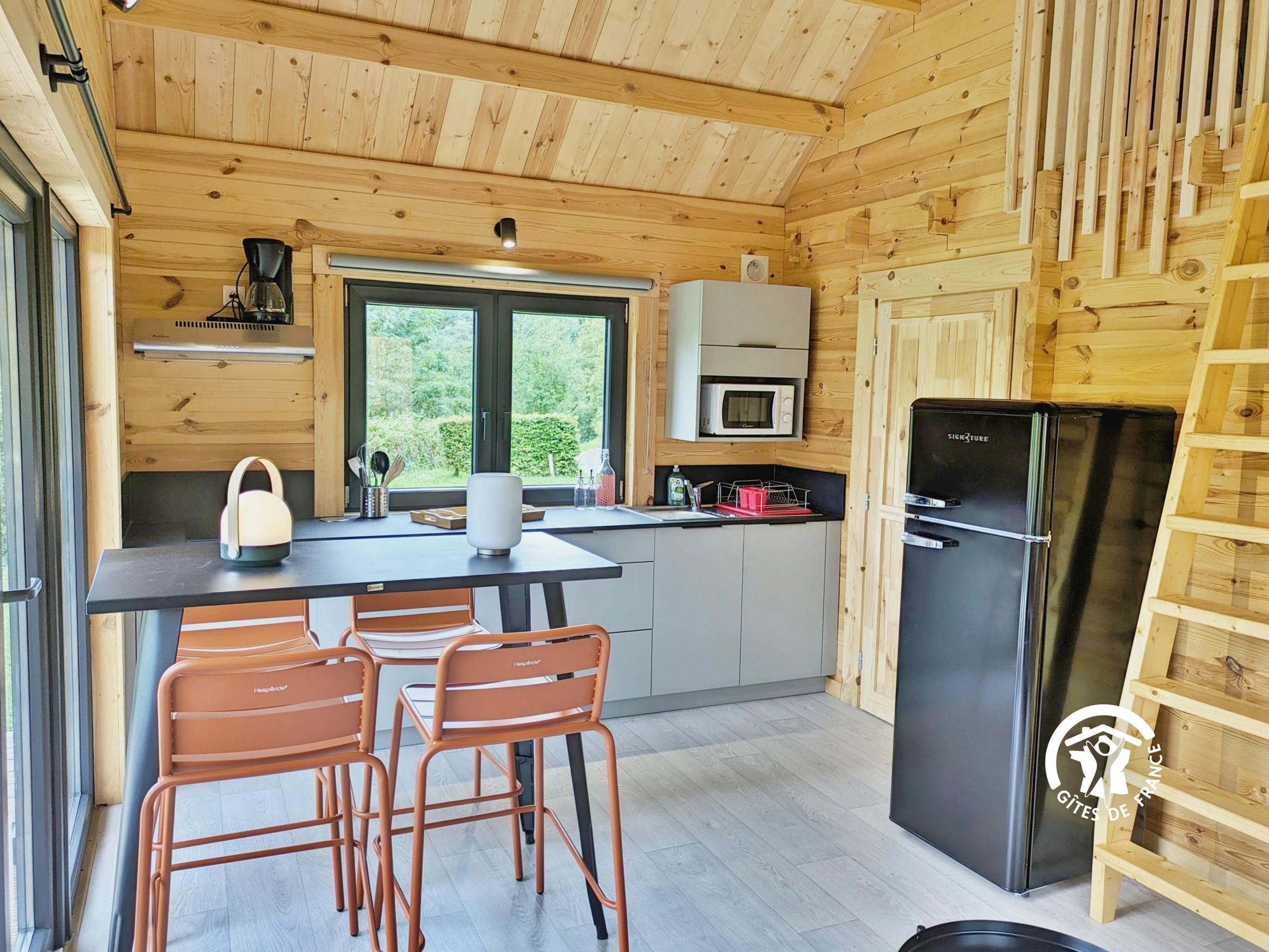 INCLUDED: Beds made - kitchen linens - towels - cleaning (daily tidying and cleaning of the accommodation is mandatory; otherwise, an €80 cleaning fee will be charged upon departure). SUPPLEMENT: Pets welcome €2/night/pet - 1 pet maximum. Traveling with a large group? Camping de Coupeau offers a total of 4 leisure chalets for 4 people and 4 lodge tents for 2 people, as well as bare pitches. Access to the chalet and terrace is via a step. The living area, bedroom, and bathroom/toilet are on the same level. A second bedroom is located on a mezzanine level and is accessed via a steep ladder.