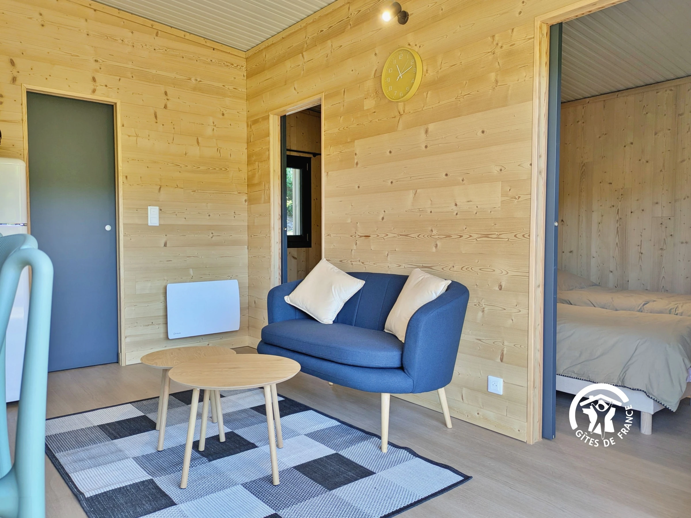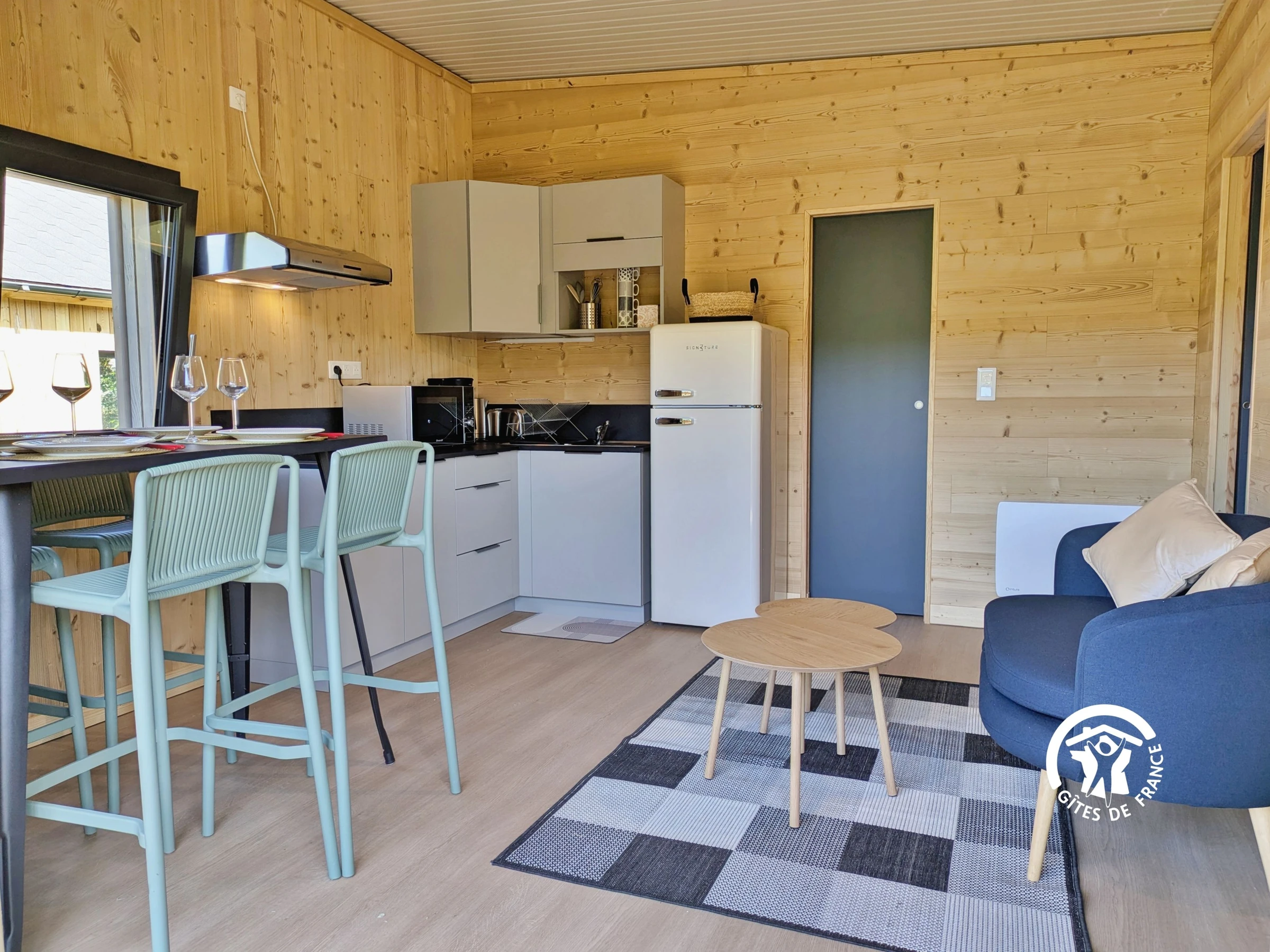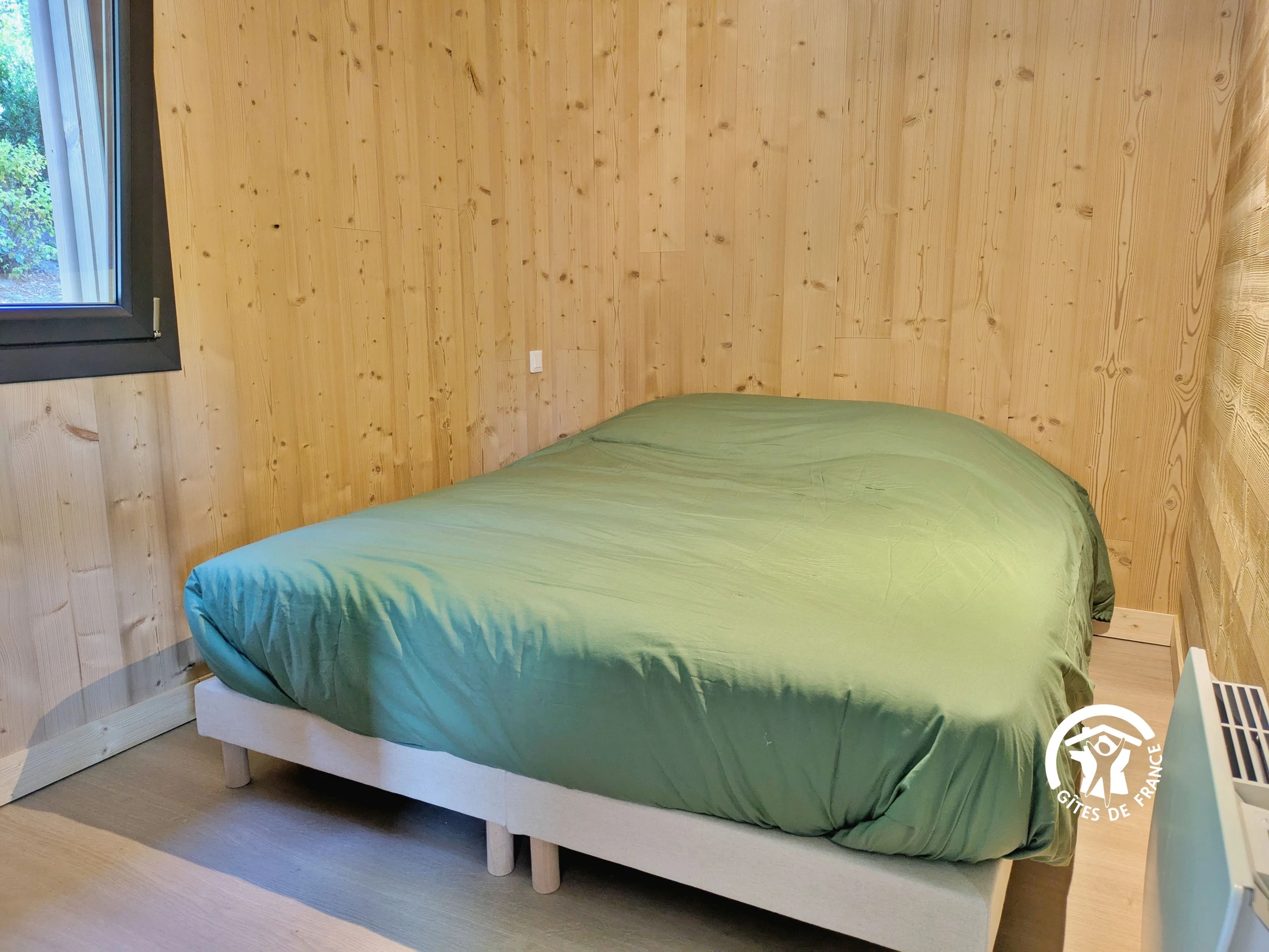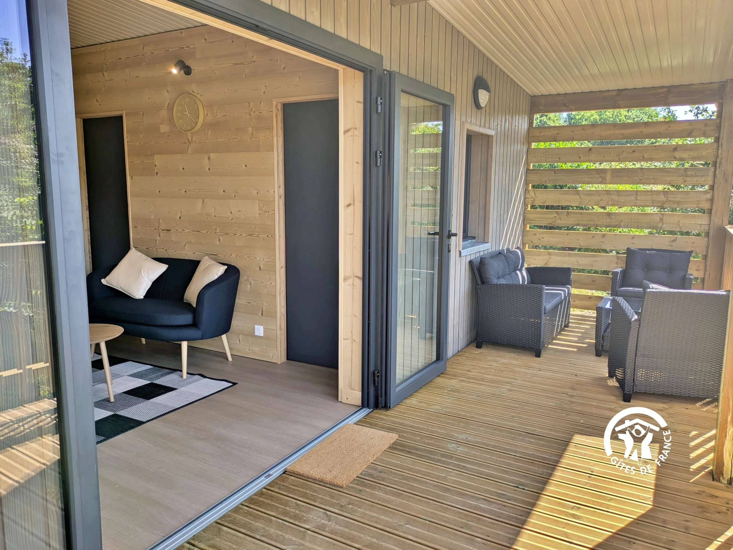Business stays: Long-term booking (1 month): Maximum 2 adults - Short stay (up to 4 nights): Maximum 3 people. Single-story wooden chalet (29m²). Entrance via a covered terrace with railing (13.50m²) furnished with garden furniture.