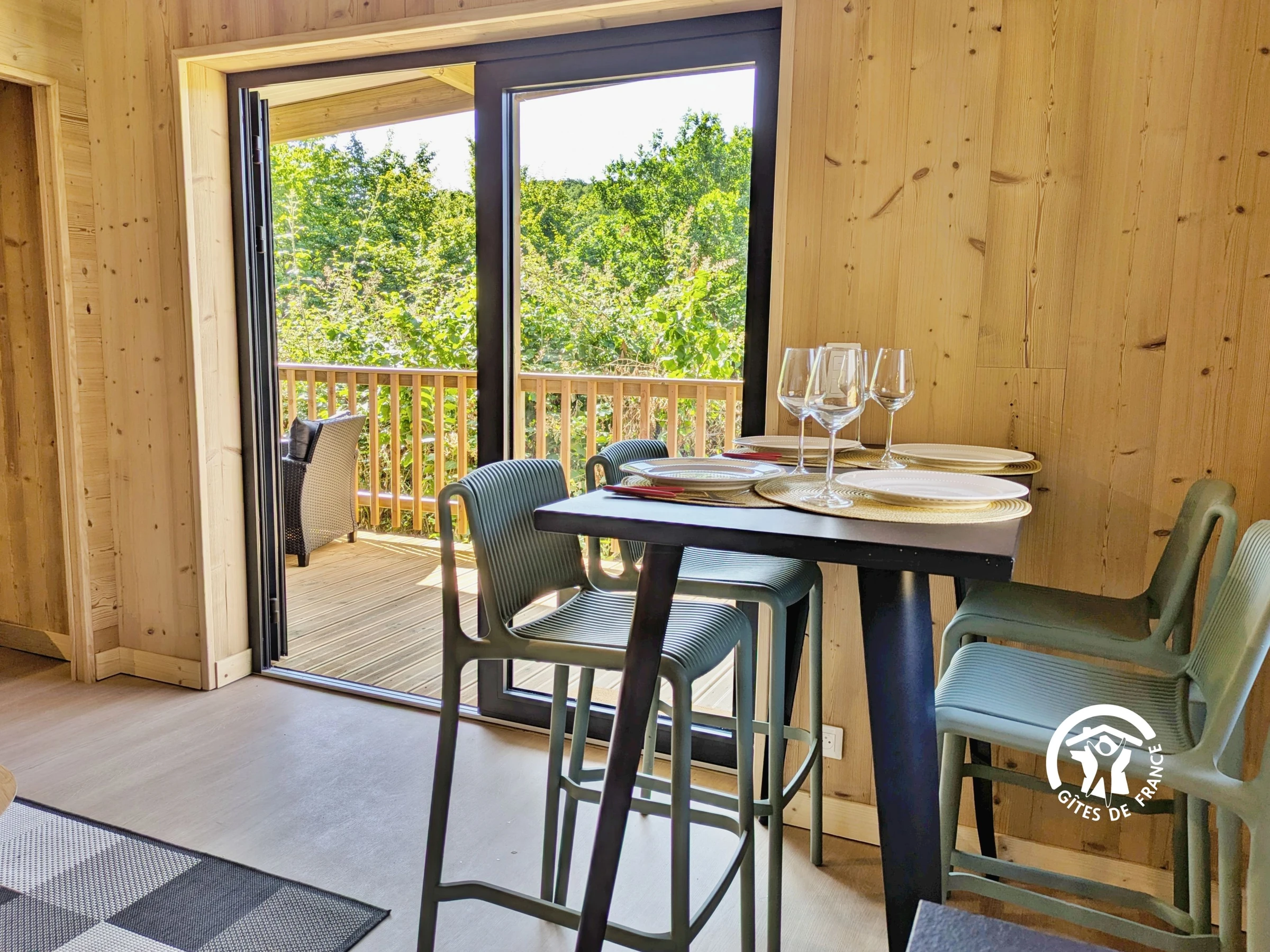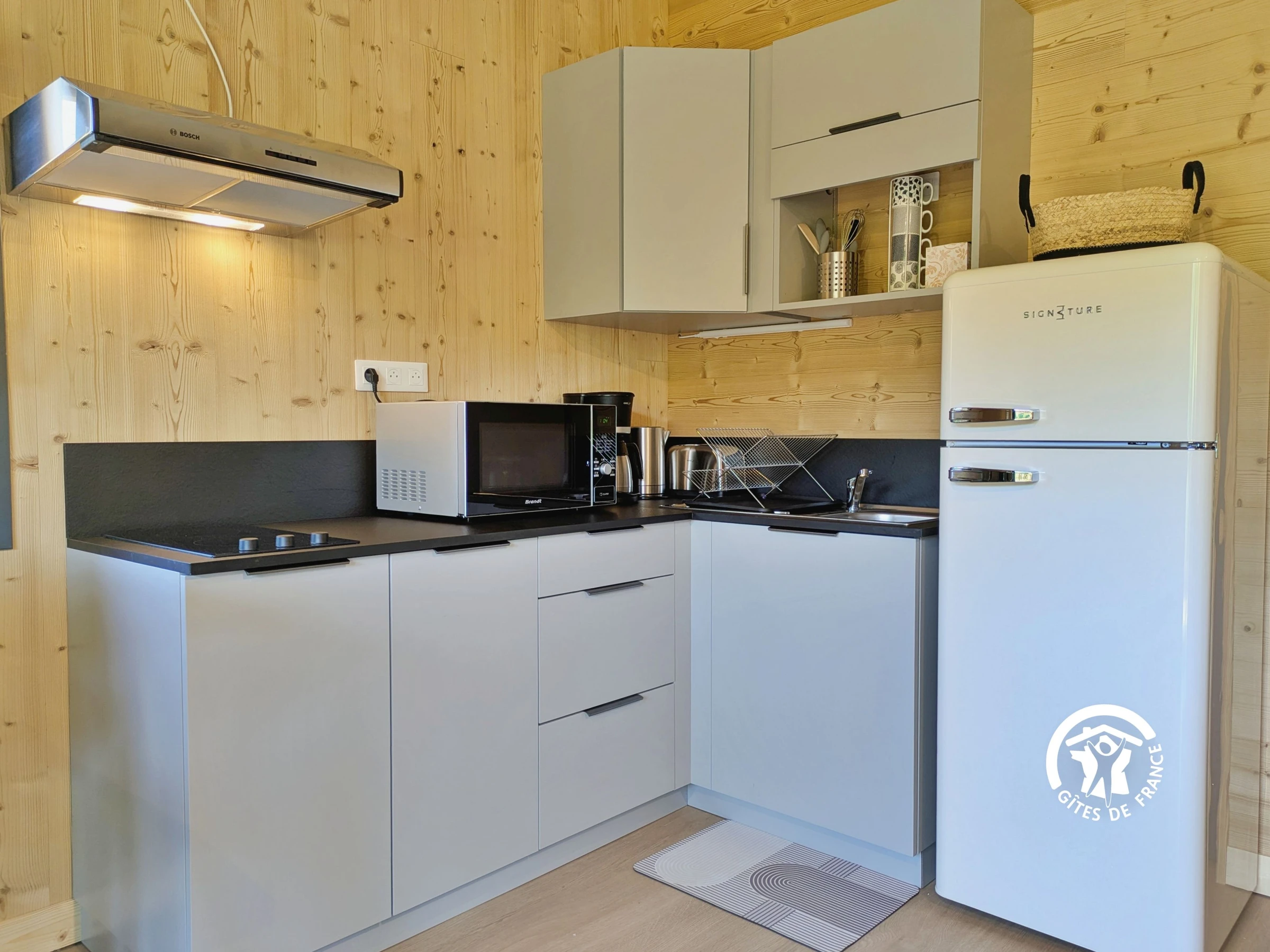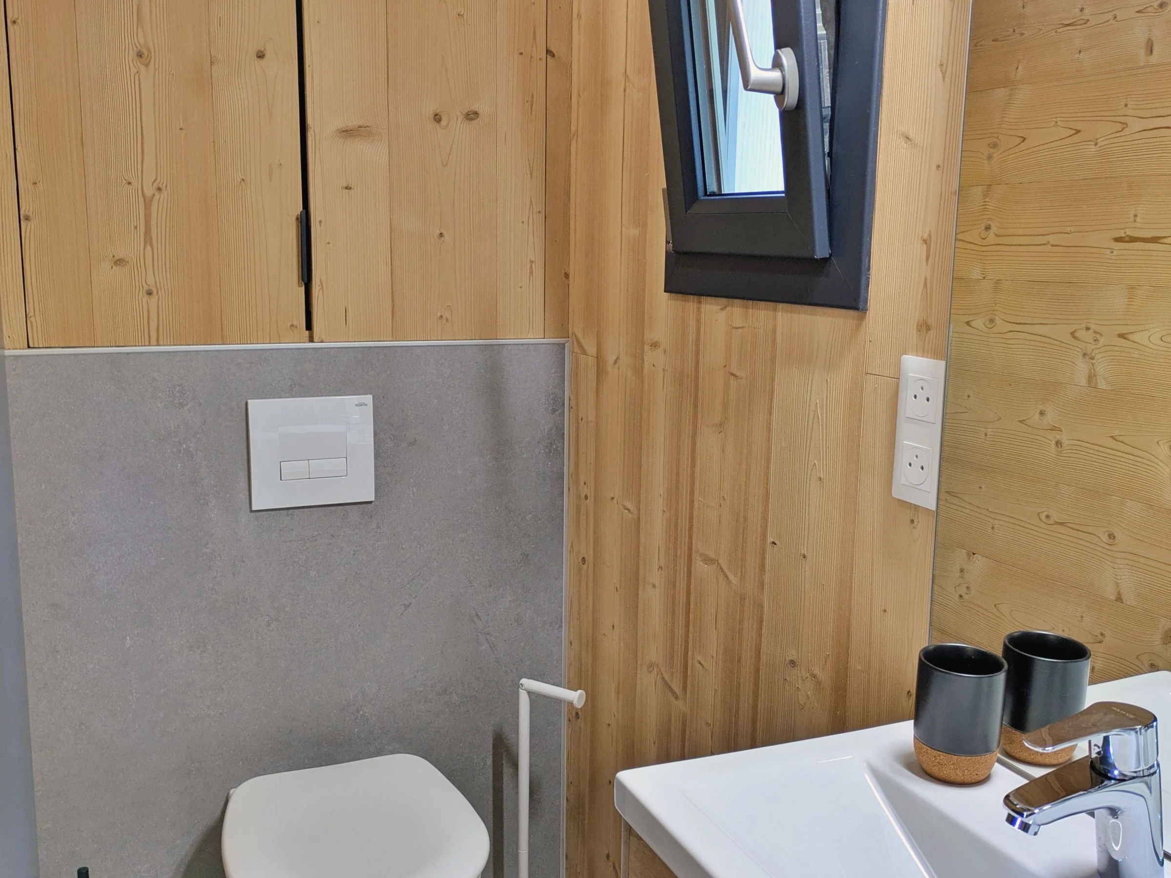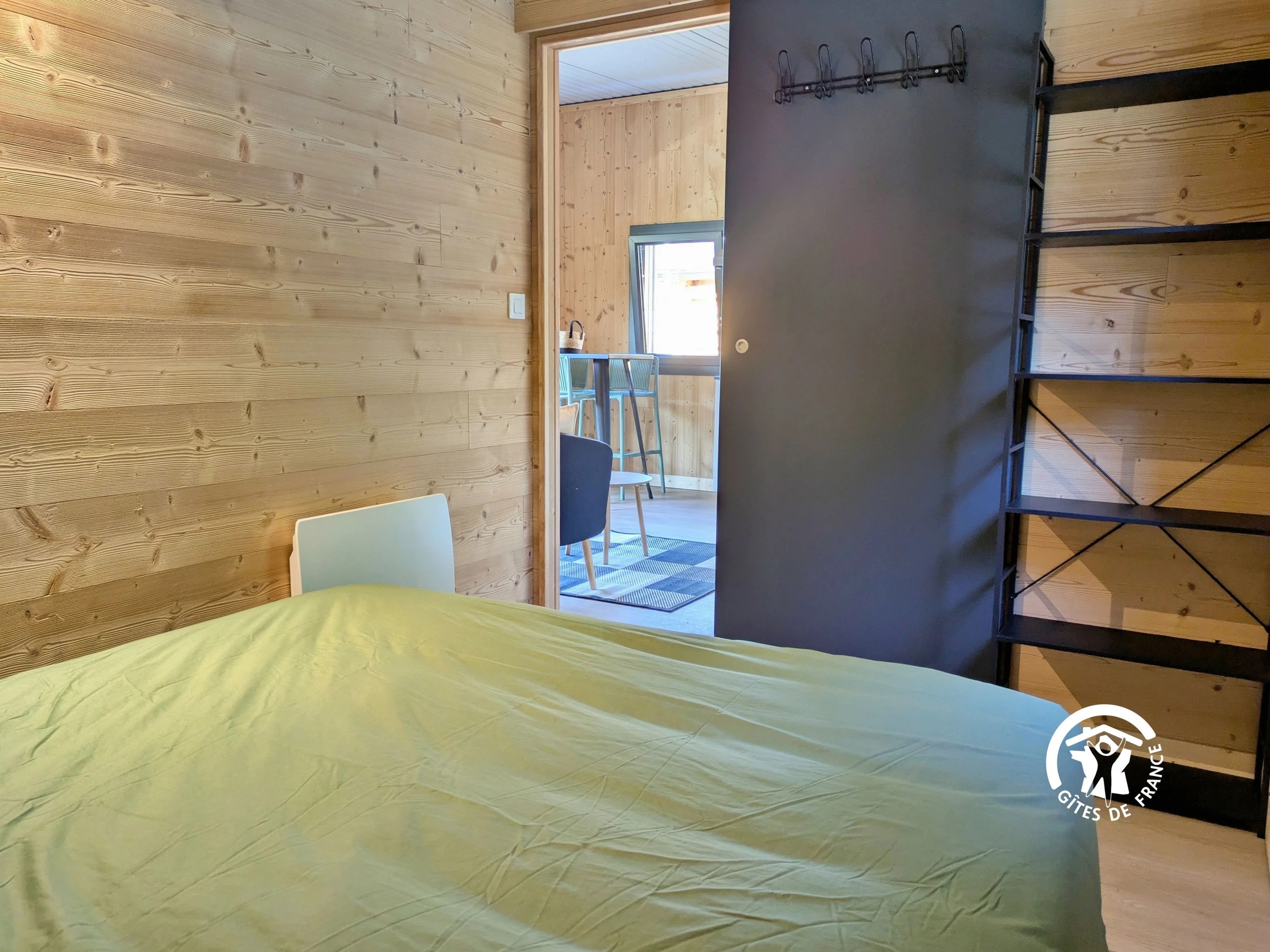 Business stays: Long-term booking (1 month): Maximum 2 adults - Short stay (up to 4 nights): Maximum 3 people. Single-story wooden chalet (29m²). Entrance via a covered terrace with railing (13.50m²) furnished with garden furniture.