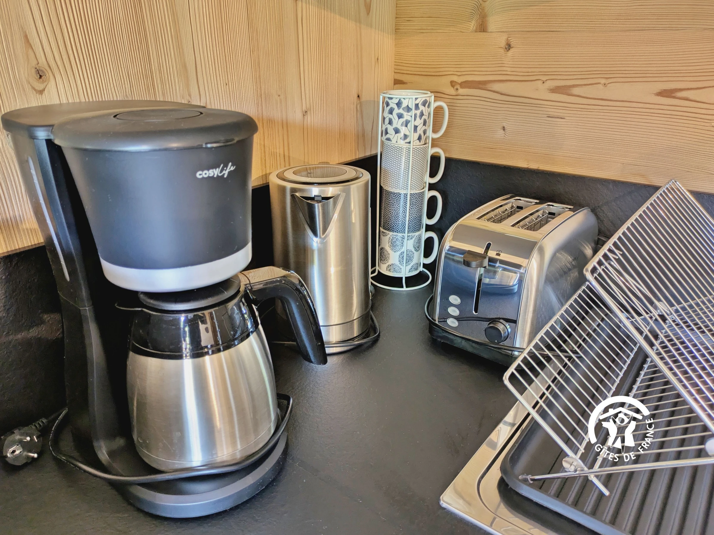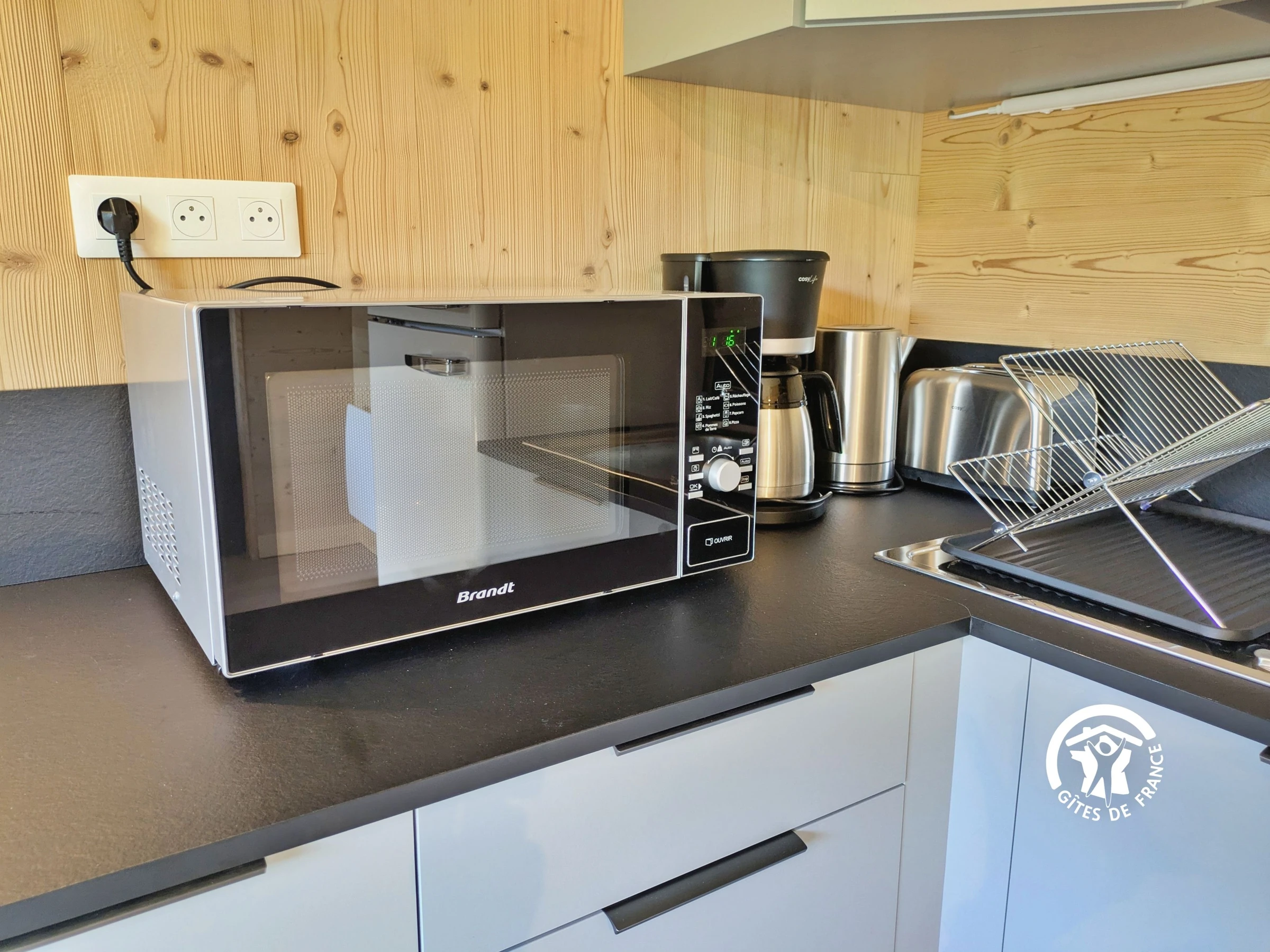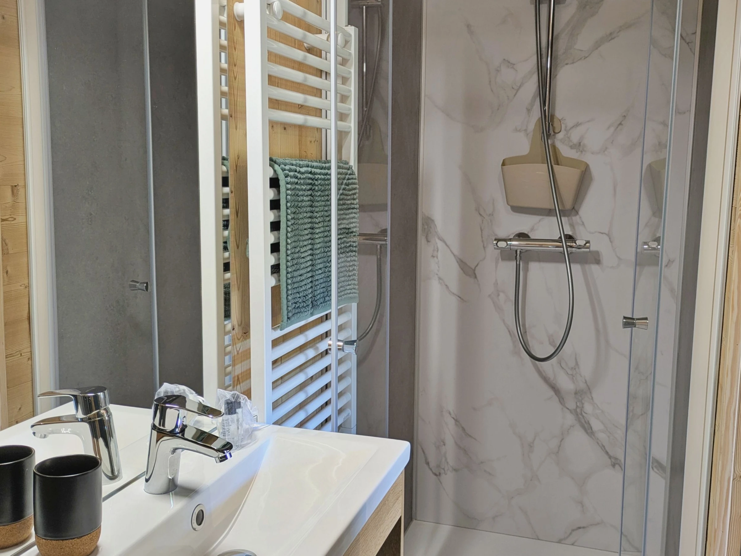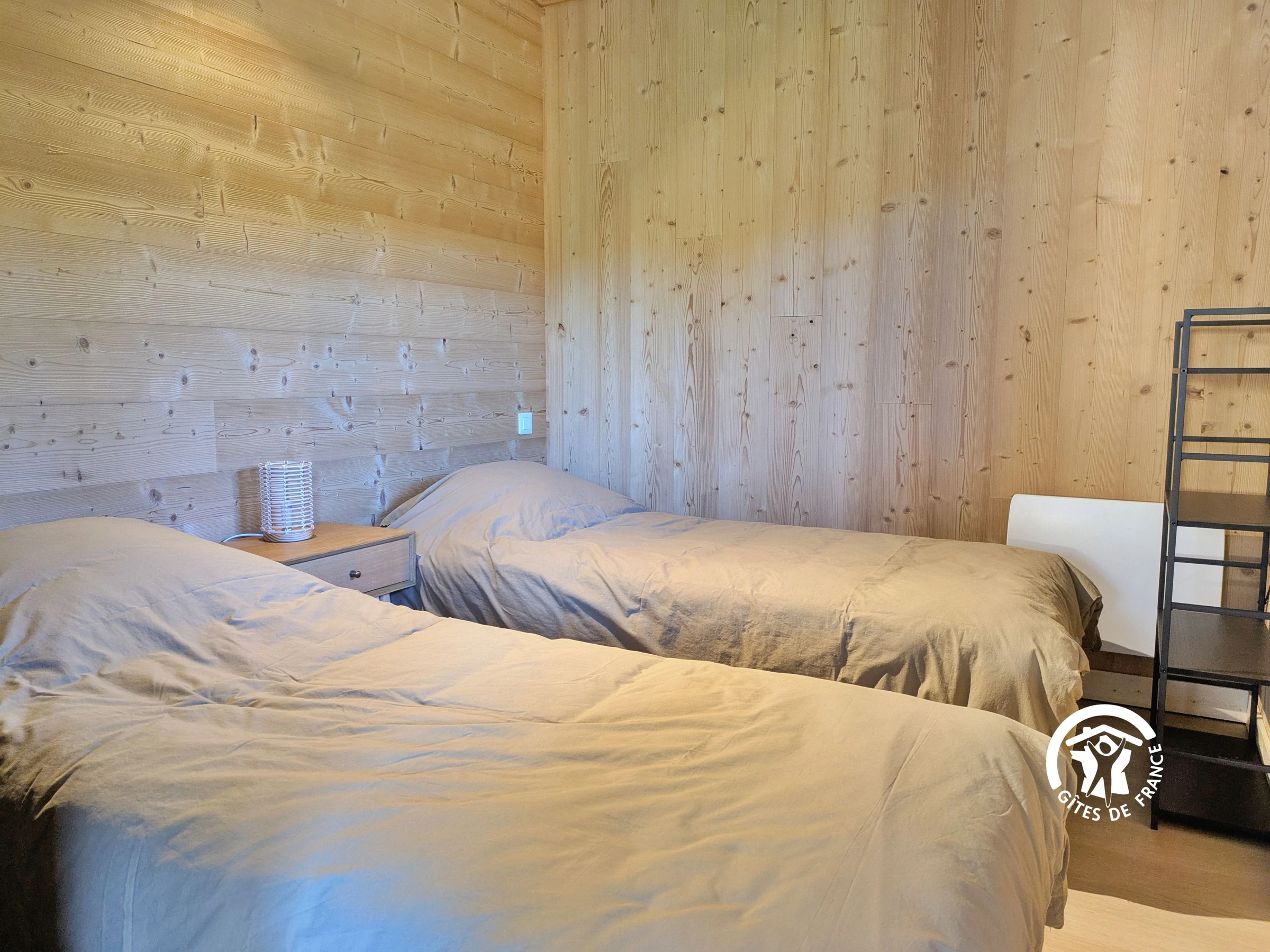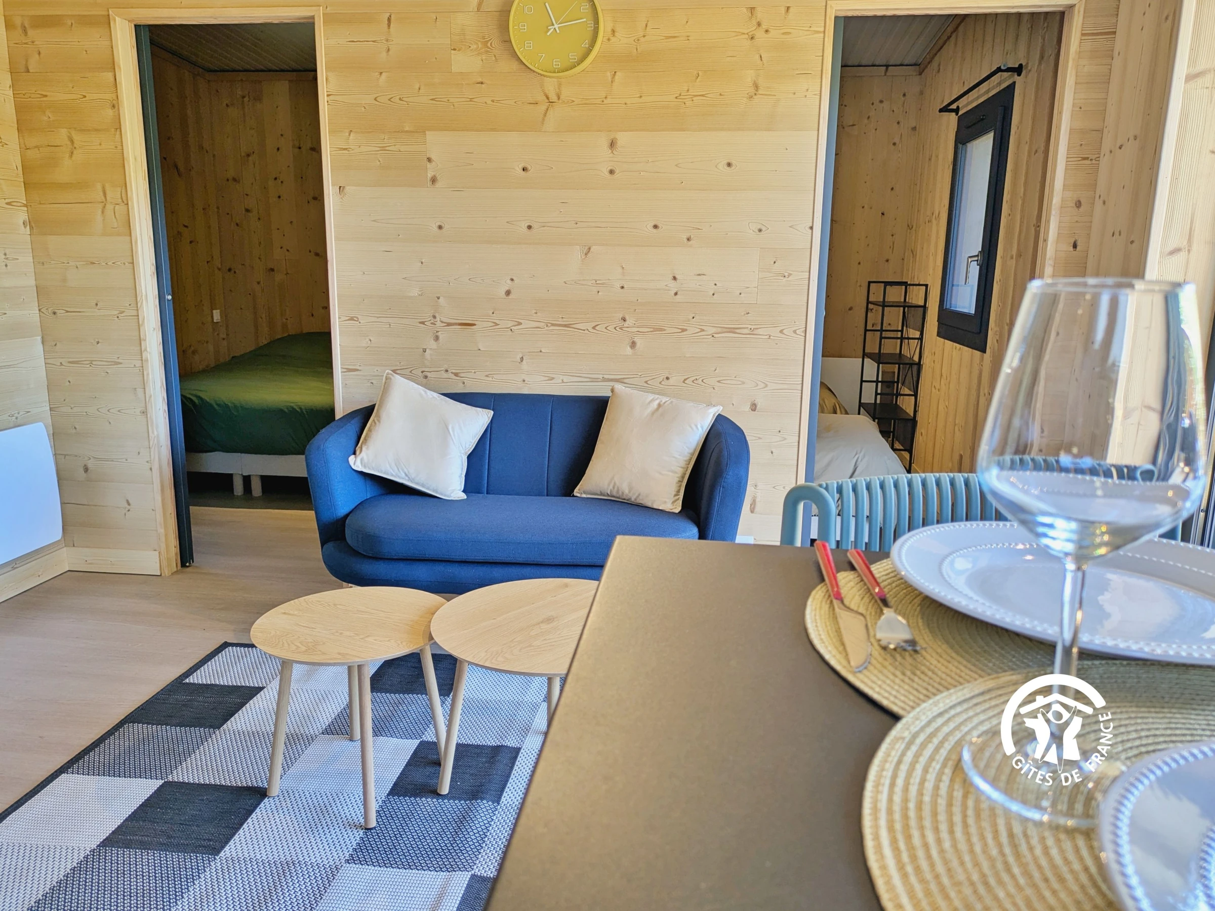 GROUND FLOOR: Living room with kitchenette (13.50m²): refrigerator with freezer compartment, multi-function microwave, range hood, 2 electric hobs, toaster, kettle, filter coffee maker. Table and high chairs for meals. Living area with sofa and coffee table - Bedroom 1 (7m²), two twin beds (80x190cm) that can be joined to make a double bed (160x190cm), bedside table, storage shelf - Bedroom 2 (6.5m²), two twin beds (80x190cm), bedside table, storage shelf - Bathroom (2.8m²): shower, sink, toilet, and towel warmer.