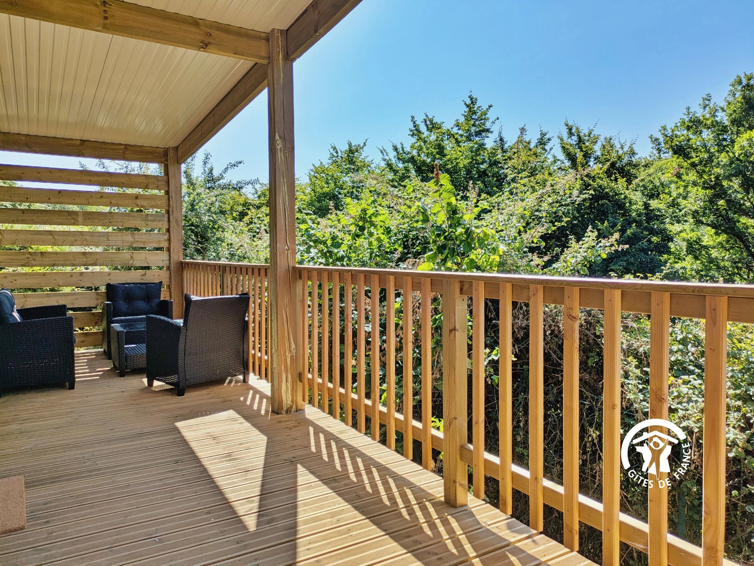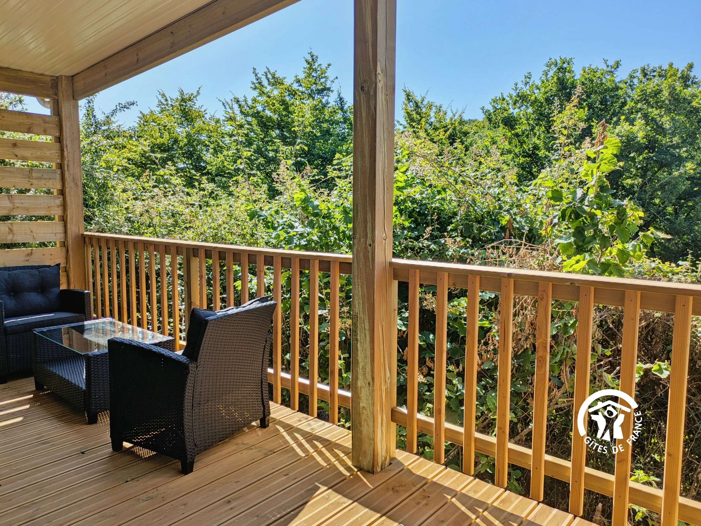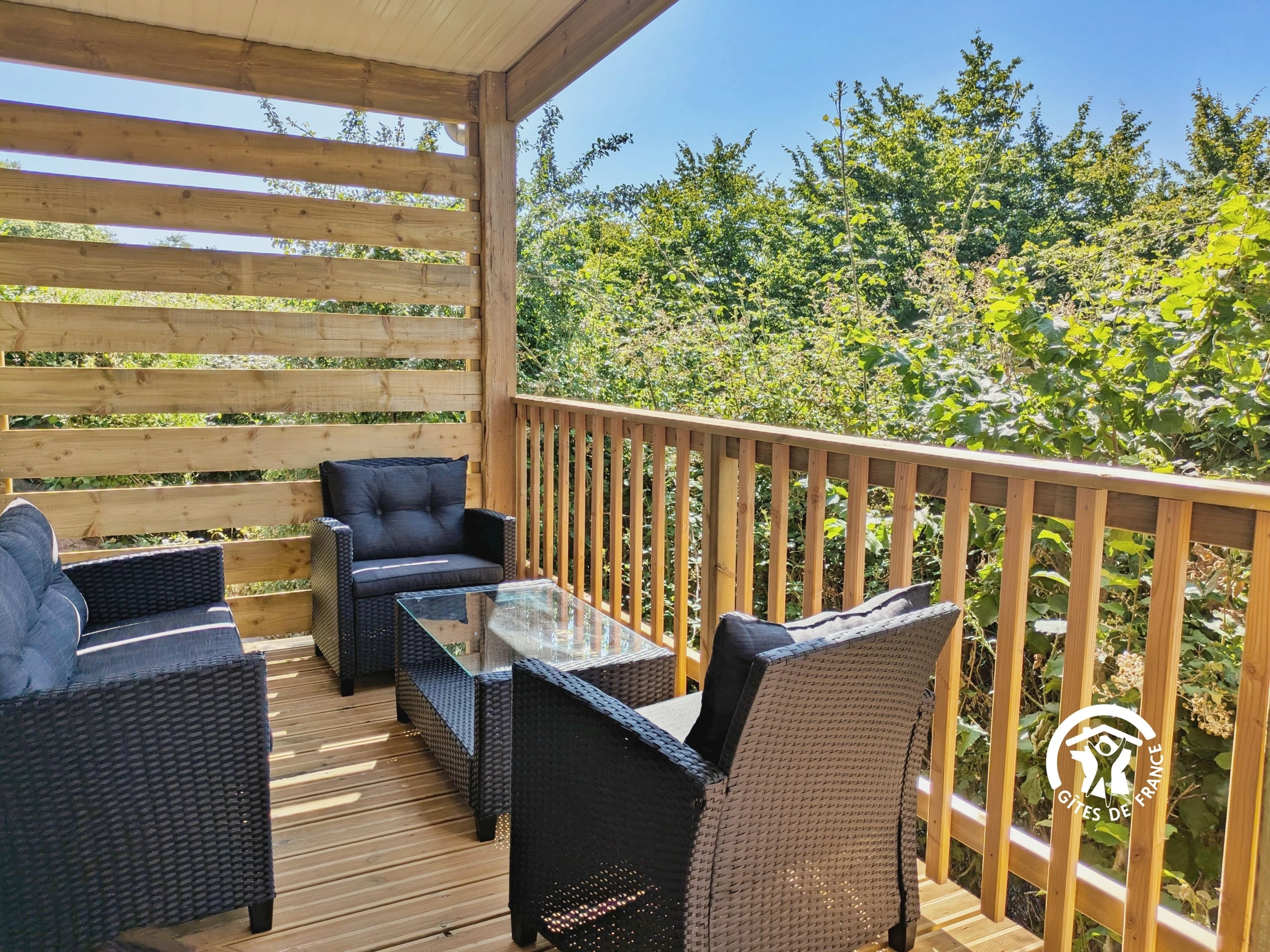 Campeau campsite offers 4 leisure chalets for 4 people, 4 lodge tents for 2 people, as well as bare pitches for tents or caravans. Access to the chalet and terrace is via two steps. Chalet on the ground floor.