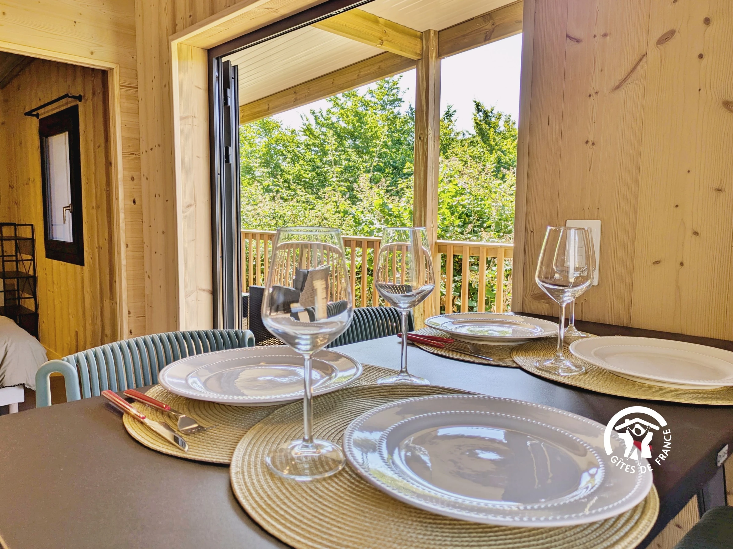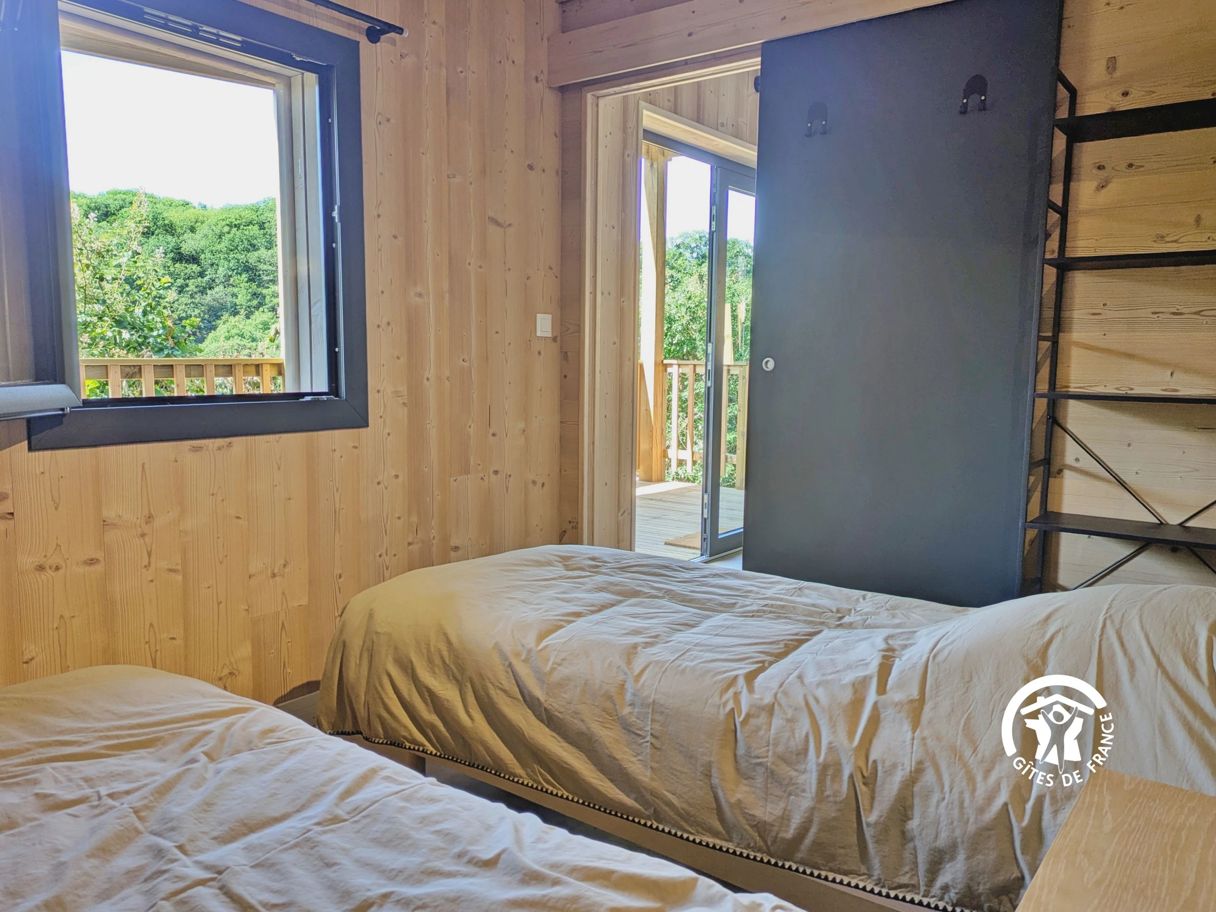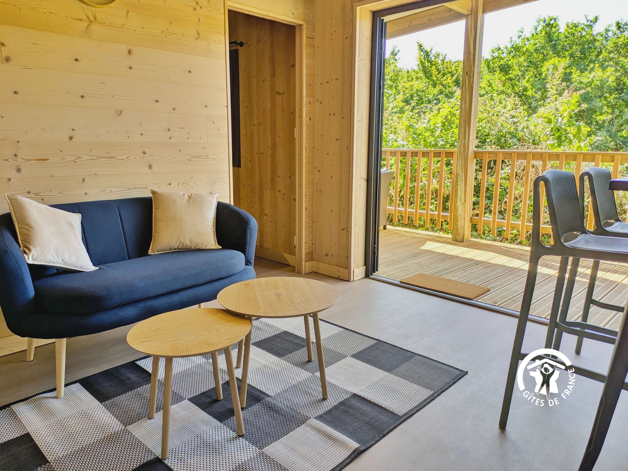 Campeau campsite offers 4 leisure chalets for 4 people, 4 lodge tents for 2 people, as well as bare pitches for tents or caravans. Access to the chalet and terrace is via two steps. Chalet on the ground floor.
