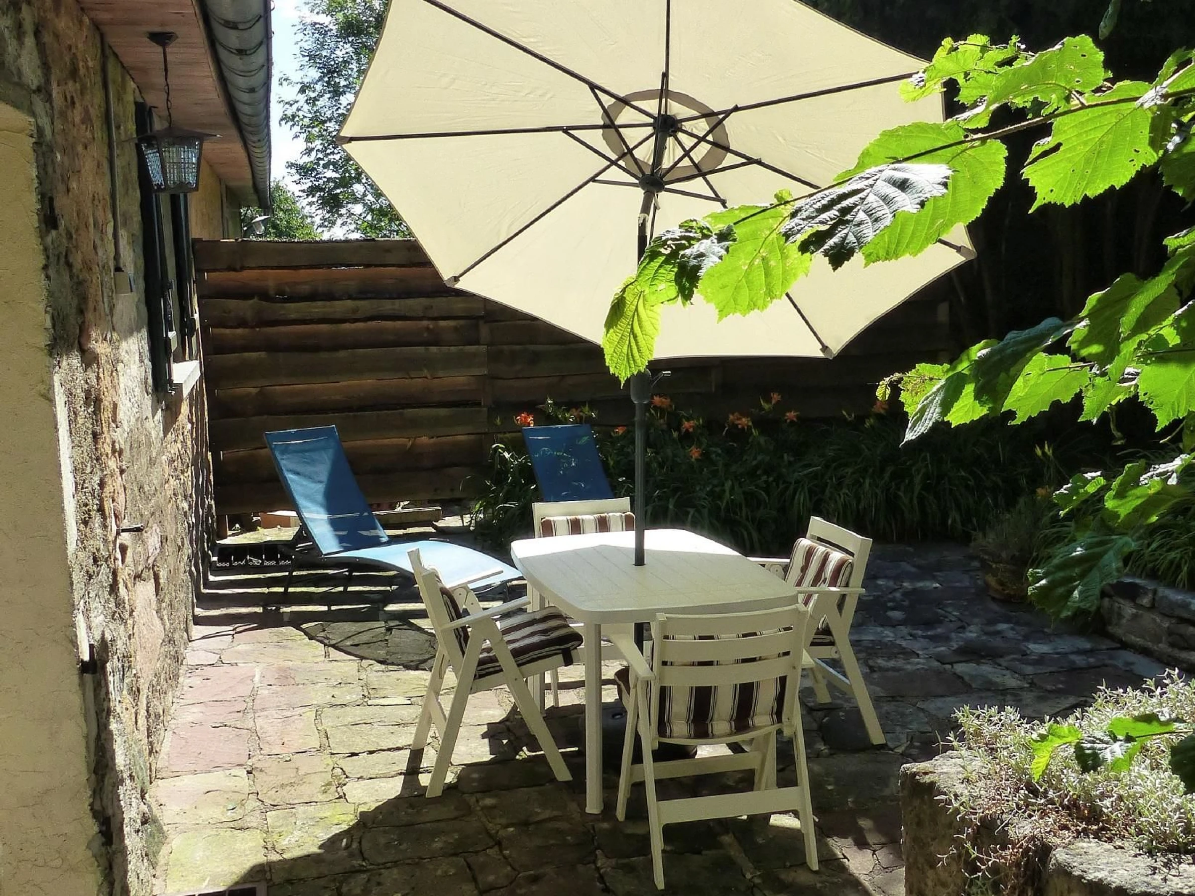 Outside: a terrace, a private garden with a barbecue, garden furniture, a parasol, and two deckchairs.