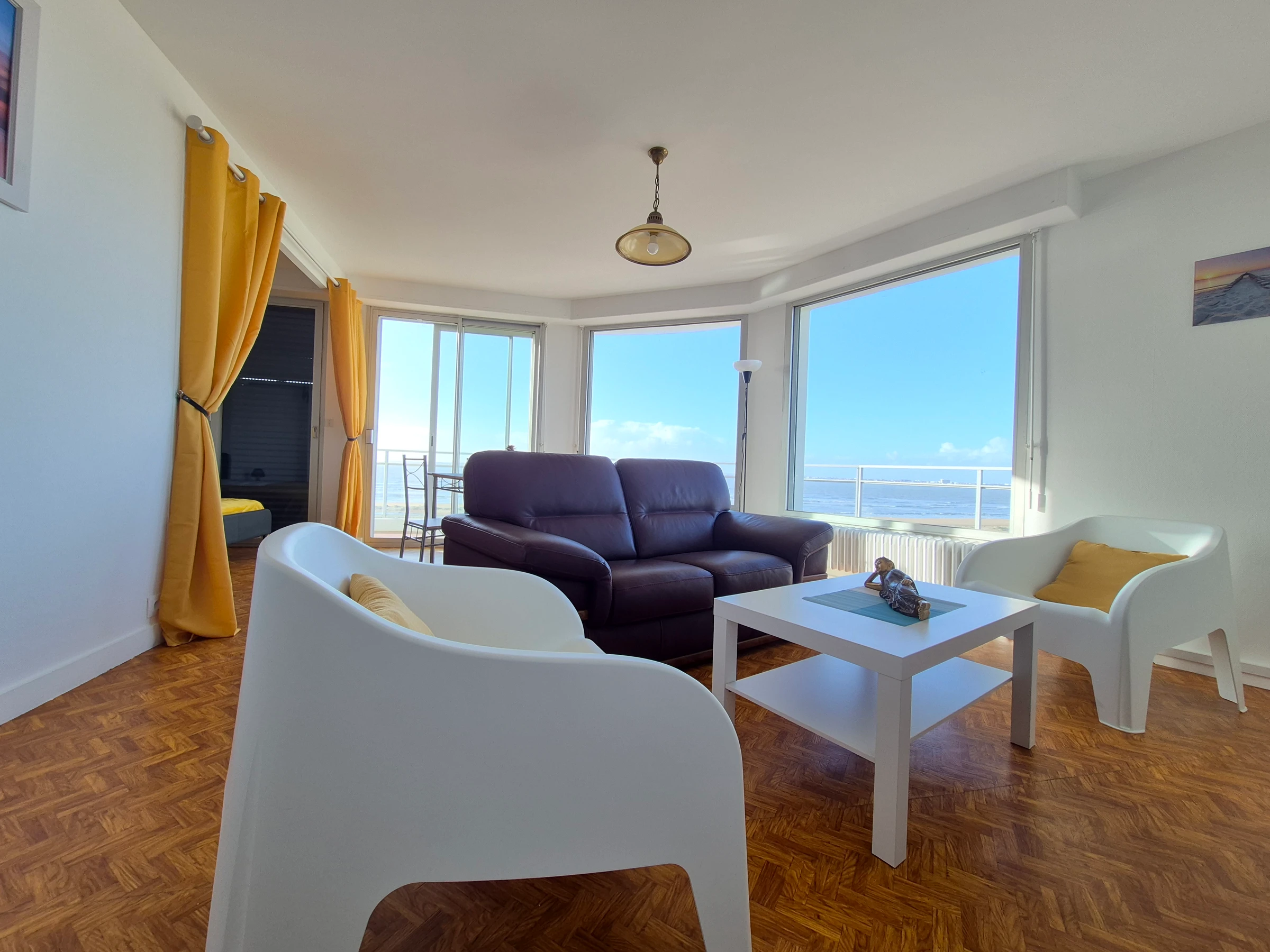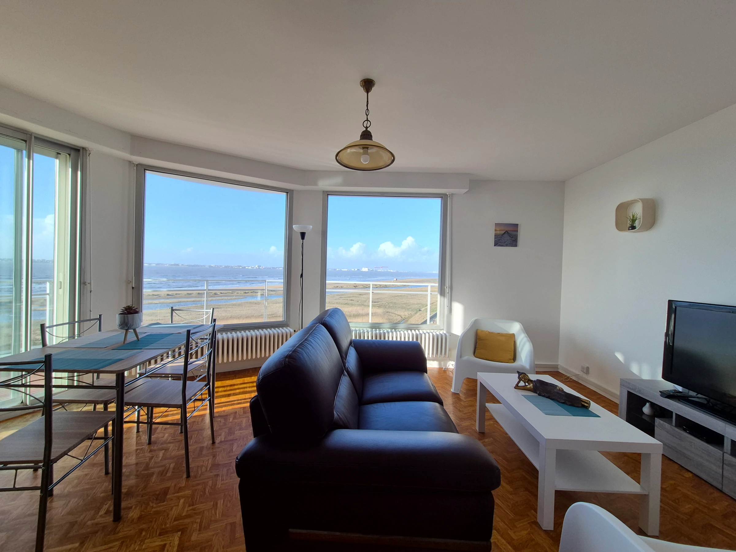 Bright living room with sofa, TV, dining table, and access to terraces with panoramic views of the sea and Saint-Nazaire