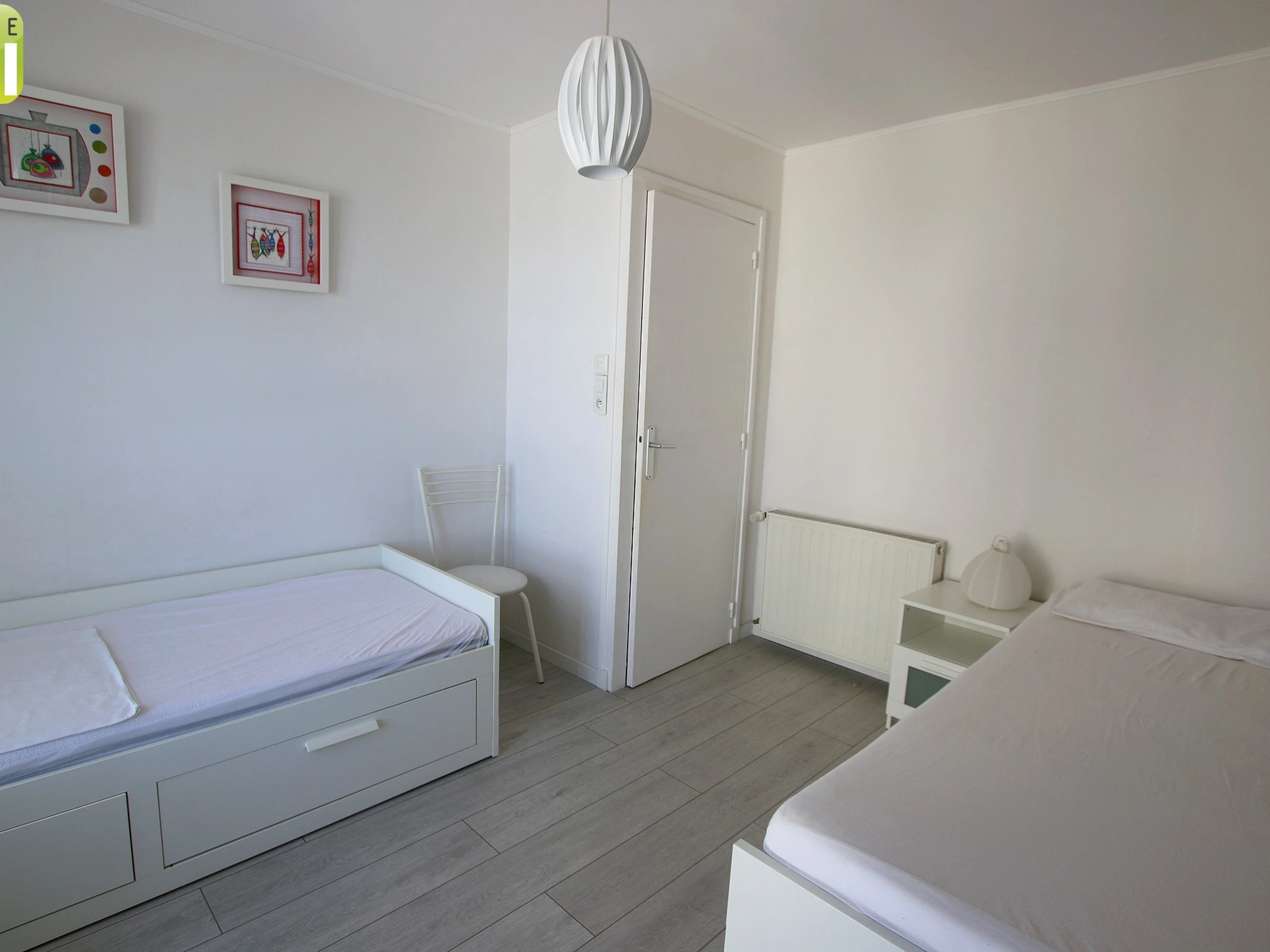 The flat comprises a living room with sofa and TV, a fitted and equipped kitchen (oven, microwave, gas hob, dishwasher, extractor fan, fridge-freezer), and a south-facing balcony with a sea view. There is also a bedroom with a 140 cm bed, a second bedroom with a 90 cm bed and a pull-out bed (2 x 90 cm), as well as a shower room and separate WC. A private parking space is available.