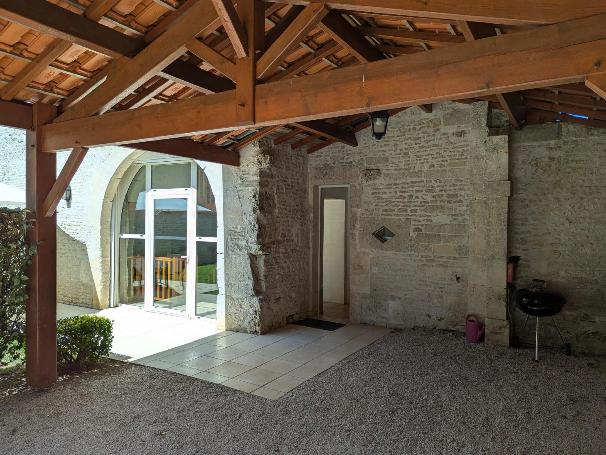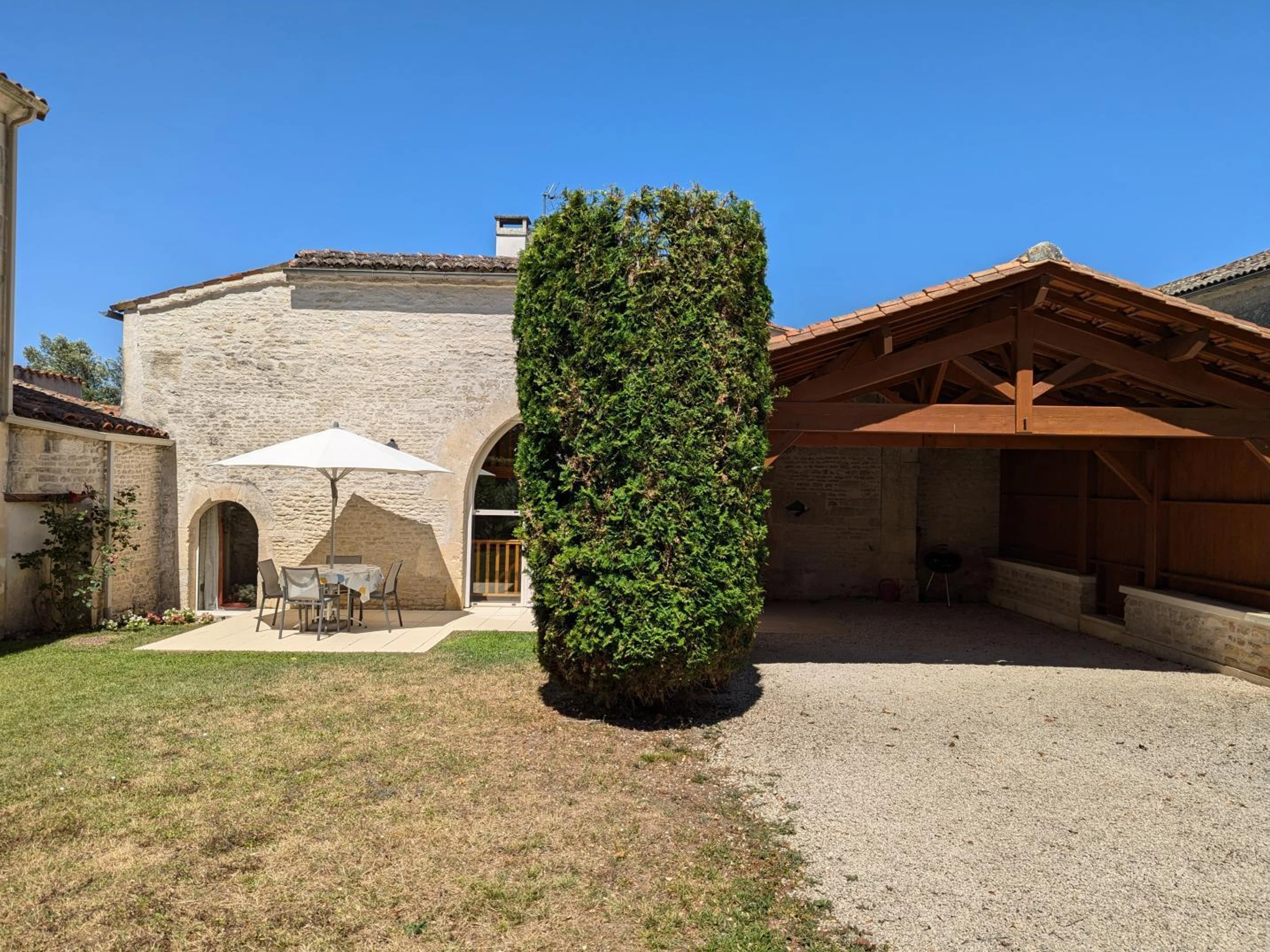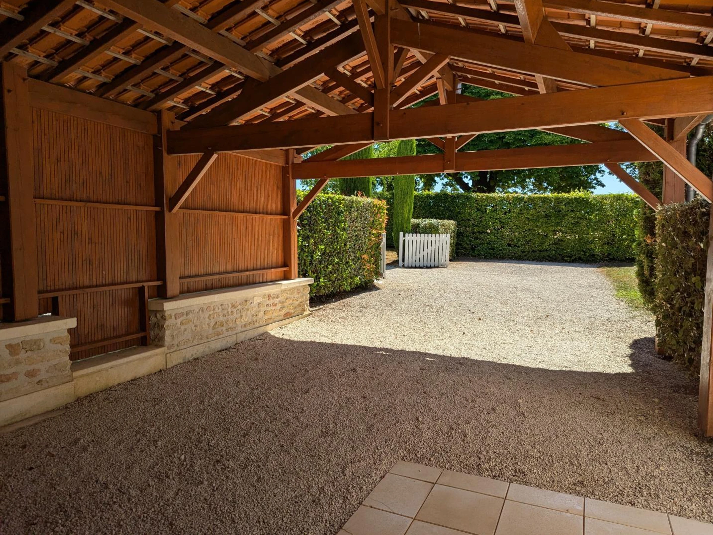 30 m² carport. 15 m² terrace and 200 m² private enclosed garden. Shared swimming pool with disabled access (11x7 m, safety barrier, and cover), heated in mid-season, open from late May to mid-September. 4,000 m² garden with swings, table tennis, and badminton net, shared by all 3 cottages.