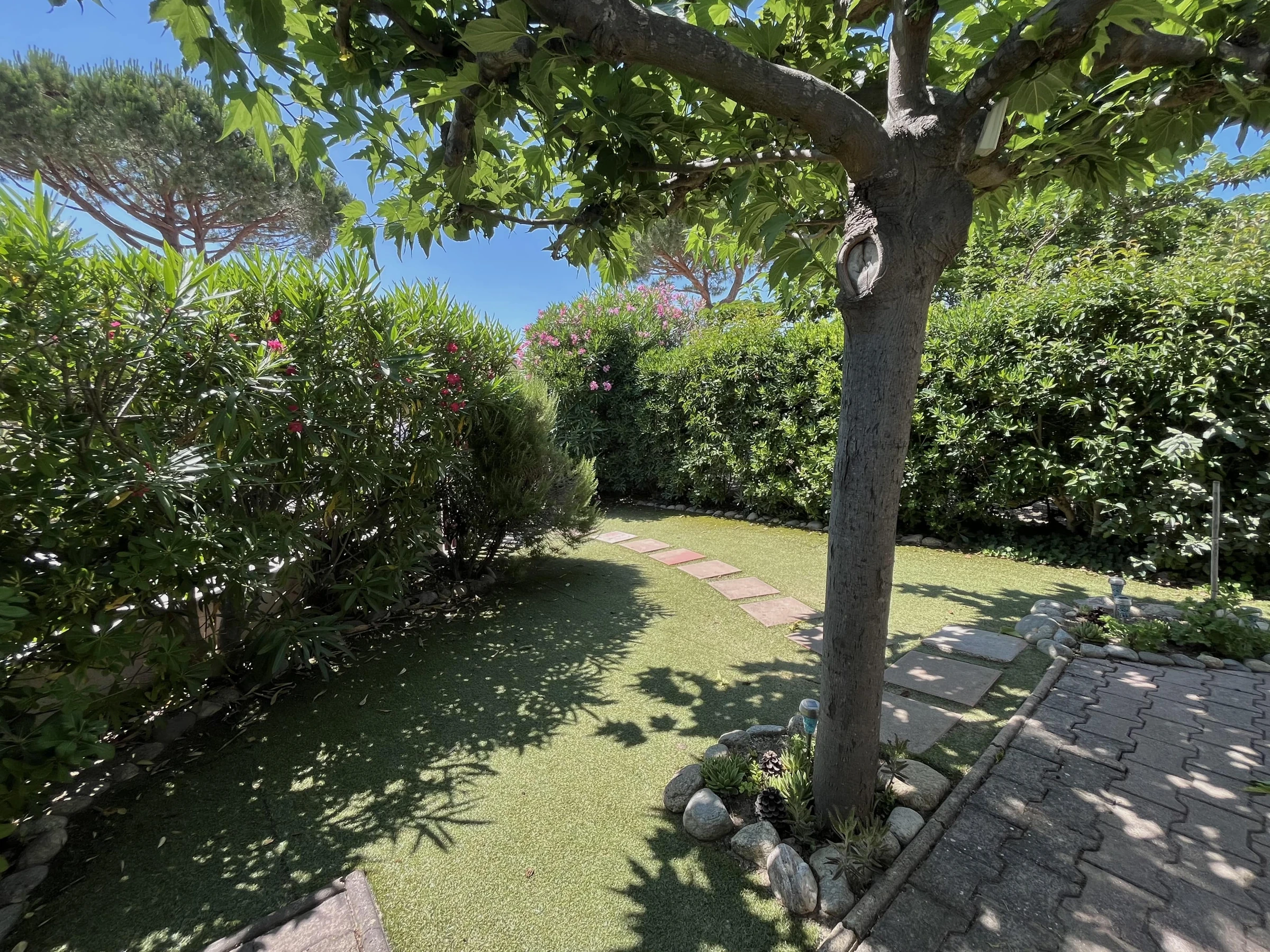 It comprises, on the ground floor, an air-conditioned living room with a fully equipped kitchenette, a spacious veranda overlooking a private garden, a bedroom with a double bed, a bathroom, and a separate toilet. Upstairs, you will find a second air-conditioned bedroom furnished with a single bed and a bunk bed.