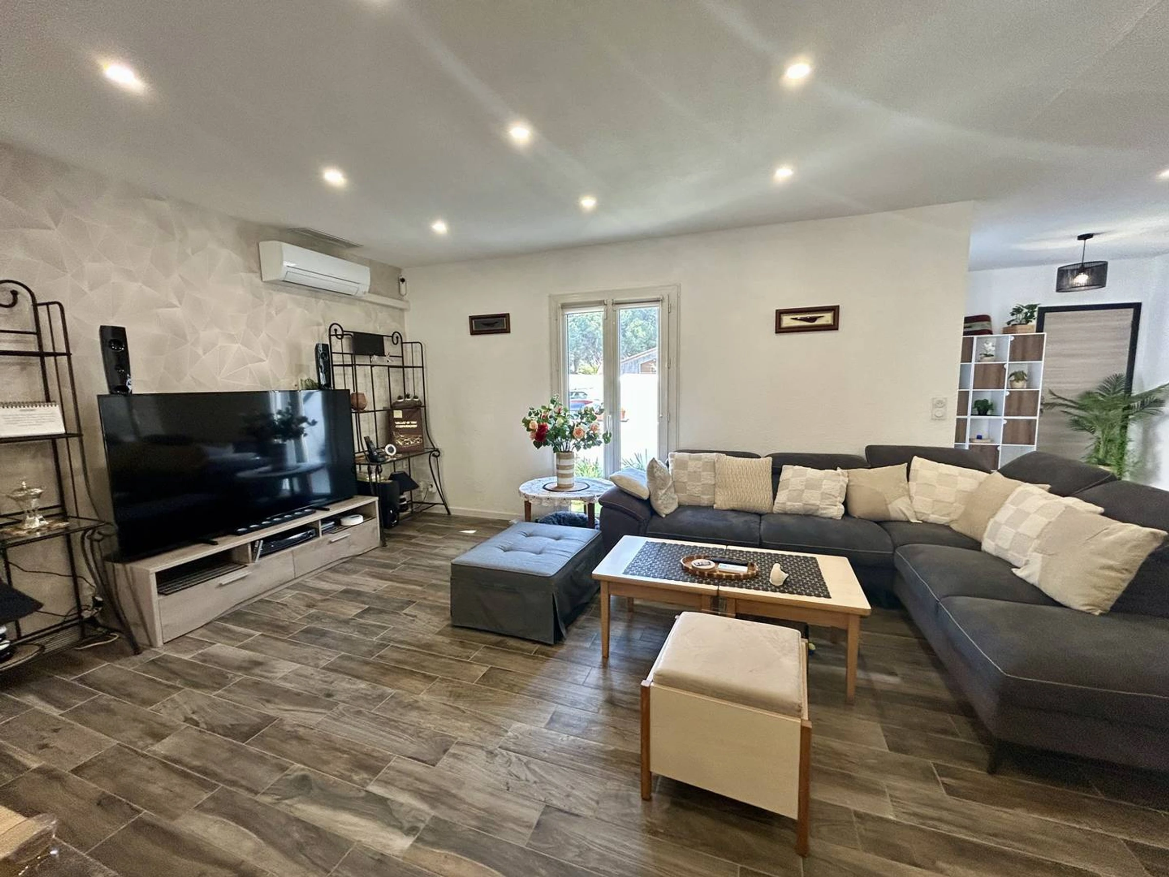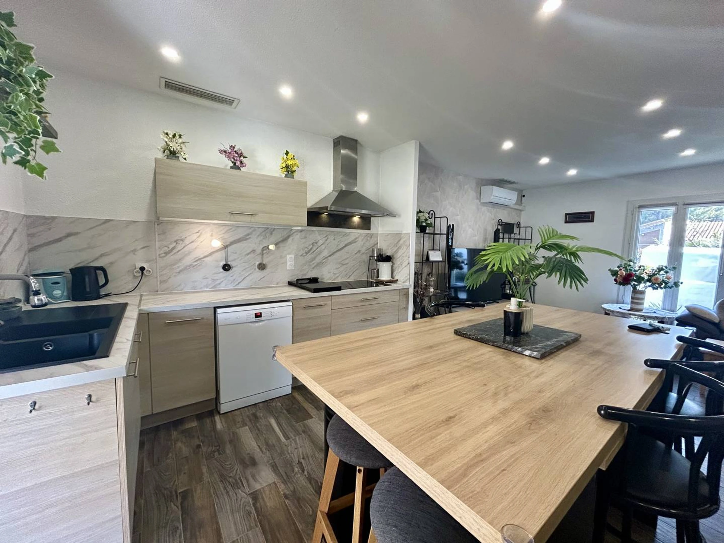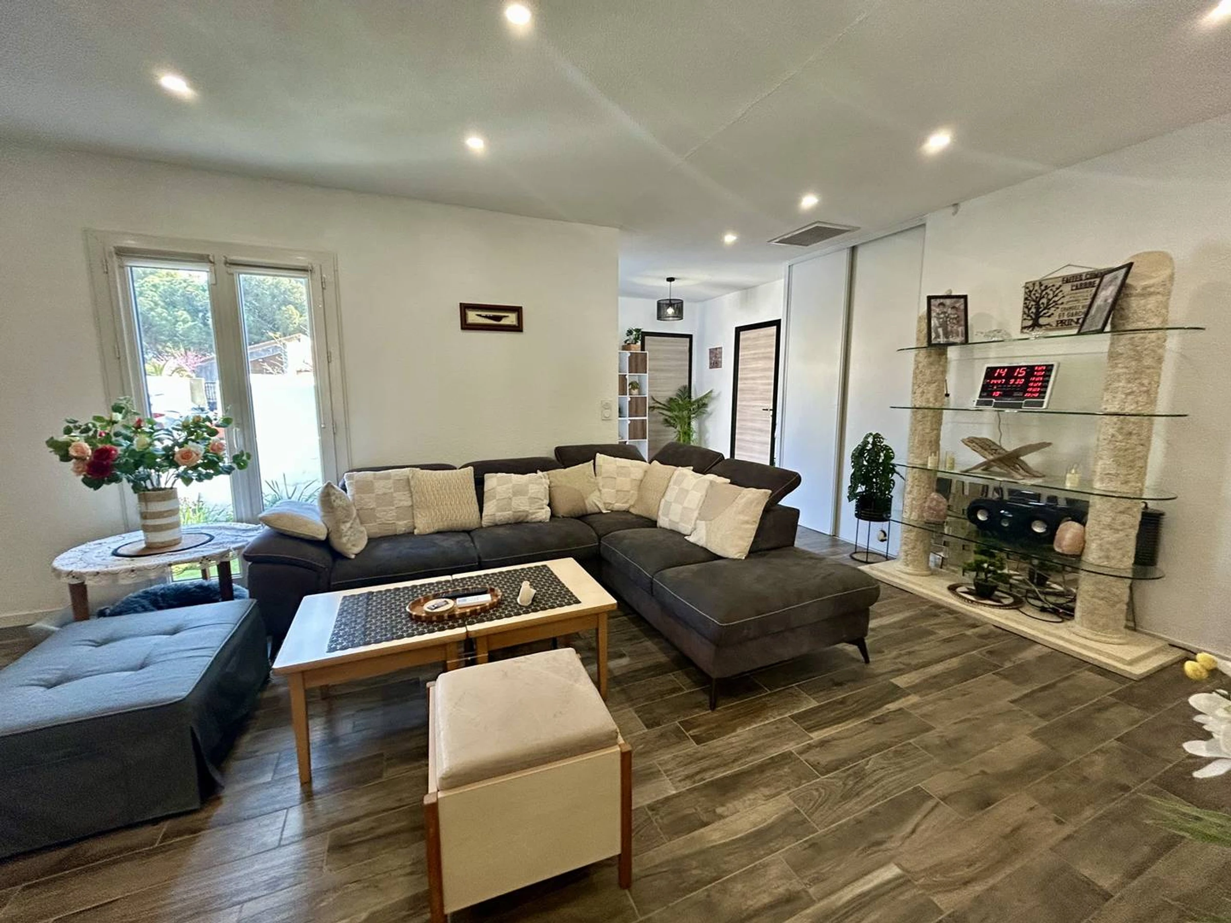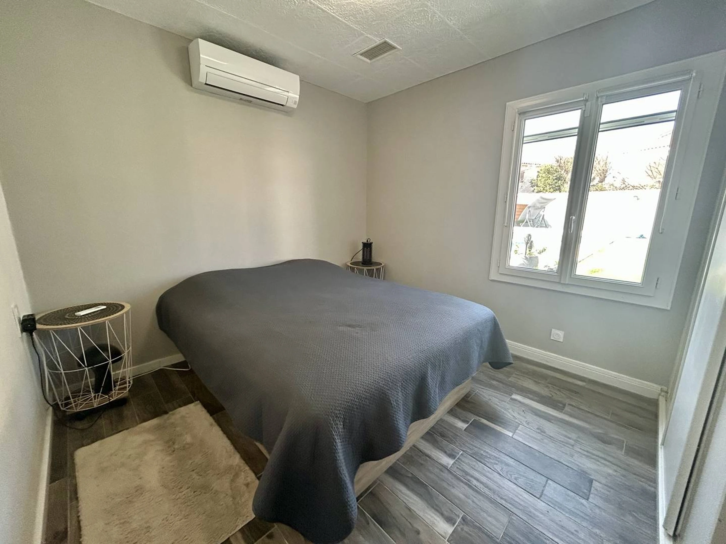Notre maison de vacances, climatisée, de plain pied comprend, un séjour avec un grand espace cuisine bien équipée, un salon climatisé, avec grand canapé et grand écran plat, un lit simple d'appoint pour enfant. La partie nuit comprend une chambre avec un lit double en 160, et une seconde chambre avec deux lits en 140 superposés, une salle d'eau avec douche et WC, un deuxième WC indépendant.