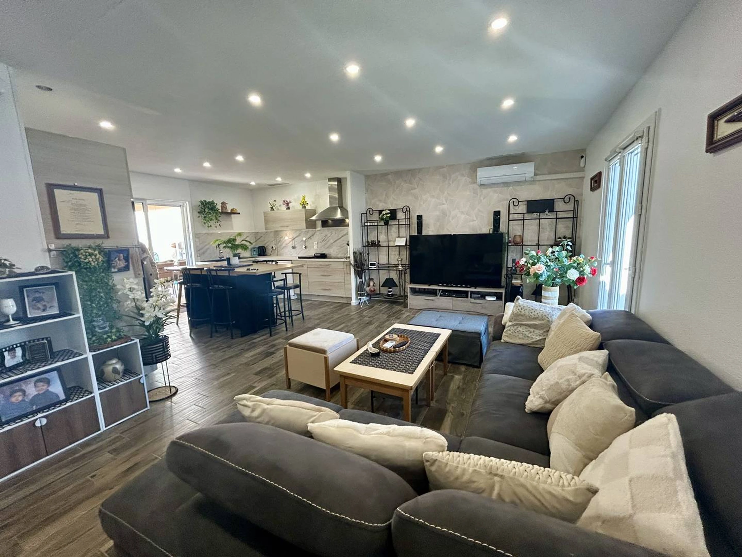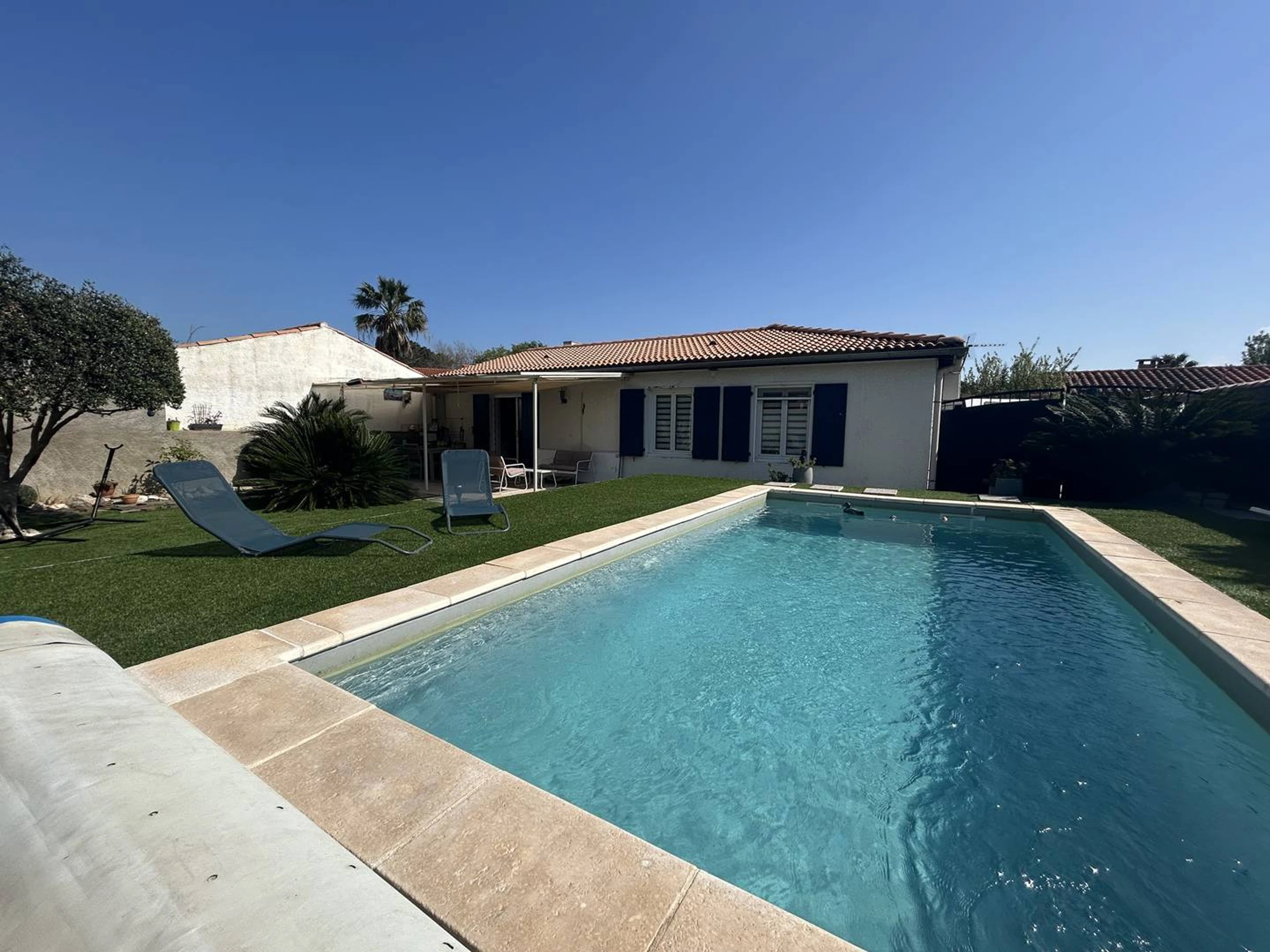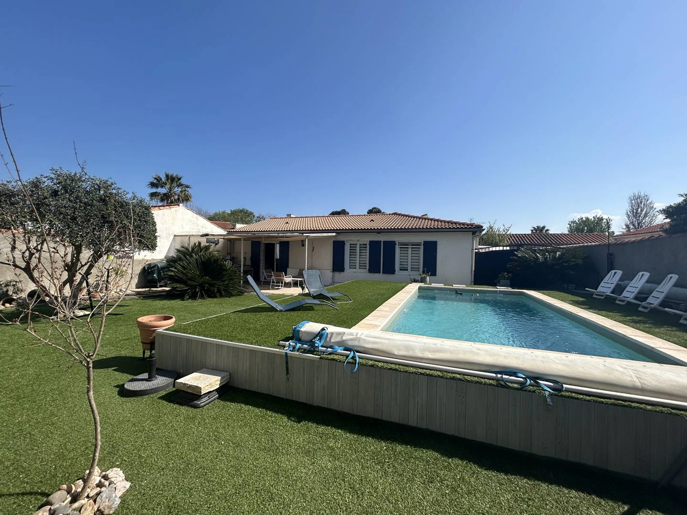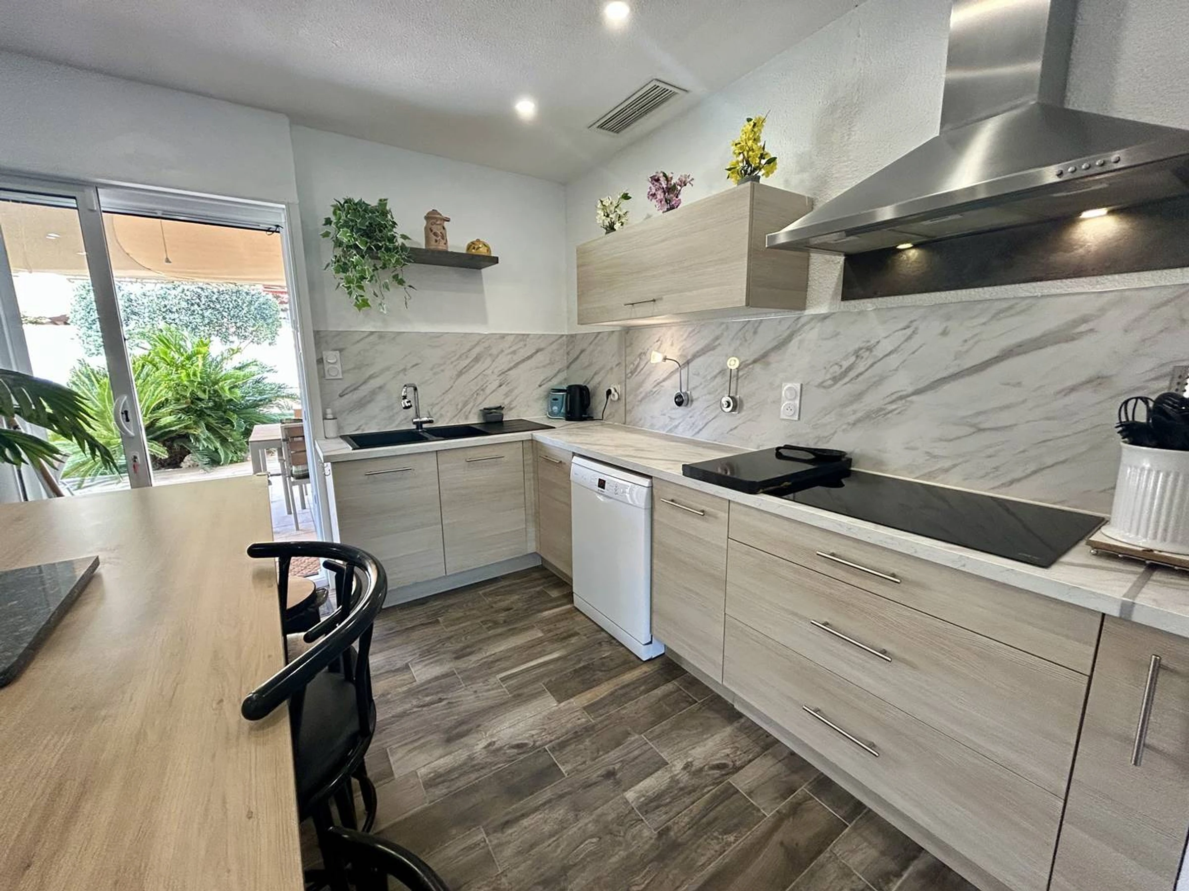 Notre maison de vacances, climatisée, de plain pied comprend, un séjour avec un grand espace cuisine bien équipée, un salon climatisé, avec grand canapé et grand écran plat, un lit simple d'appoint pour enfant. La partie nuit comprend une chambre avec un lit double en 160, et une seconde chambre avec deux lits en 140 superposés, une salle d'eau avec douche et WC, un deuxième WC indépendant.