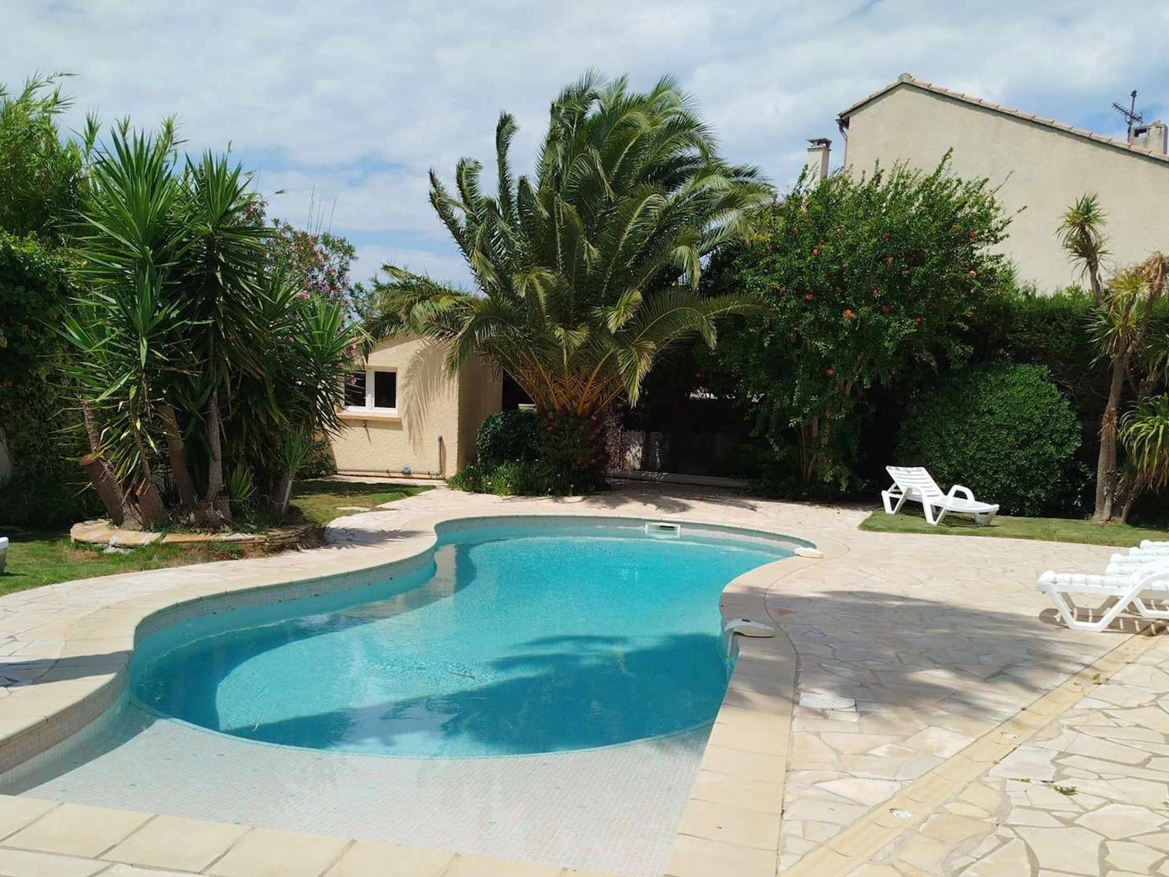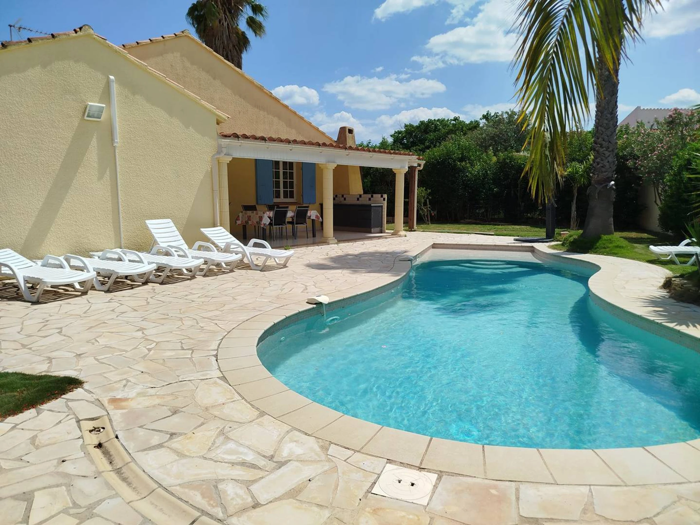 This beautiful single-storey house is surrounded on all sides by 720 square metres of land and features a private heated swimming pool. This property can accommodate 6 to 8 people with its 3 large and bright bedrooms. (Bedroom 1: 140 cm bed; Bedroom 2: 140 cm bed; Bedroom 3: 2 90 cm beds)