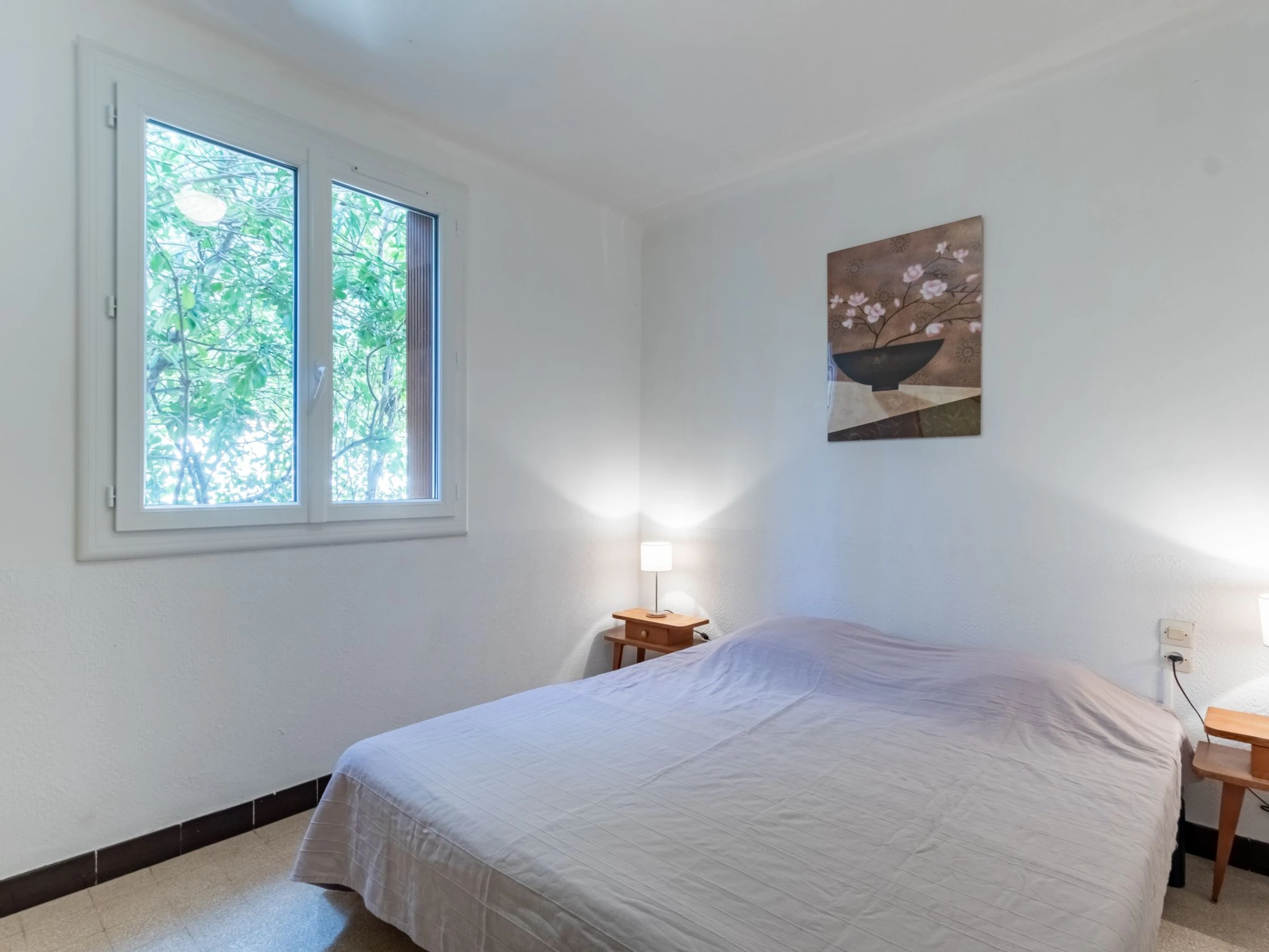2-room apartment 38 m2, on the ground floor. Simple and practical furnishings: living/dining room with 1 bed (80 cm, length 190 cm), TV (flat screen). Exit to the terrace. 1 room with 2 beds (80 cm, length 190 cm). Kitchenette (2 hot plates, kettle, microwave, electric coffee machine). Shower, sep. WC. No heating option. Terrace 6 m2, north-west facing position. Terrace furniture. Facilities: Internet (WiFi, extra). Parking (1 car). Please note: not suitable for children under 3 years. TV only FR. Smoke alarm. [hidden]