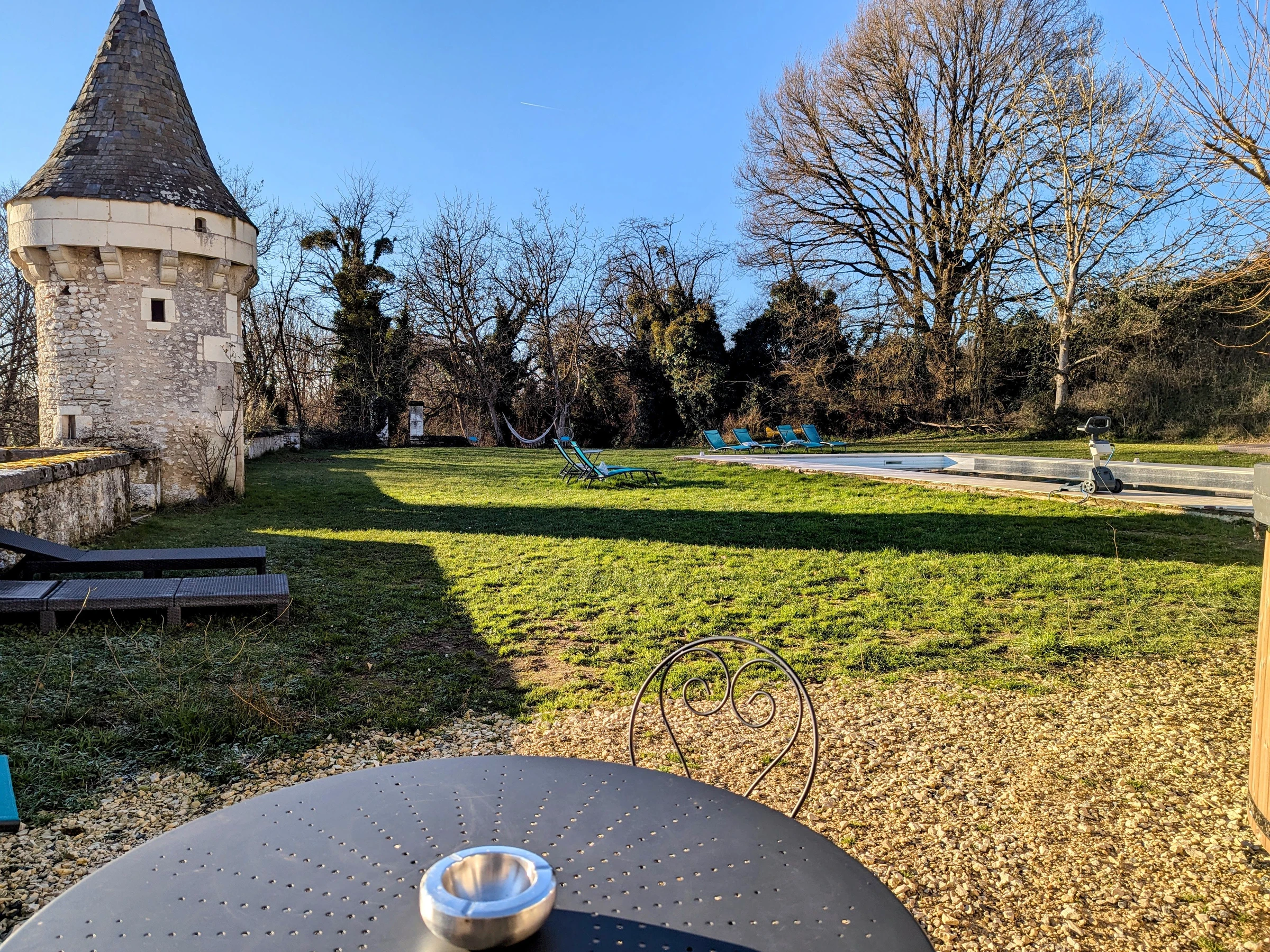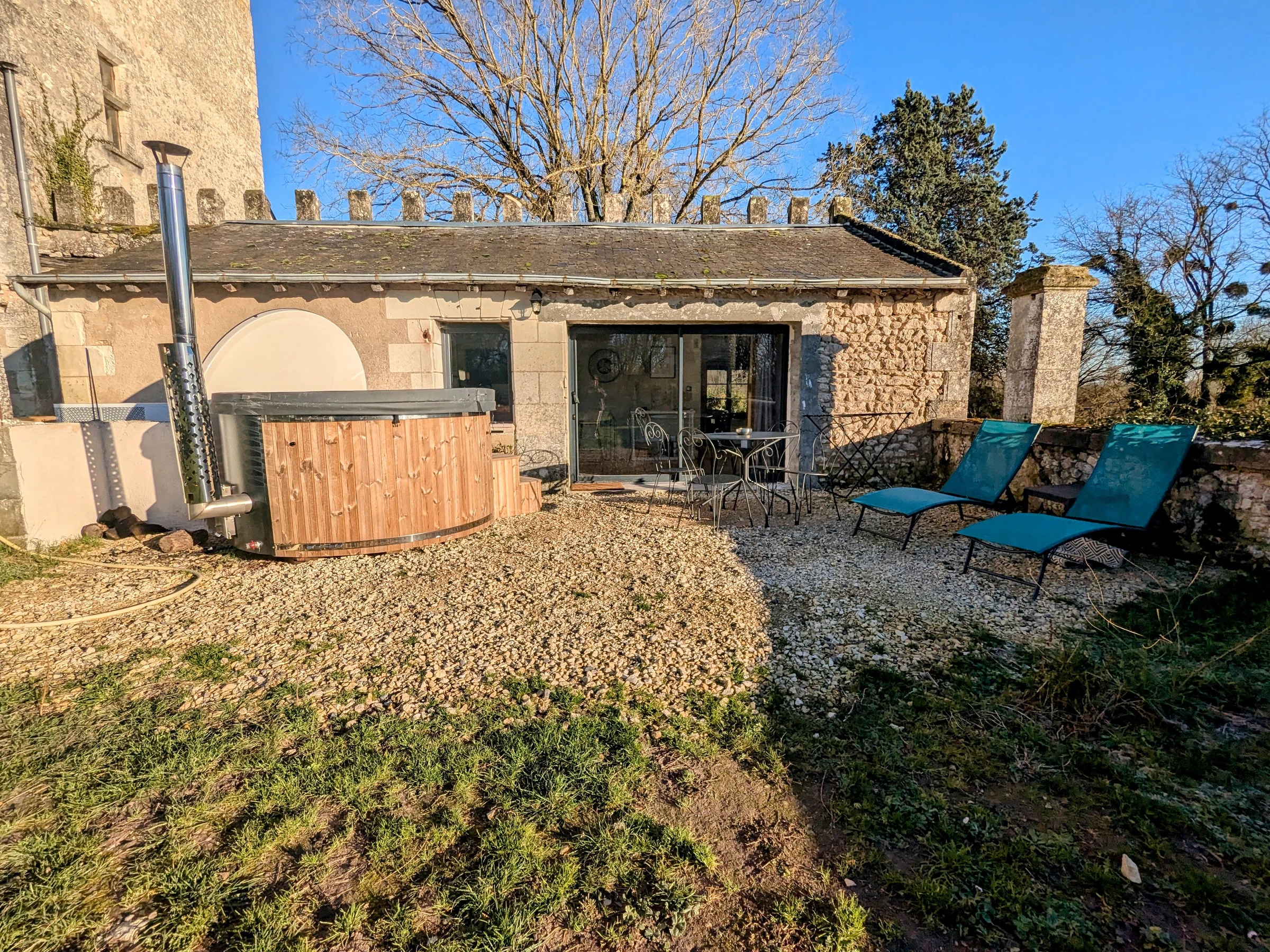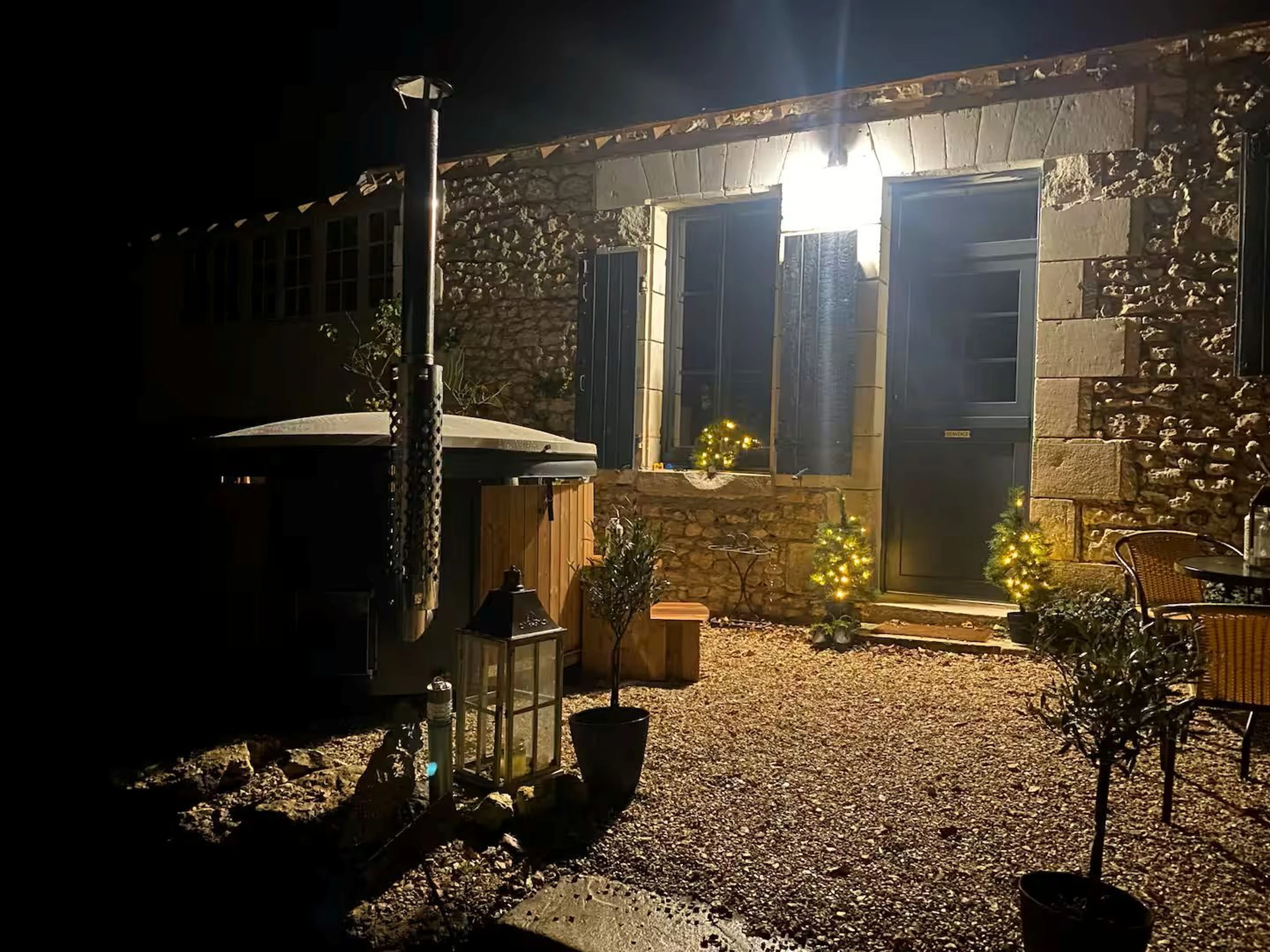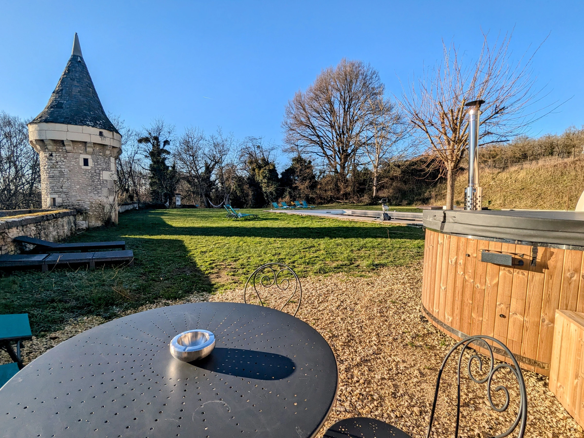 Shared with the owners and two other gîtes, there's a heated swimming pool, a spa, and a lounge area equipped with a fire pit.