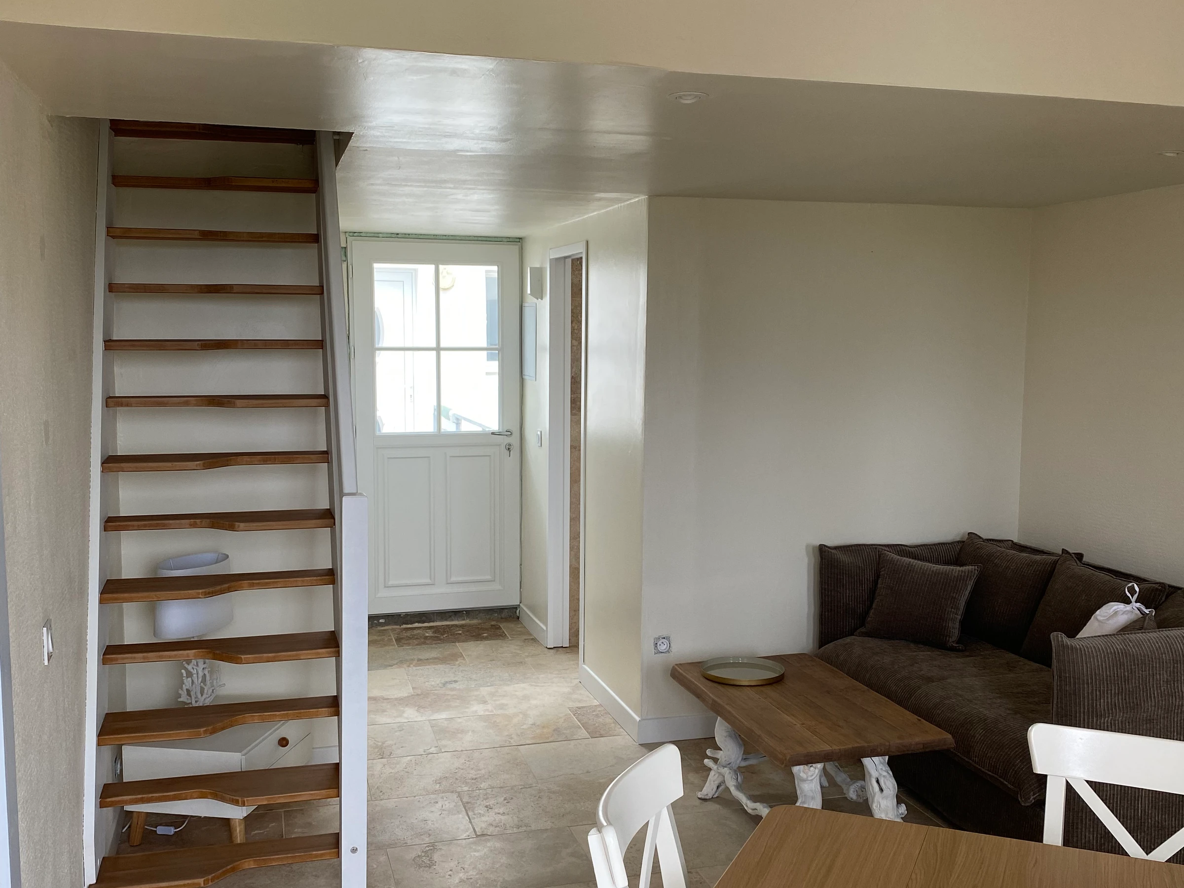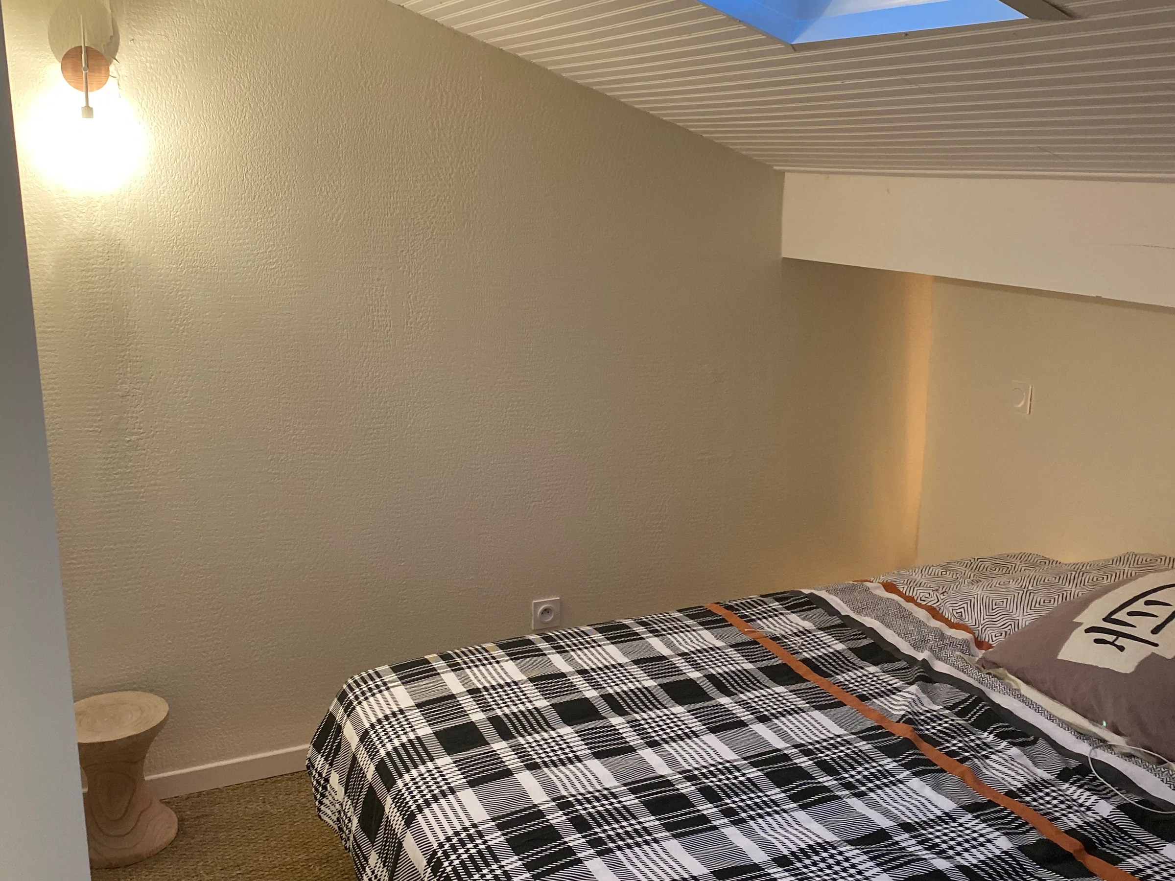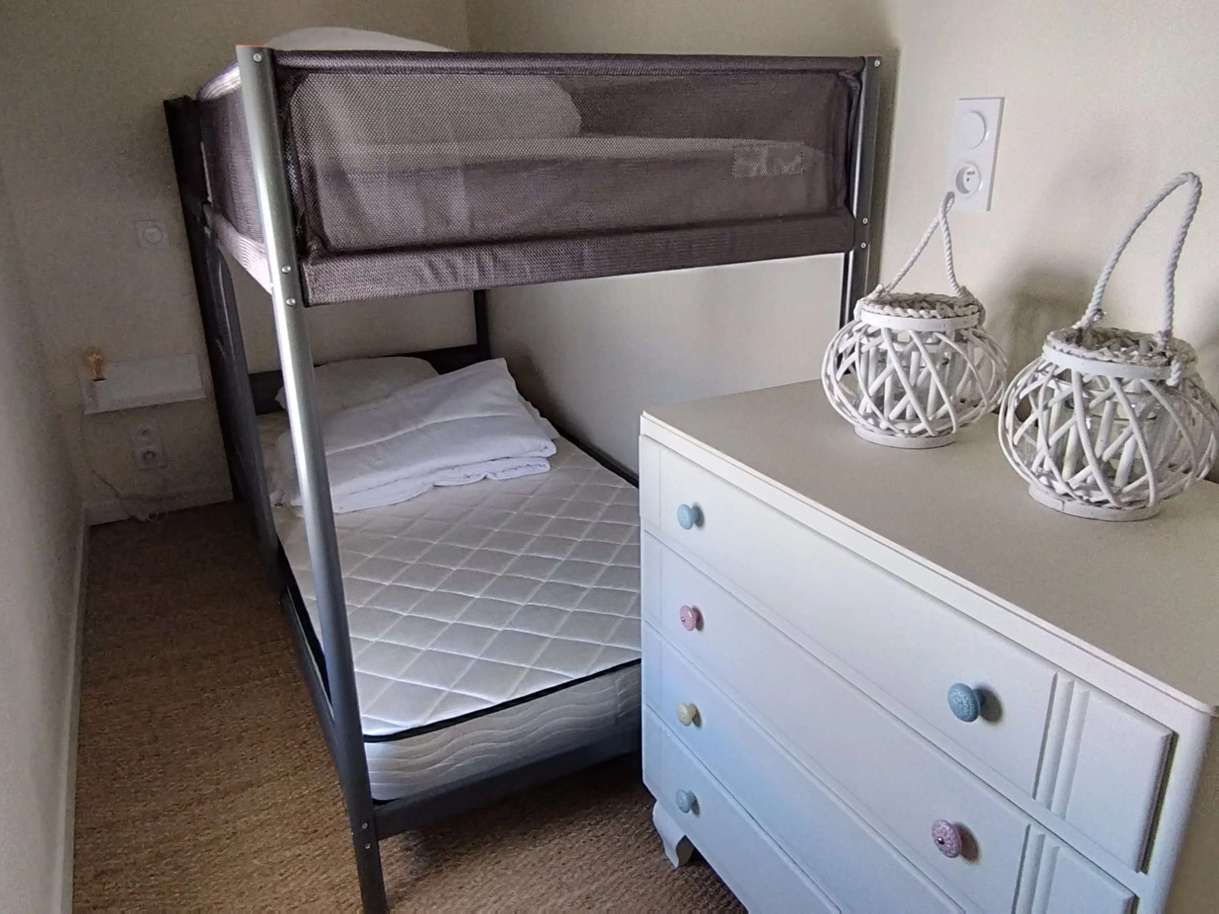 Just steps from the beach, discover this small first-floor apartment in a residence with private parking. It includes a living/dining room/fully equipped kitchen, a bathroom with a toilet and washing machine. Upstairs, there is a first bedroom with a double bed, and a second bedroom with a twin bunk bed. There is a small balcony with garden furniture.