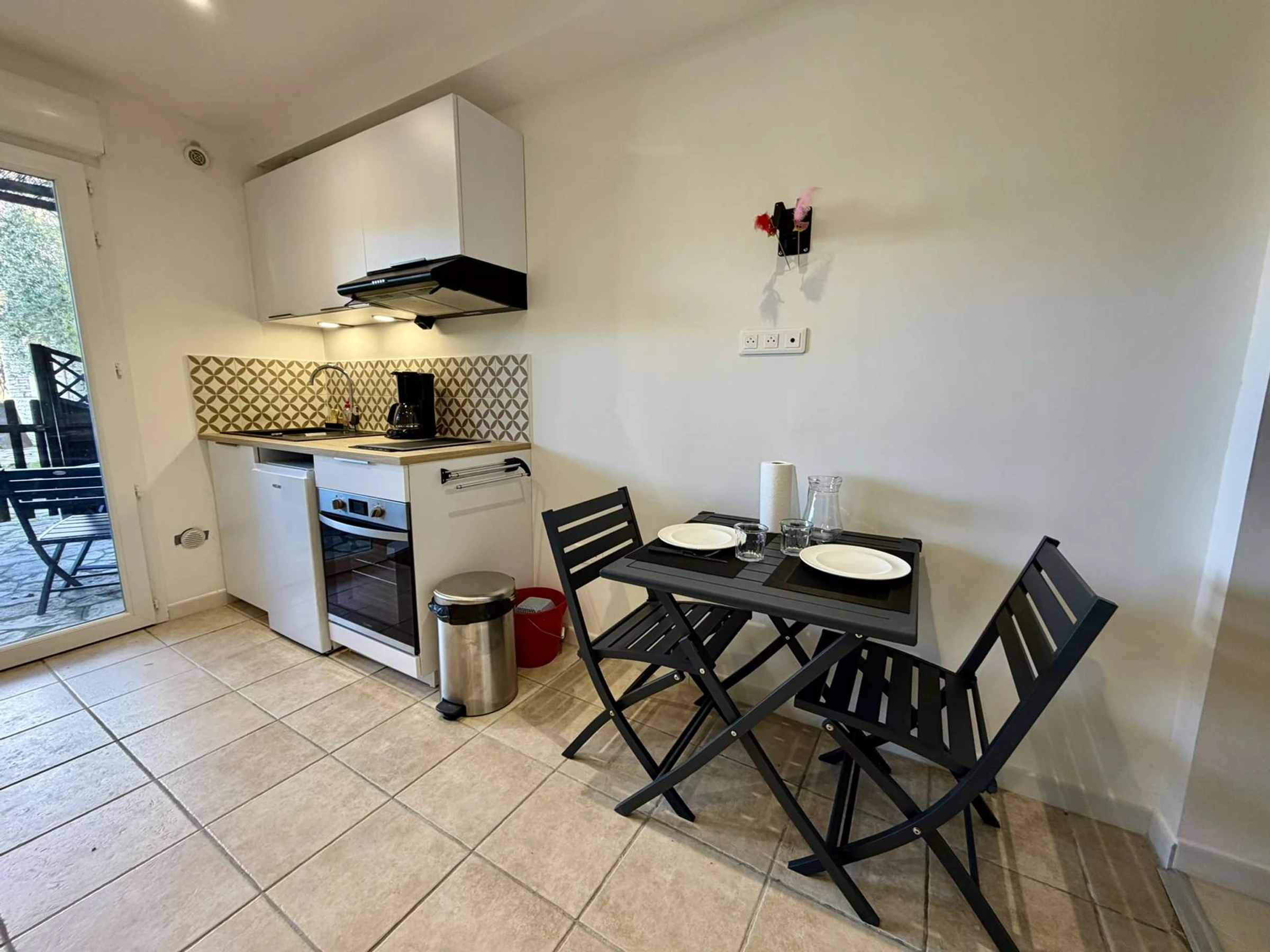 Le studio comprend une pièce de vie climatisée avec lit et TV, un coin cuisine/repas pour 2 équipé d'un frigo, micro-ondes, plaque de cuisson, cafetière, bouilloire et grille-pain.