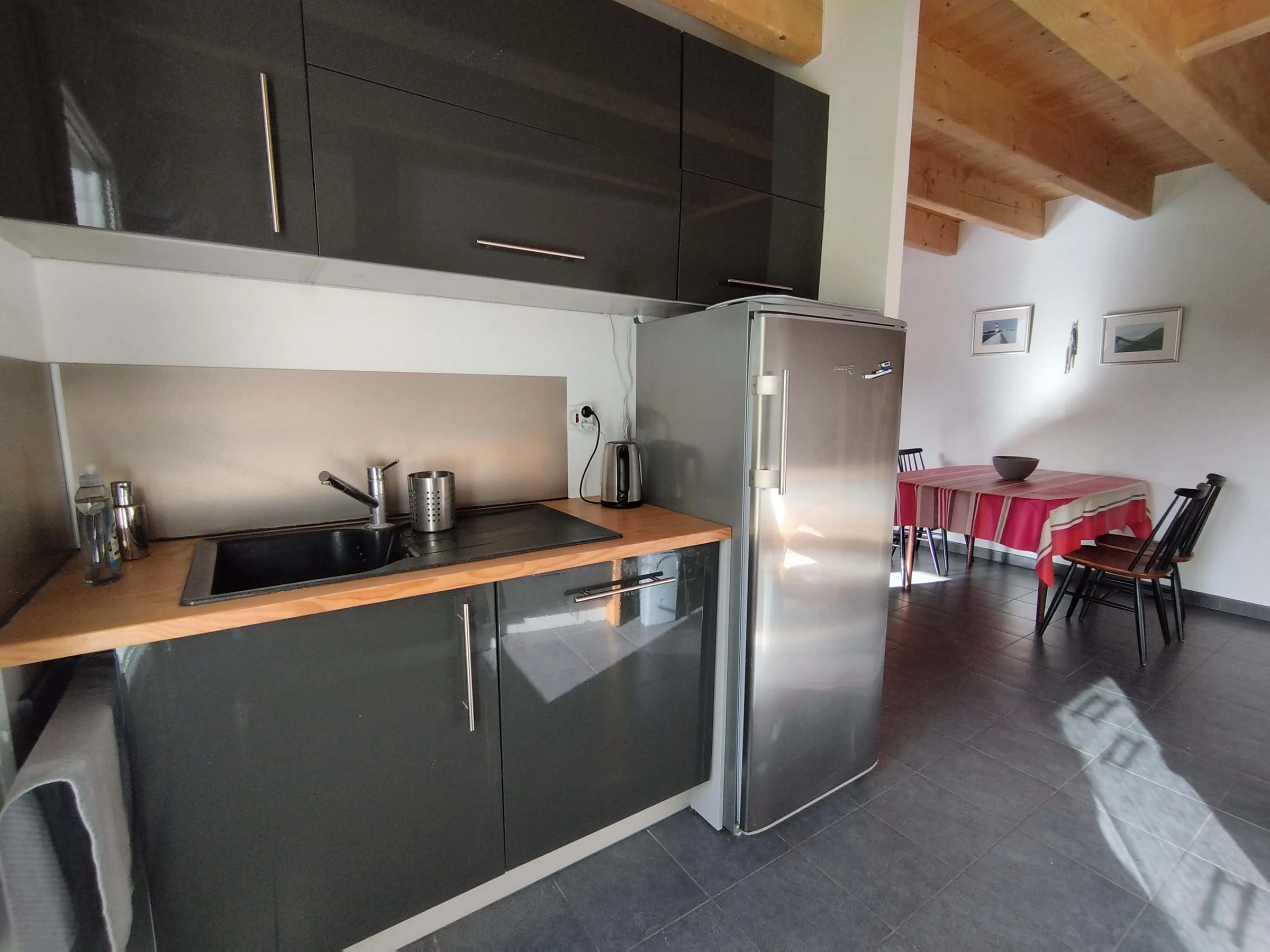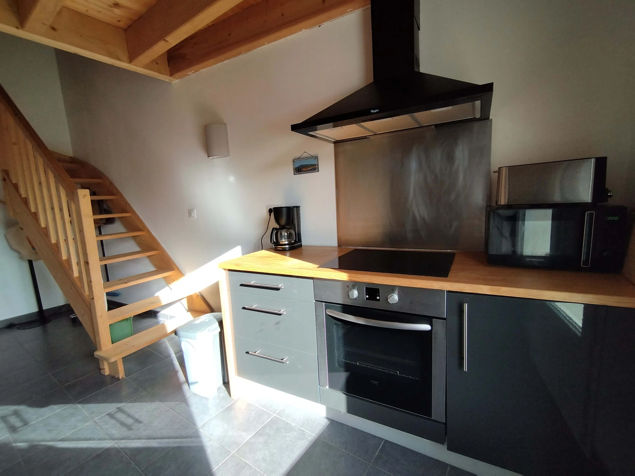 - Living Room and Kitchen: A bright and welcoming living space with a fully equipped kitchen, including a refrigerator, hob, oven, microwave, dishwasher, and coffee maker, ideal for preparing family meals.