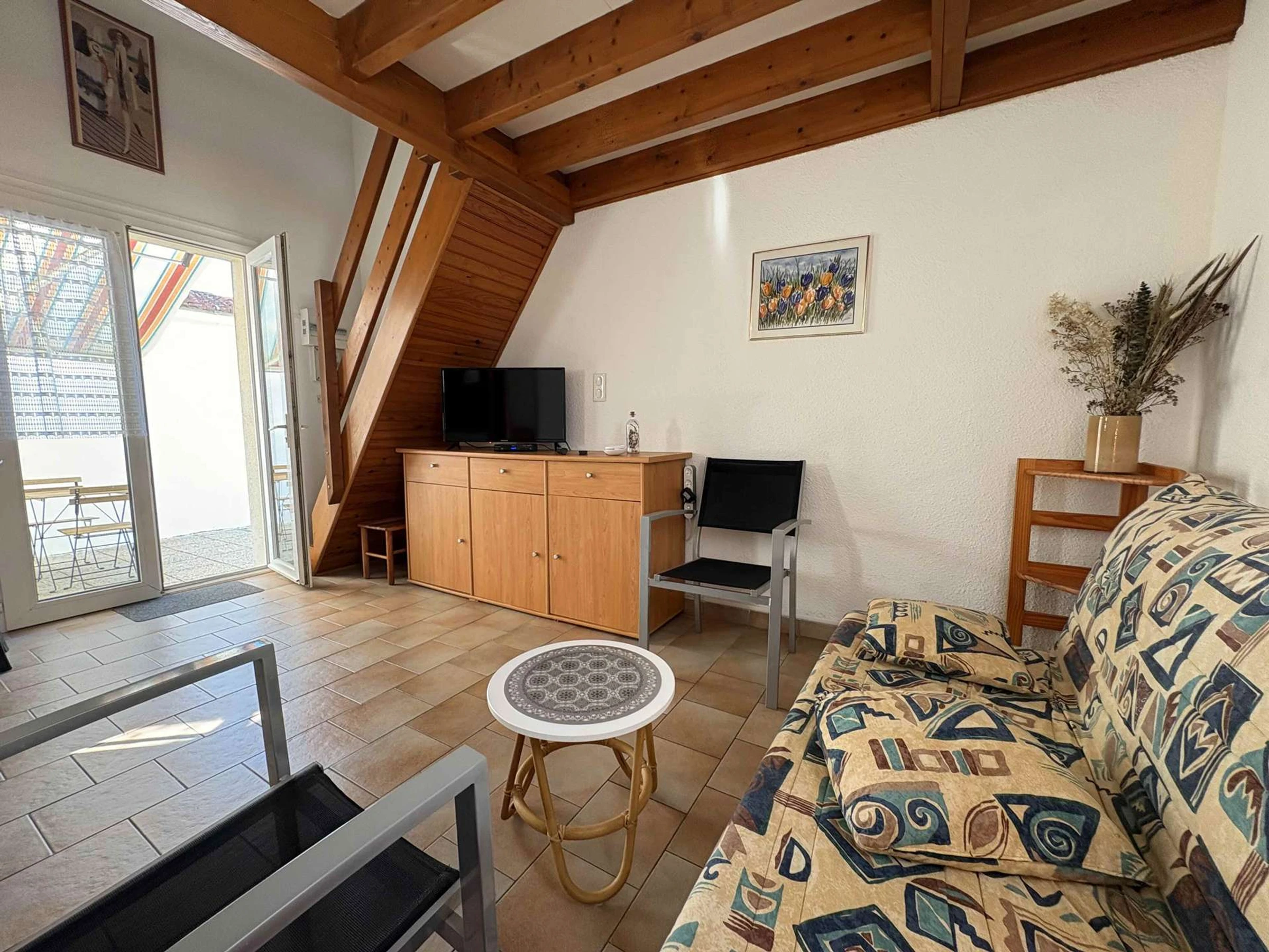 Jolie maison de vacances dans une résidence familiale à deux pas de la plage et de la place du marché de Domino se composant d’une pièce de vie avec canapé et TV ouverte sur une cuisine équipée et aménagée, d'une salle d'eau, WC indépendant.