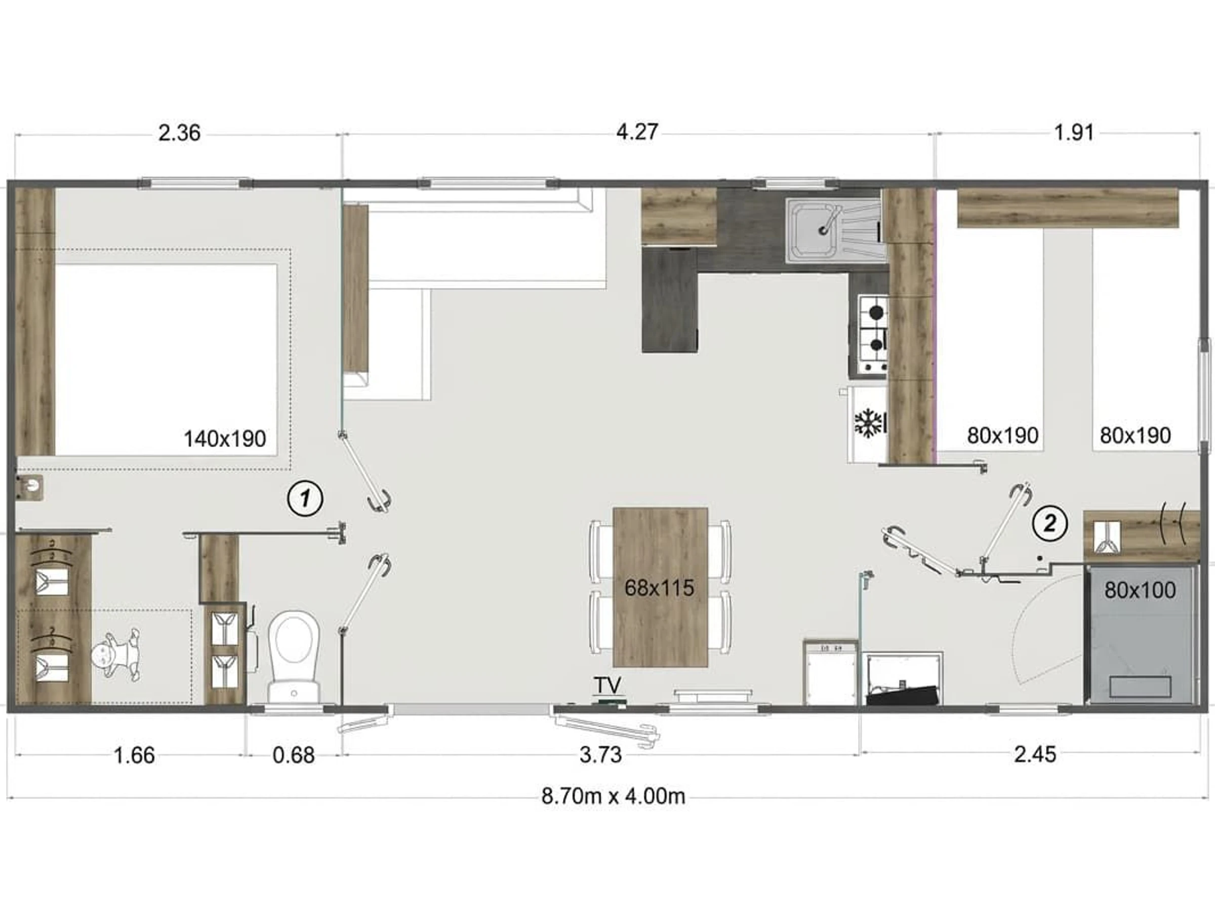 35m² mobile home for 4 people: