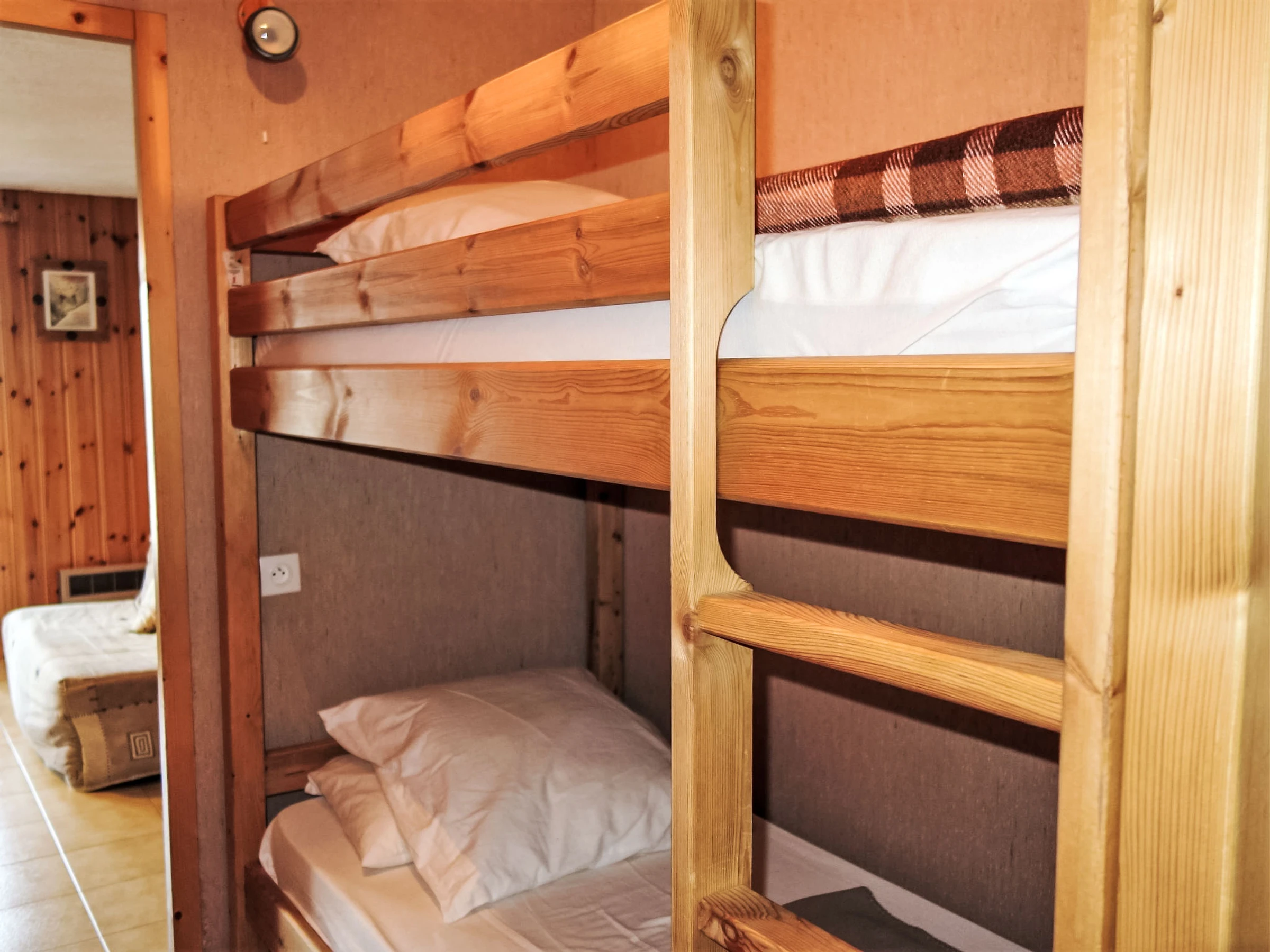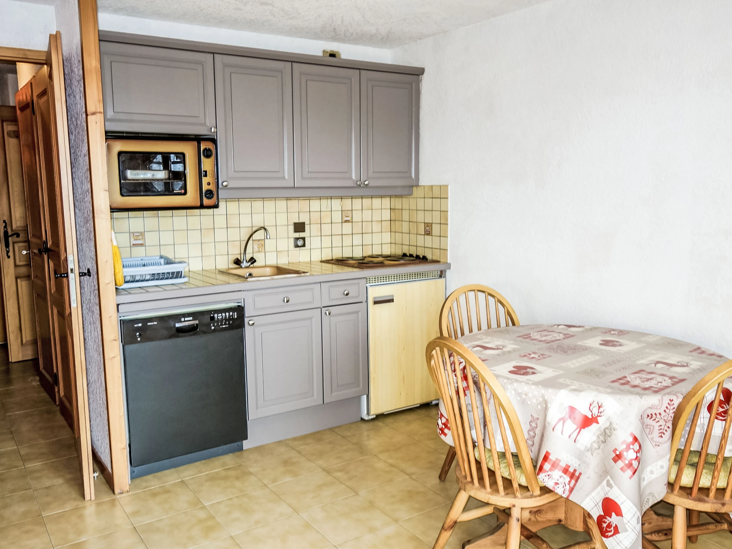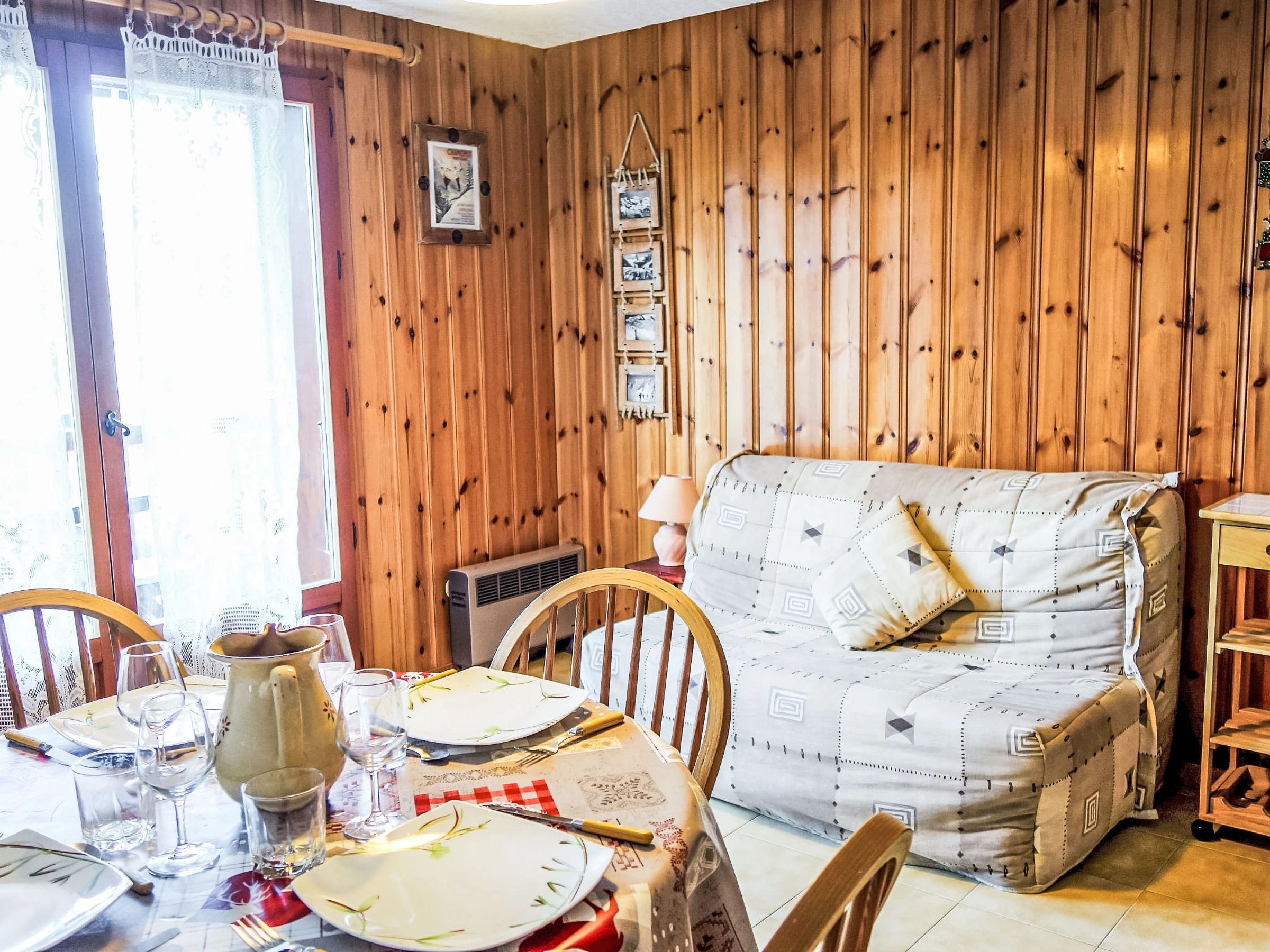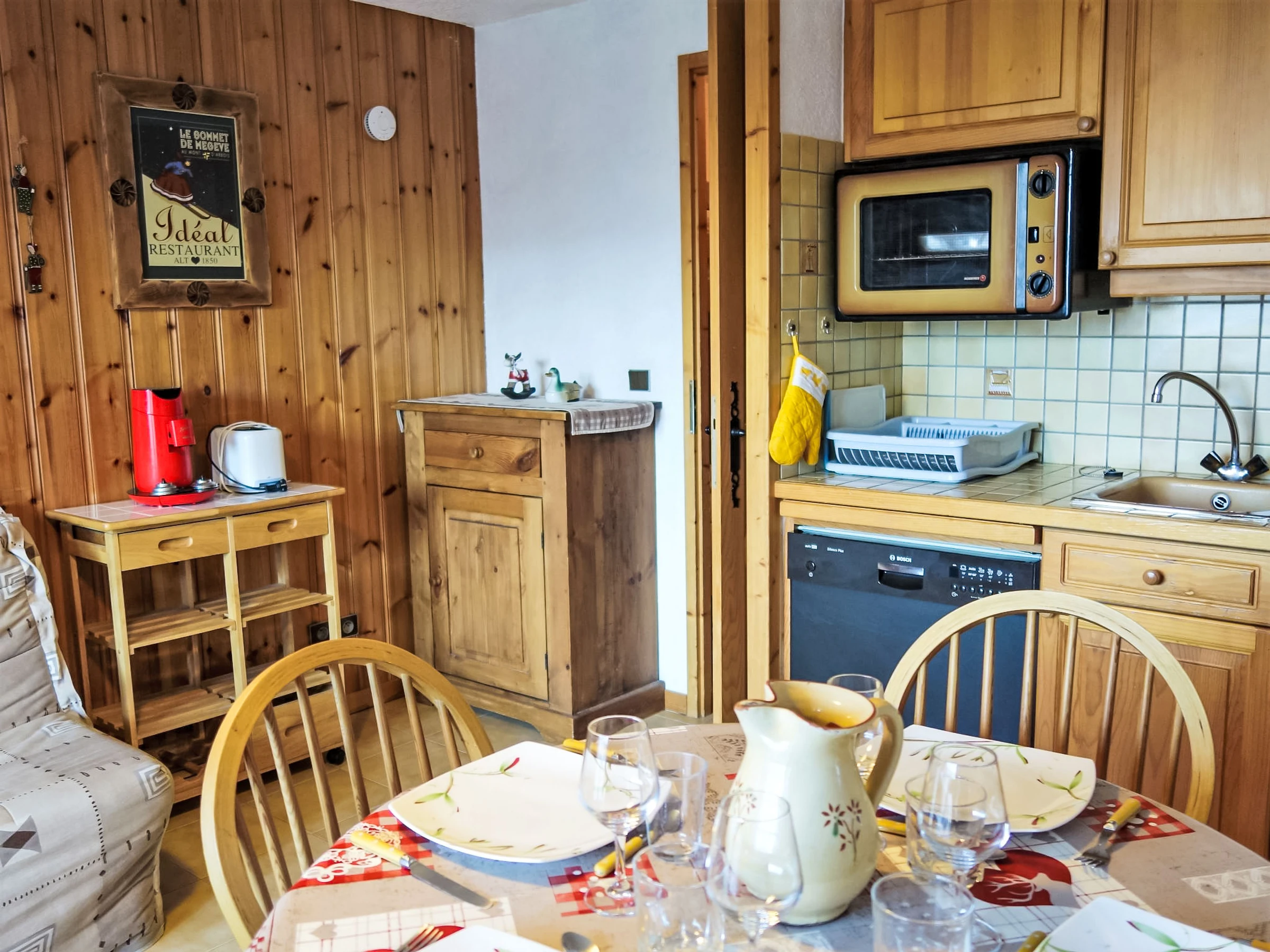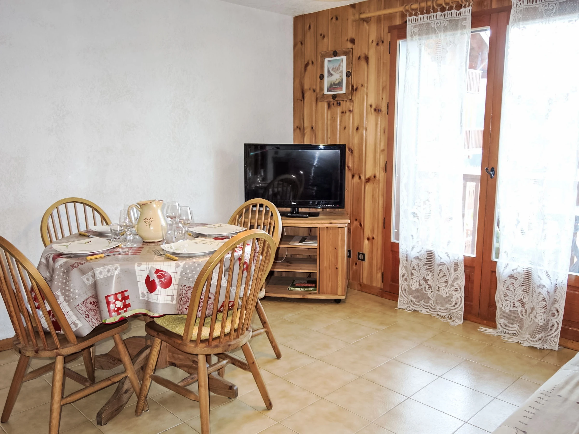 "La pointe des Aravis 4", 1-room studio 23 m2 on 3rd floor. Living/dining room with 1 double sofabed (135 cm), TV and flat screen. Exit to the balcony. Entrance hall with 1 x 2 bunk beds (90 cm). Kitchenette (oven, dishwasher, toaster, kettle, electric coffee machine). Bathroom, sep. WC. Electric heating. Balcony, west facing position. Beautiful view of the mountains and the valley. Facilities: washing machine. Internet (WiFi, extra). Parking. Please note: non-smokers only. TV only FR. Smoke alarm, no lift.