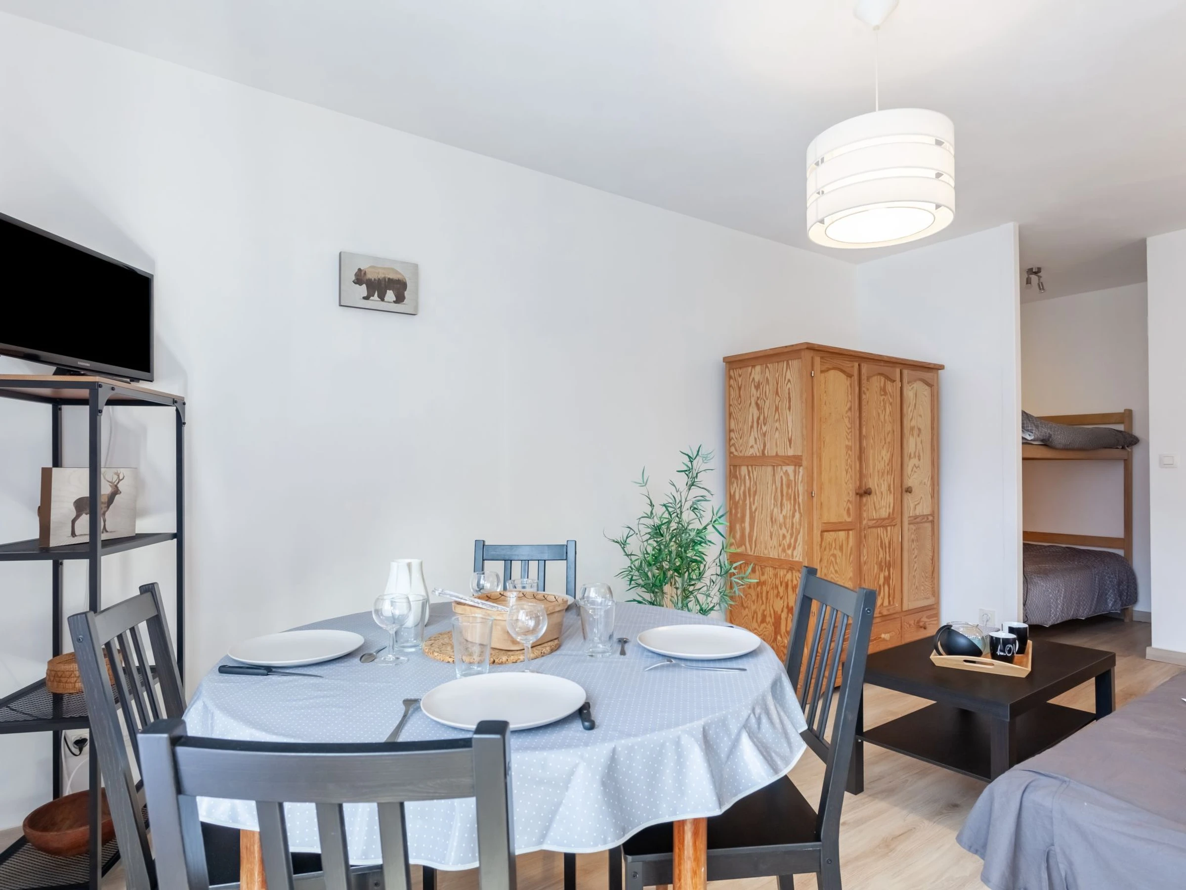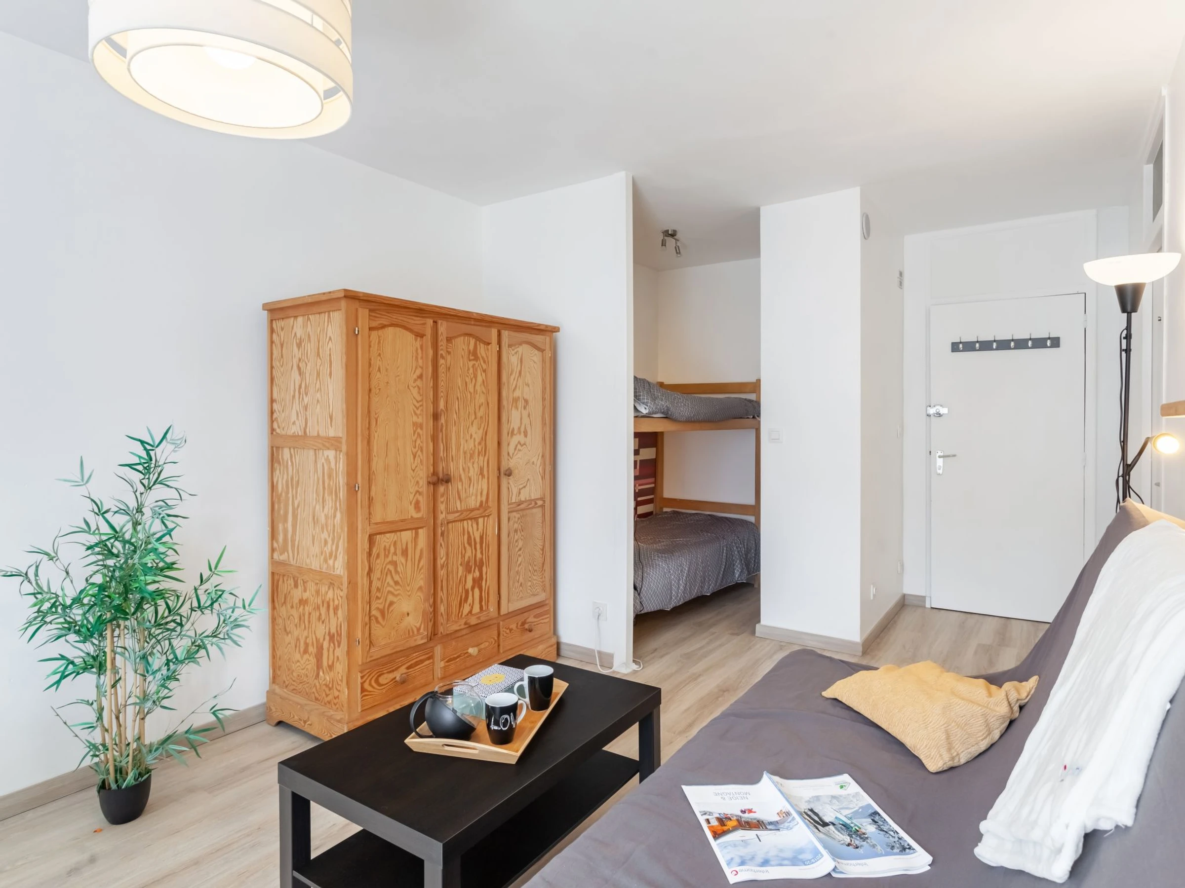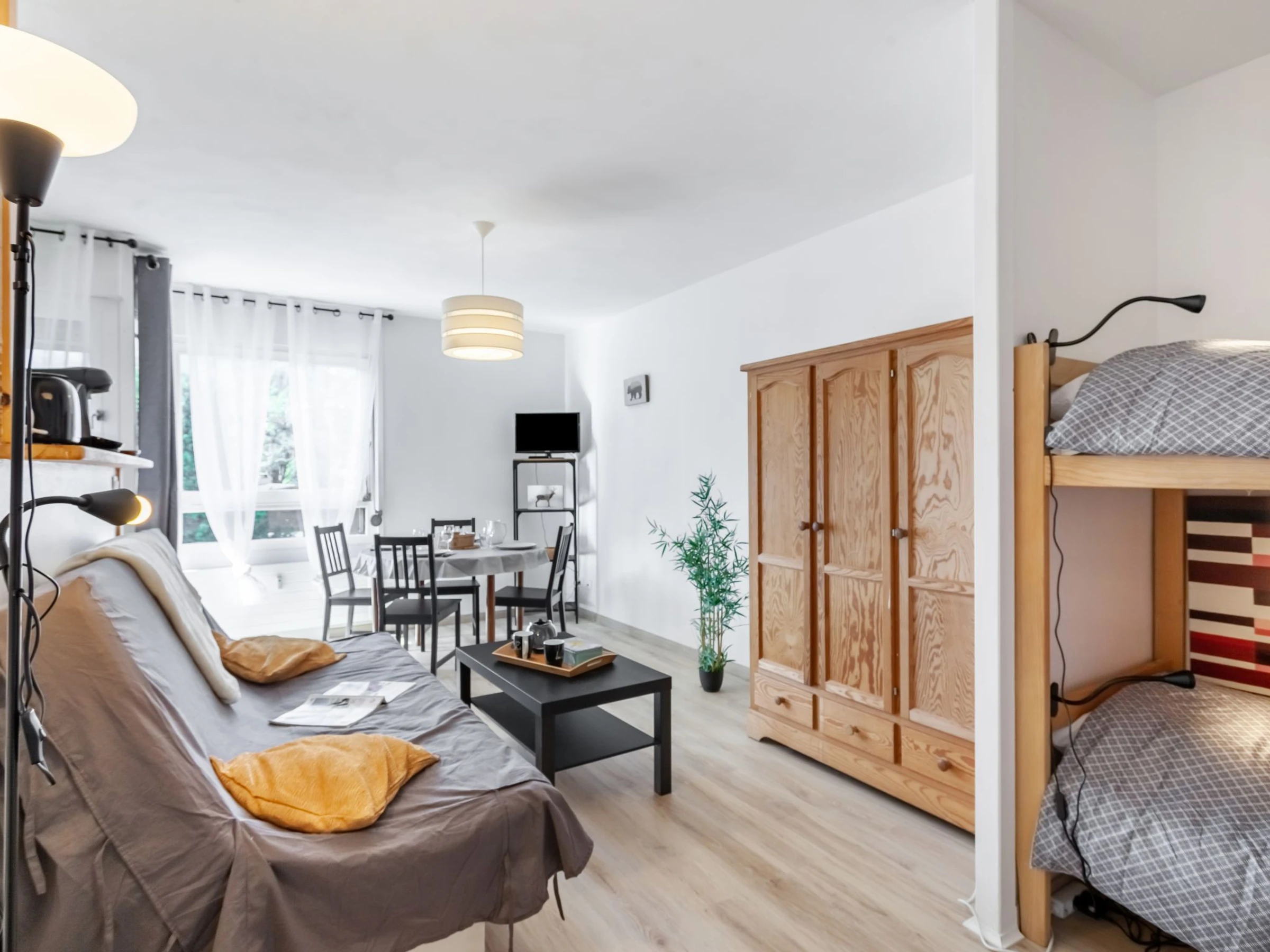 "Castel des roches A36", 1-room studio 20 m2 on 3rd floor. Living/dining room with 1 sofabed (140 cm, length 190 cm), dining table and TV (flat screen). Exit to the balcony. Alcove with 1 x 2 bunk beds (80 cm, length 190 cm). Open kitchen (4 ceramic glass hob hotplates, toaster, kettle, electric coffee machine, combination microwave). Bath/WC. Heating. Small balcony 3 m2, south-west facing position. View of the mountains. Facilities: washing machine. Internet (WiFi, extra). Parking (1 car). Please note: TV only FR. Smoke alarm. Instead of an enclosed bedroom, some sleeping areas are located in an open-plan area (gallery, alcove, etc.). Offer by a private individual according to Art. 155, IV of CGI.