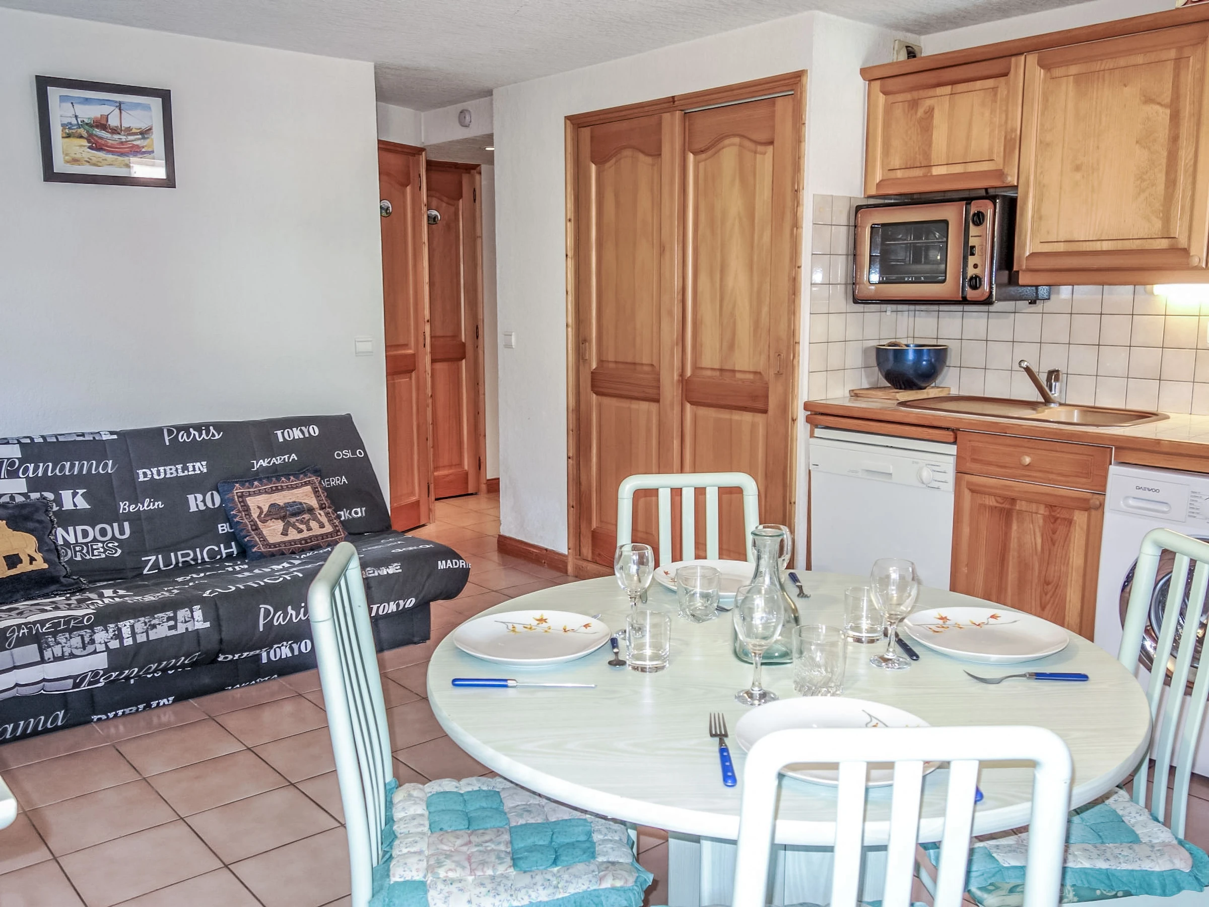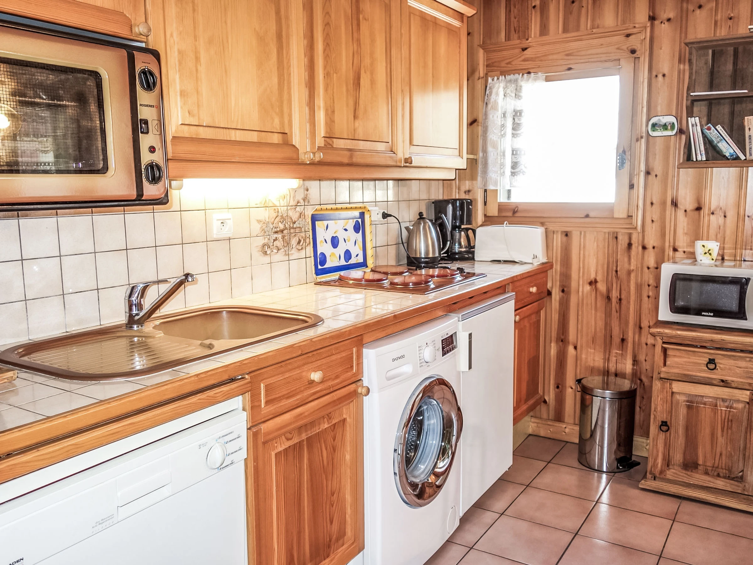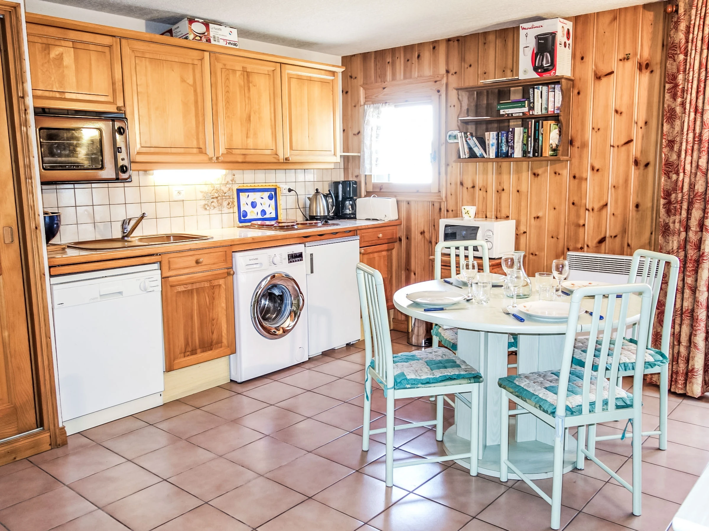"Jardins Alpins 4", 2-room apartment 28 m2 on 2nd floor. Entrance hall. Living/dining room with 1 double sofabed (135 cm), TV and flat screen. 1 room with 1 french bed (140 cm). Kitchenette (4 hot plates, oven, dishwasher, toaster, kettle, microwave, electric coffee machine, raclette grill). Bathroom, sep. WC. Electric heating. Balcony 10 m2. Balcony furniture. Facilities: washing machine. Internet (WiFi, extra). Garage. Please note: non-smokers only. TV only FR. Smoke alarm.