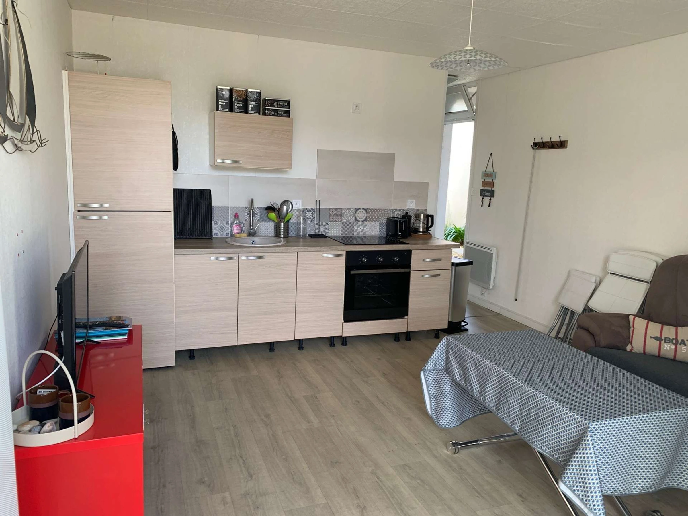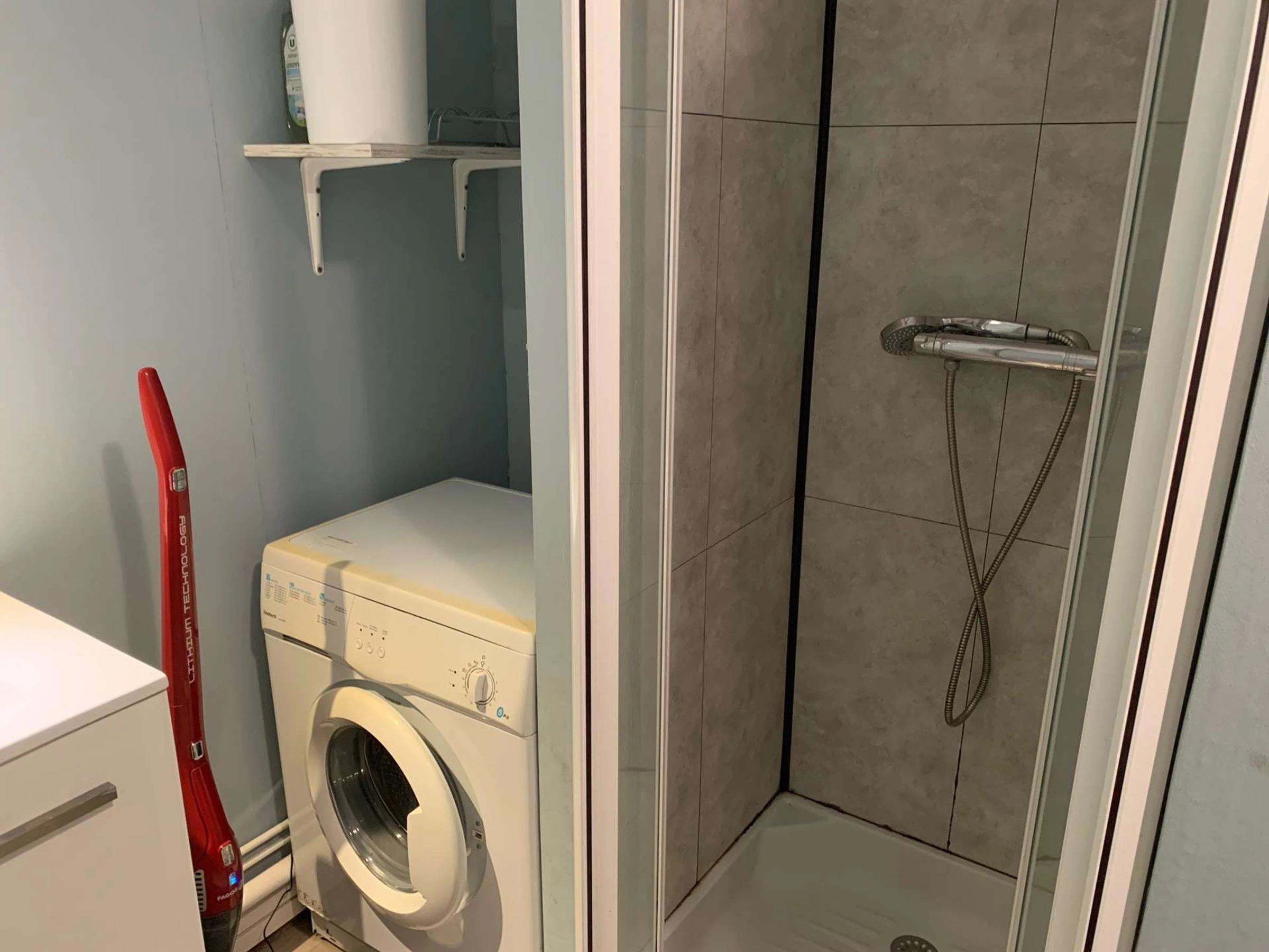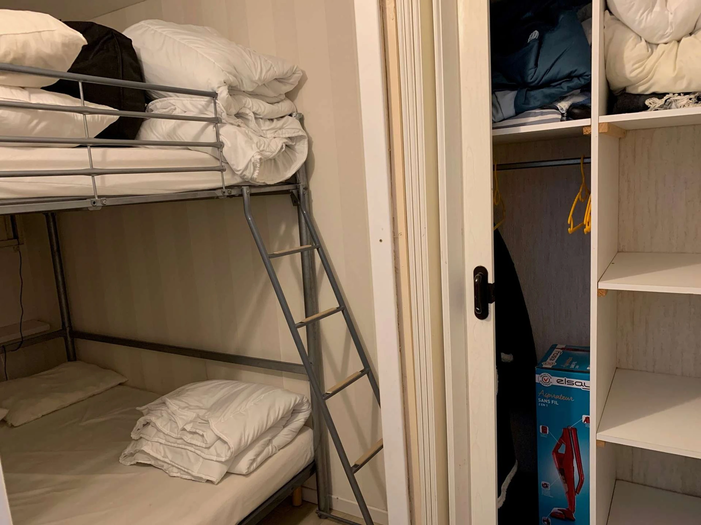 Une entrée avec un dégagement donnant sur une chambre avec un double lit 140 superposé et placard de rangement, un wc séparé, une salle d'eau avec une douche cabine, un meuble vasque et un lave-linge, une pièce de vie avec coin cuisine aménagée et équipée, salon-salle à manger et télévision, une loggia avec accès sur une terrasse fermée avec salon de jardin et store-banne.