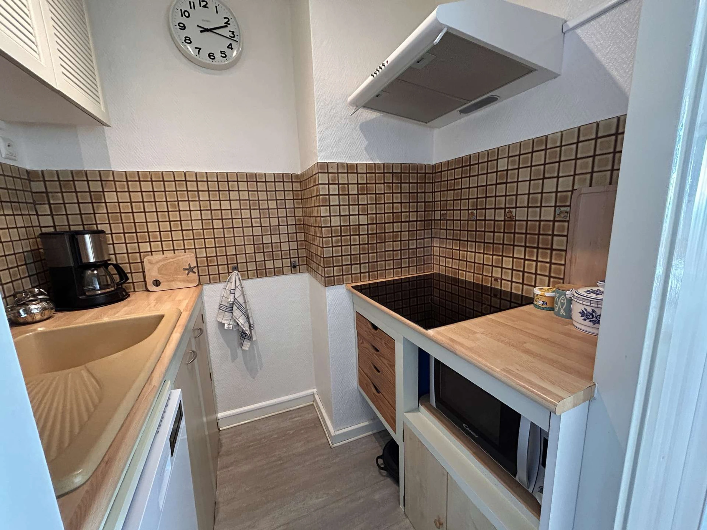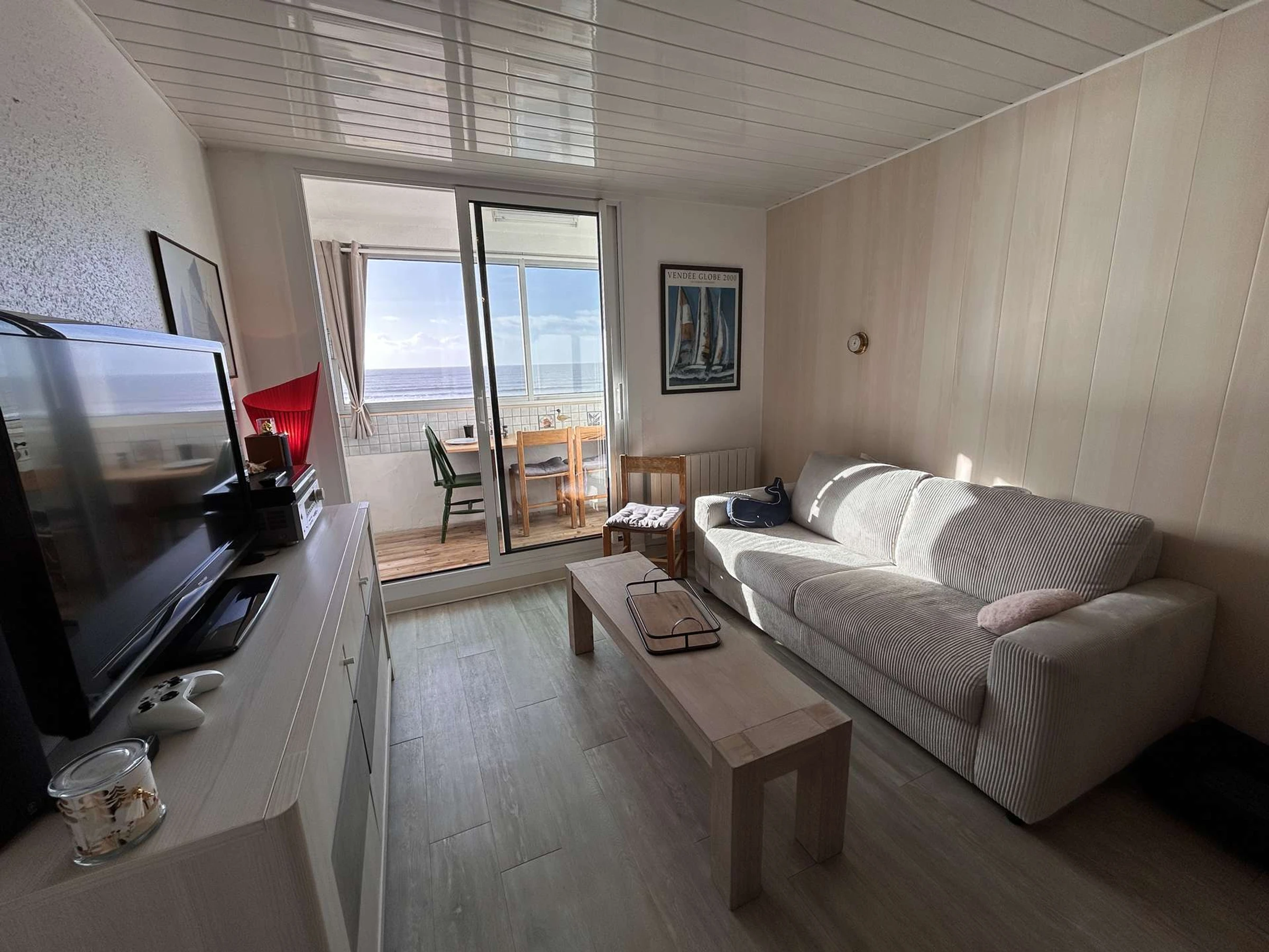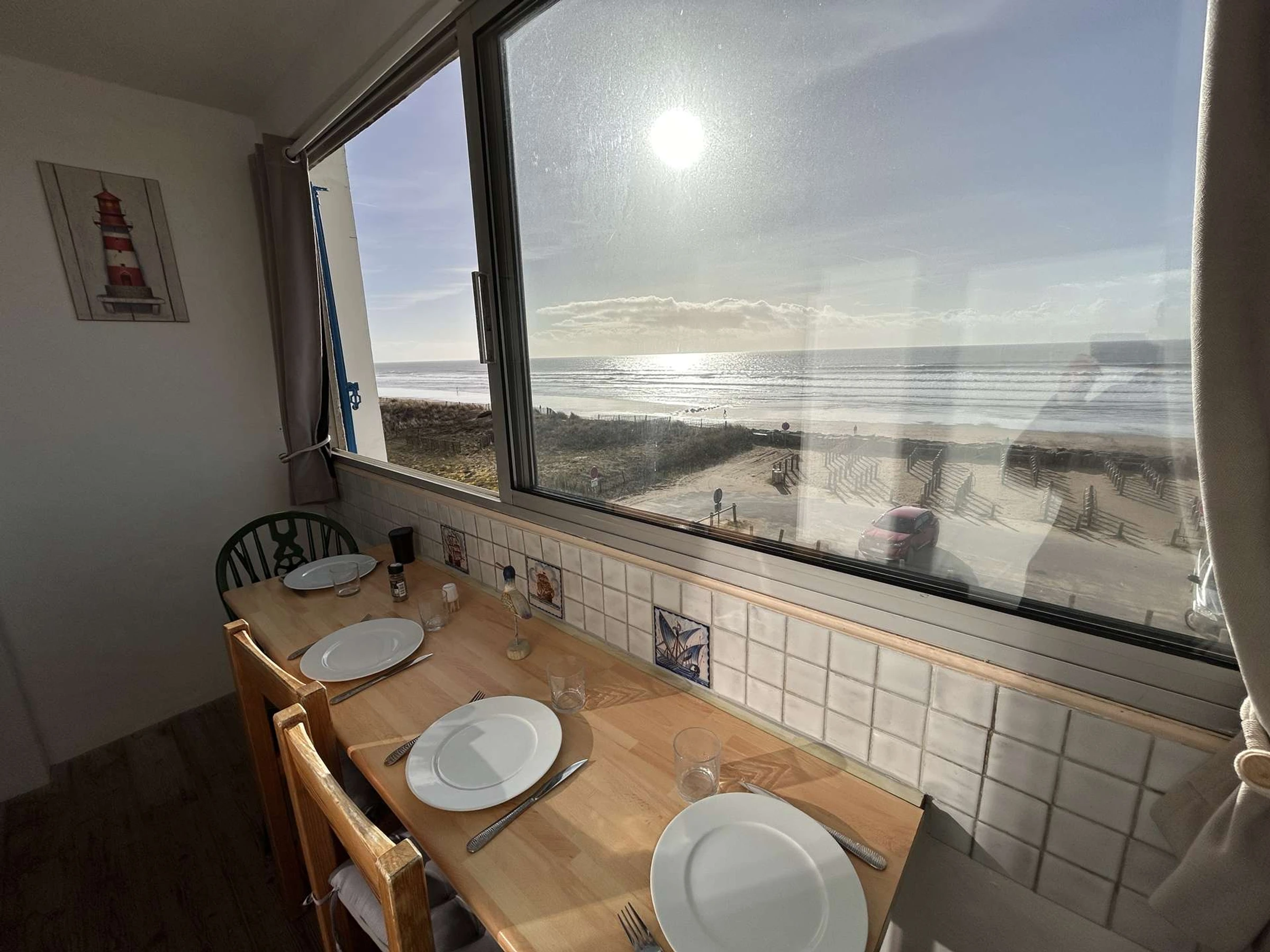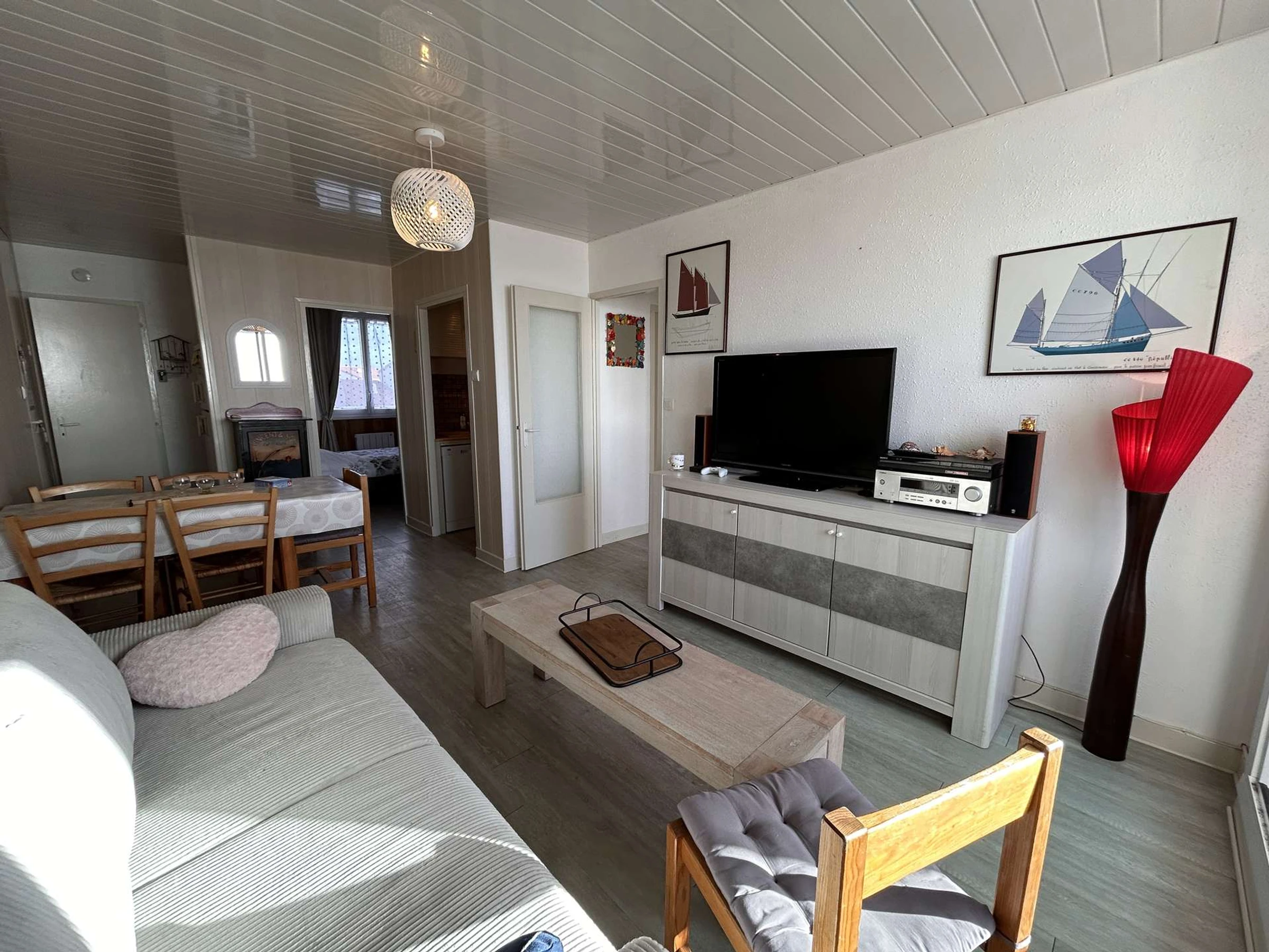 This seaside holiday rental is located on the 3rd floor and includes a living room with a sofa bed (sleeps 2) and a large-screen TV with speakers, a fully equipped kitchenette (refrigerator/freezer, microwave, 3-burner induction hob, mini-oven, dishwasher, and washing machine), a bedroom with a double bed (140 cm) facing the sea, a bedroom with two single beds (90 cm), a shower room, and a toilet.