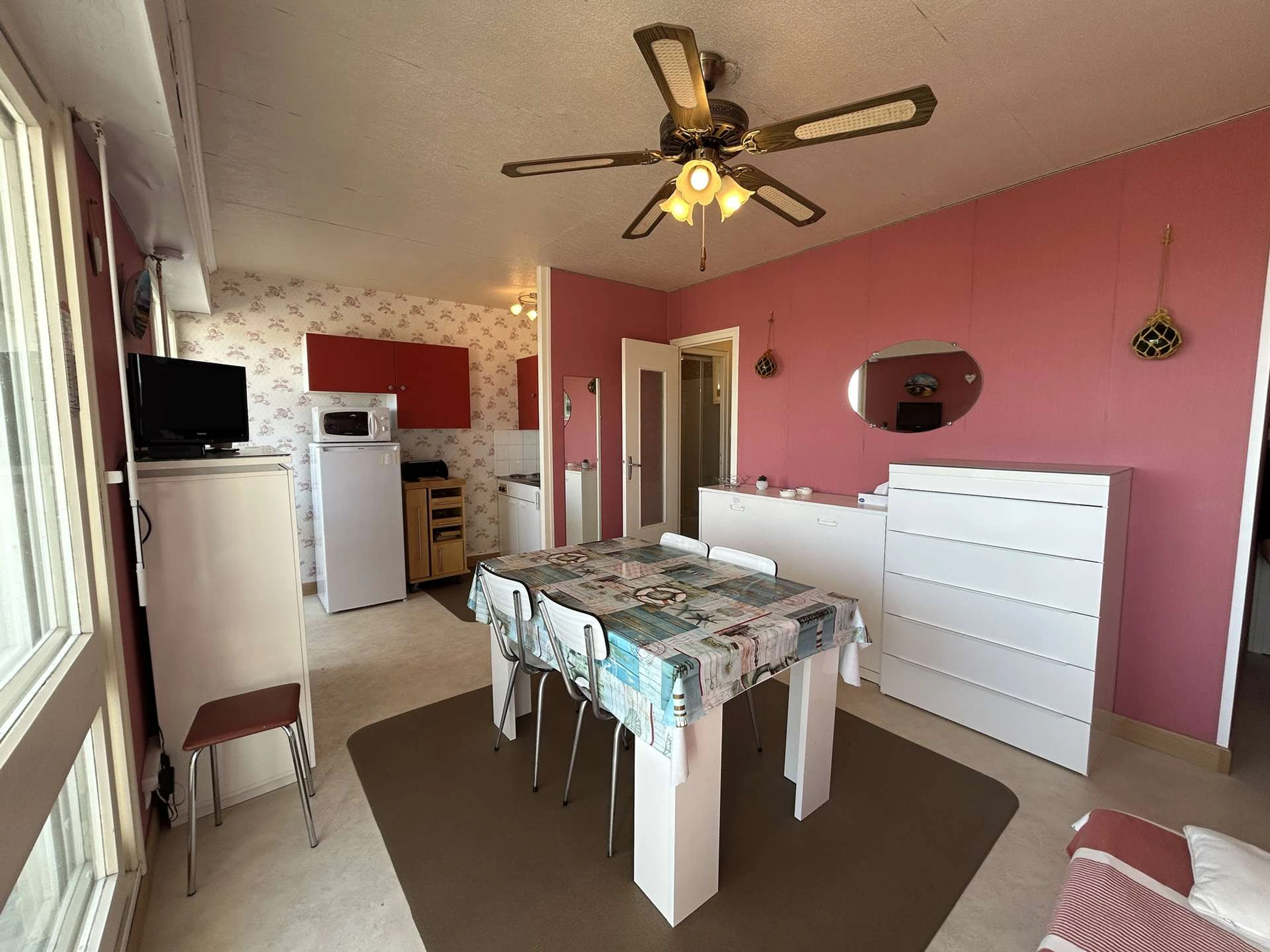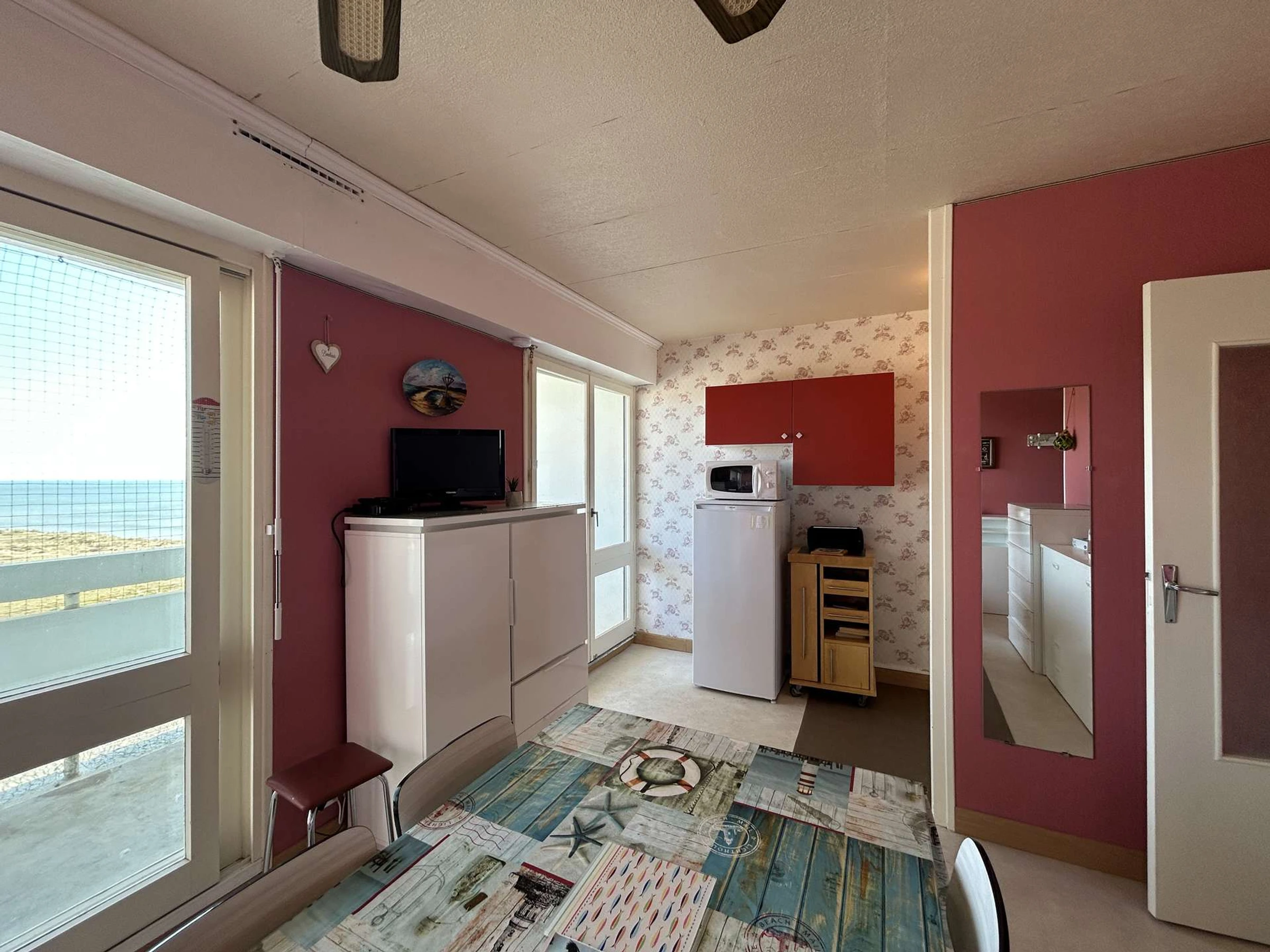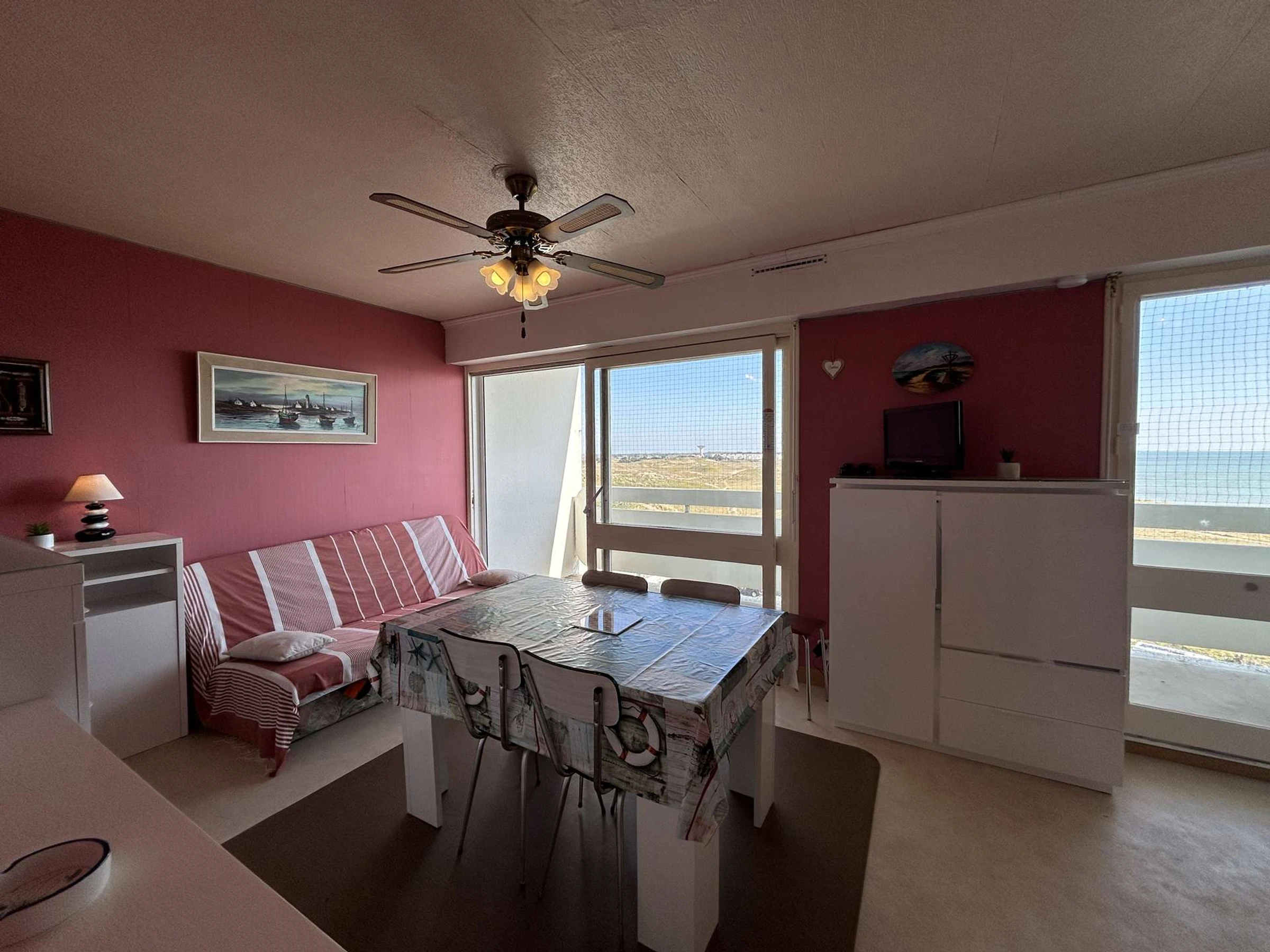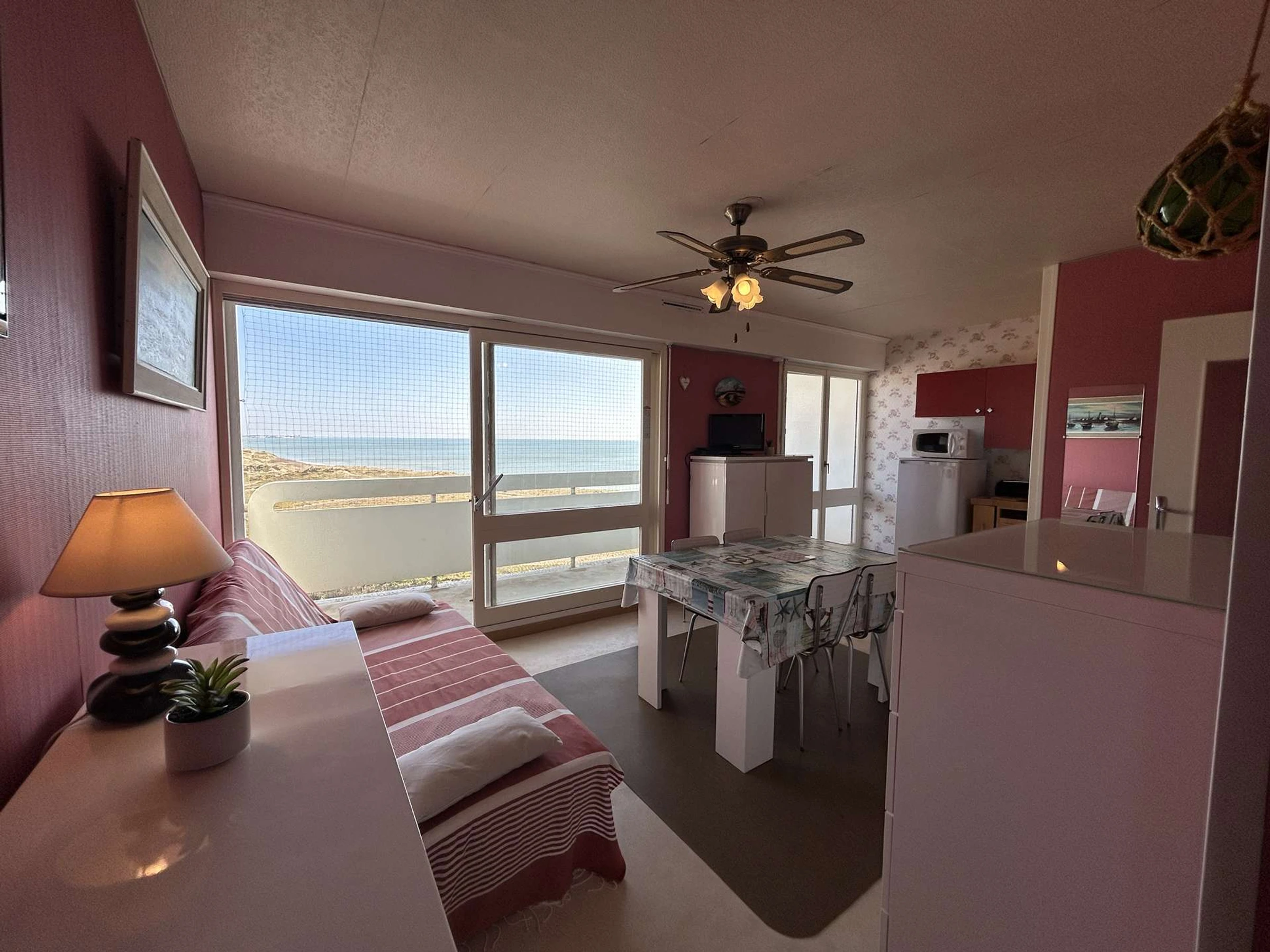 This magnificent apartment, bathed in light, is located on the 4th floor with elevator. It includes a functional and comfortable living room, equipped with a 2-seater convertible sofa and a double foldaway bed, a perfectly equipped kitchen area, a bathroom, a wardrobe space and a balcony offering a breathtaking panoramic view on the ocean.