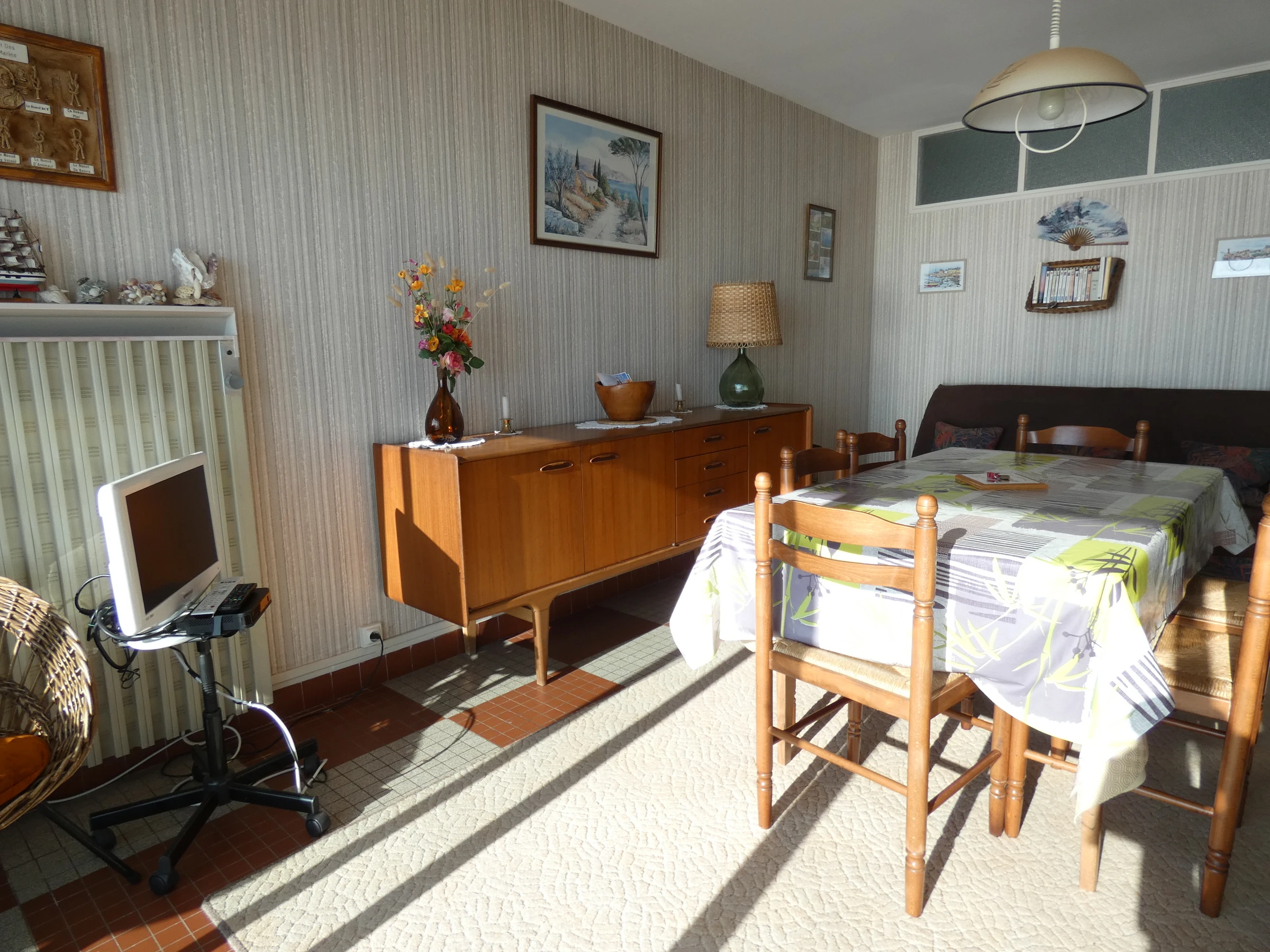 - 1 double sofa bed – TV – Tiled floor – Wallpapered walls.