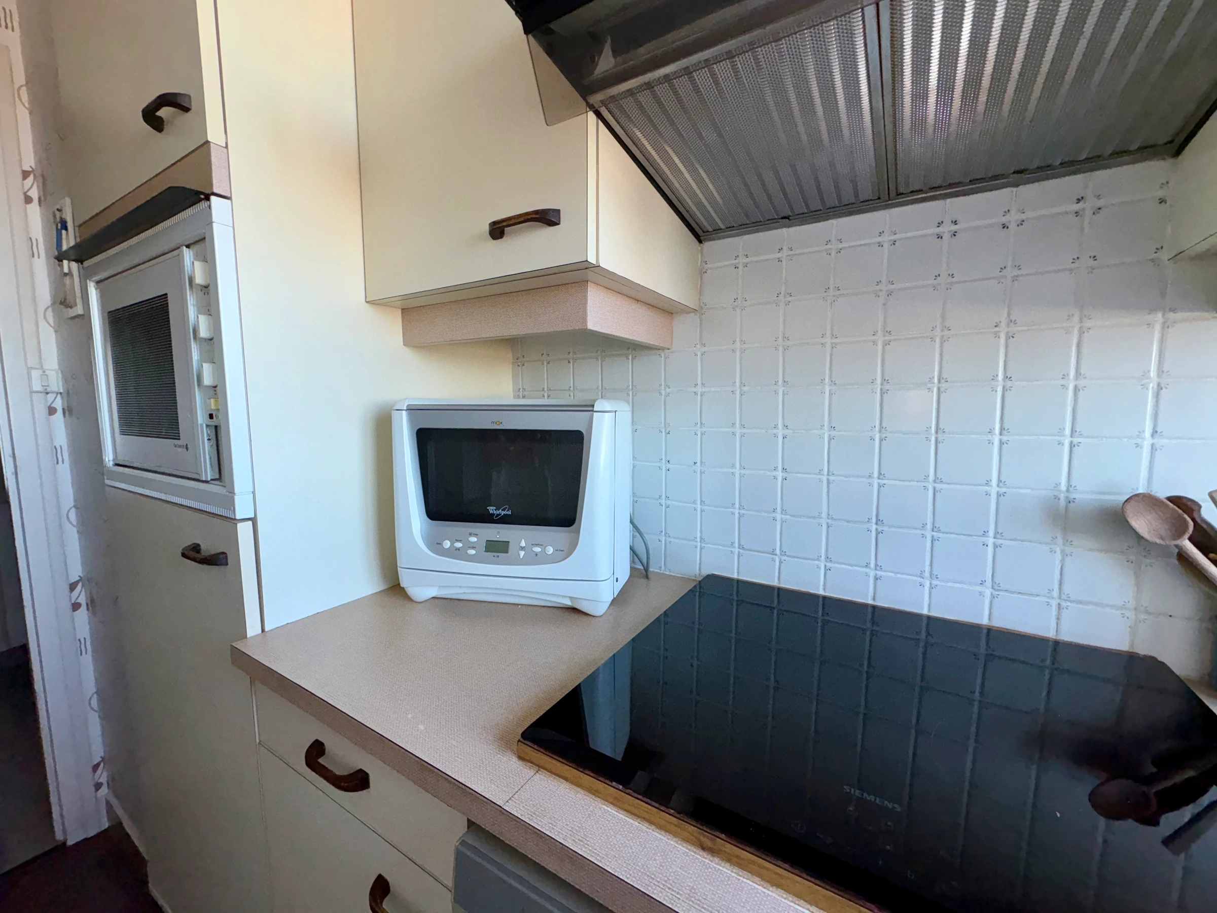 - 3 induction hobs + electric oven - extractor hood - refrigerator - dishwasher - microwave - tiled floor - painted walls.