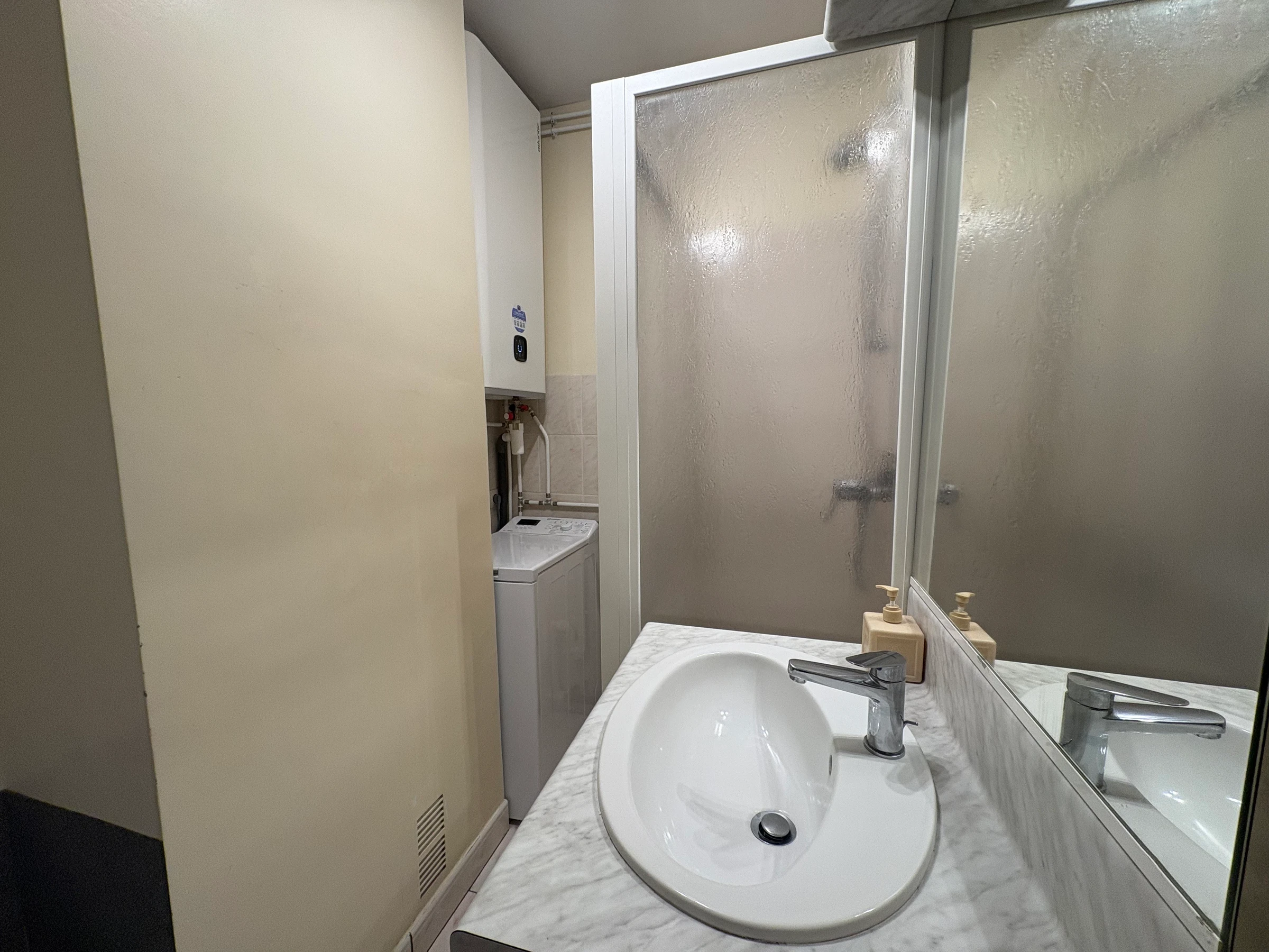 • A bathroom with shower cubicle, vanity unit, toilet, and washing machine