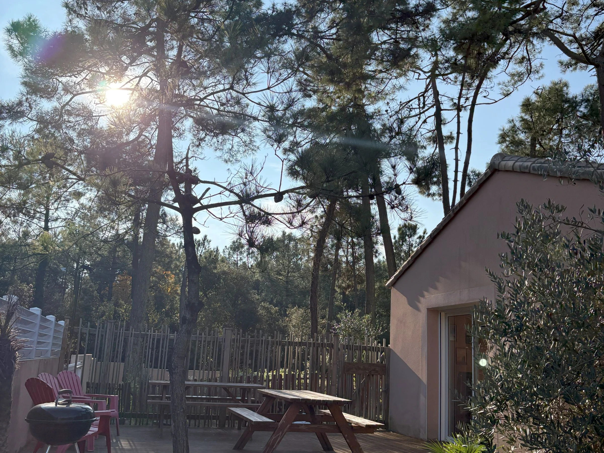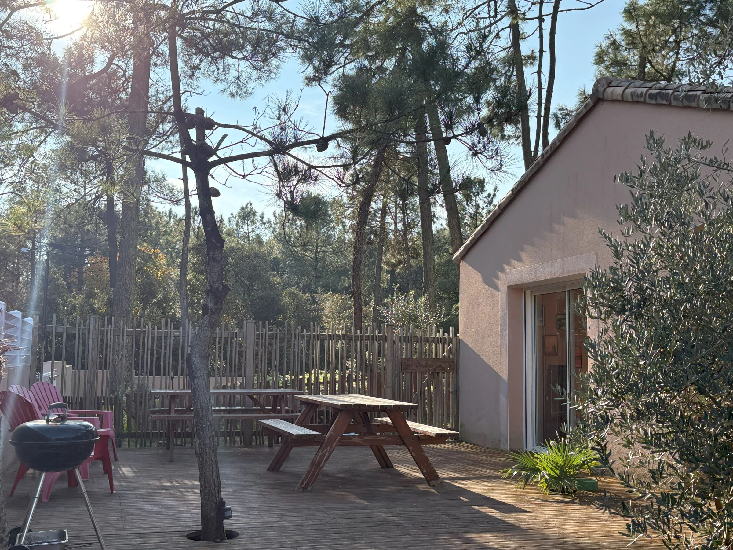 Front wooden terrace: 1 table benches, Weber barbecue, 2 armchairs, bicycle parking, basketball hoop, hose reel