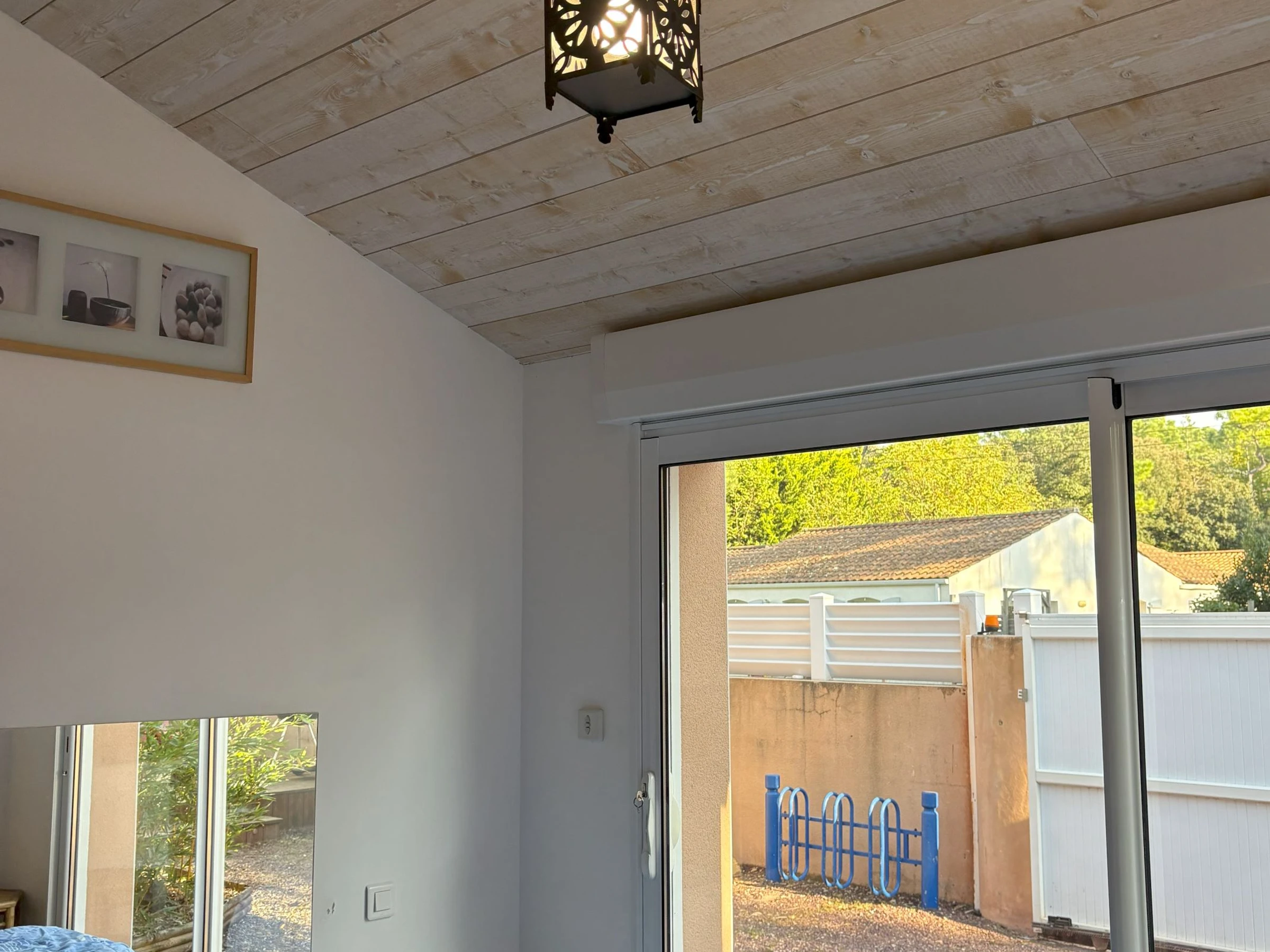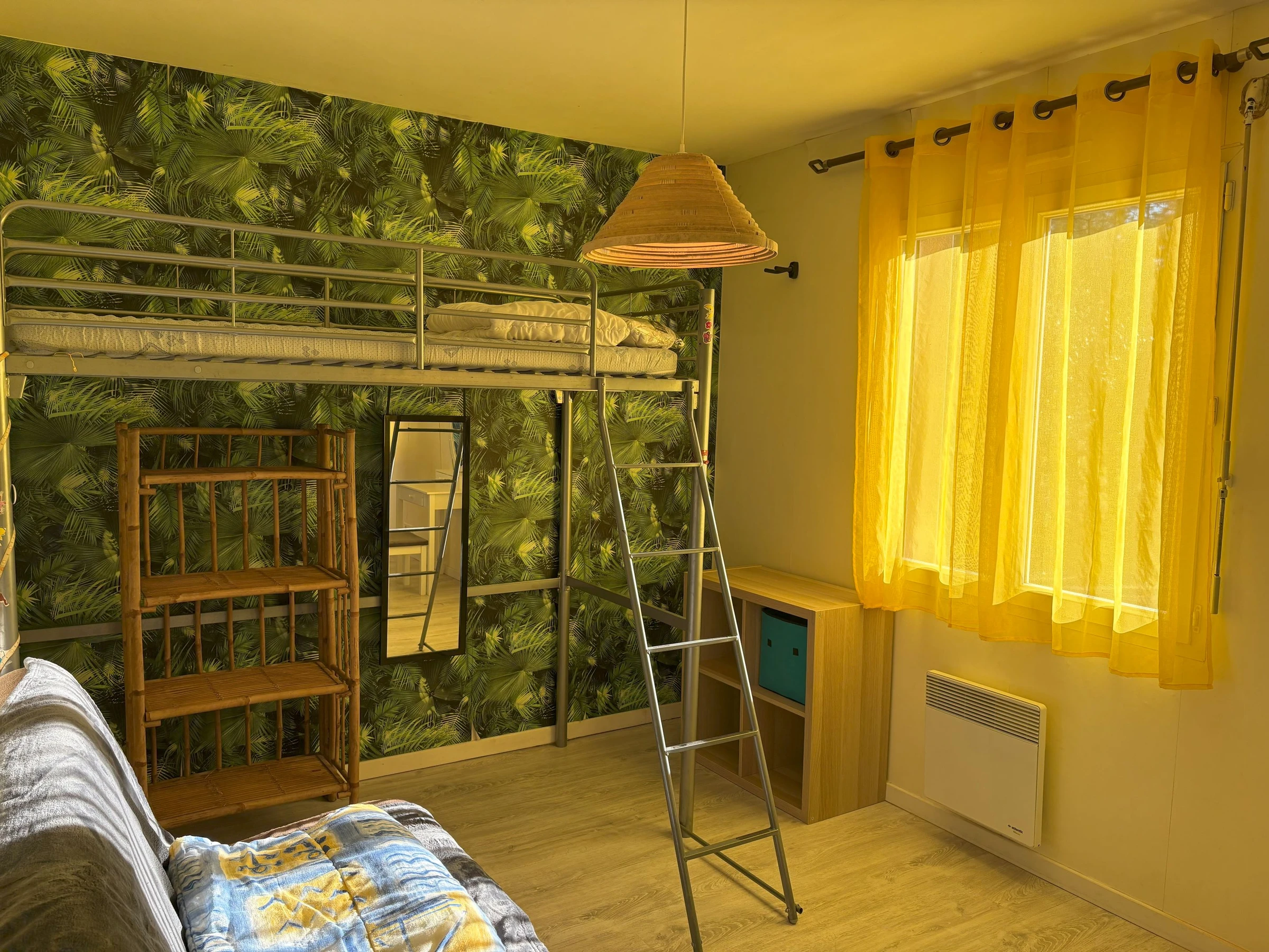 Bedroom 1: roller shutter, bay window with one-way glass, 1 double bed (2 mattresses of 80*190), duvet and pillows, wardrobe shelf cupboard