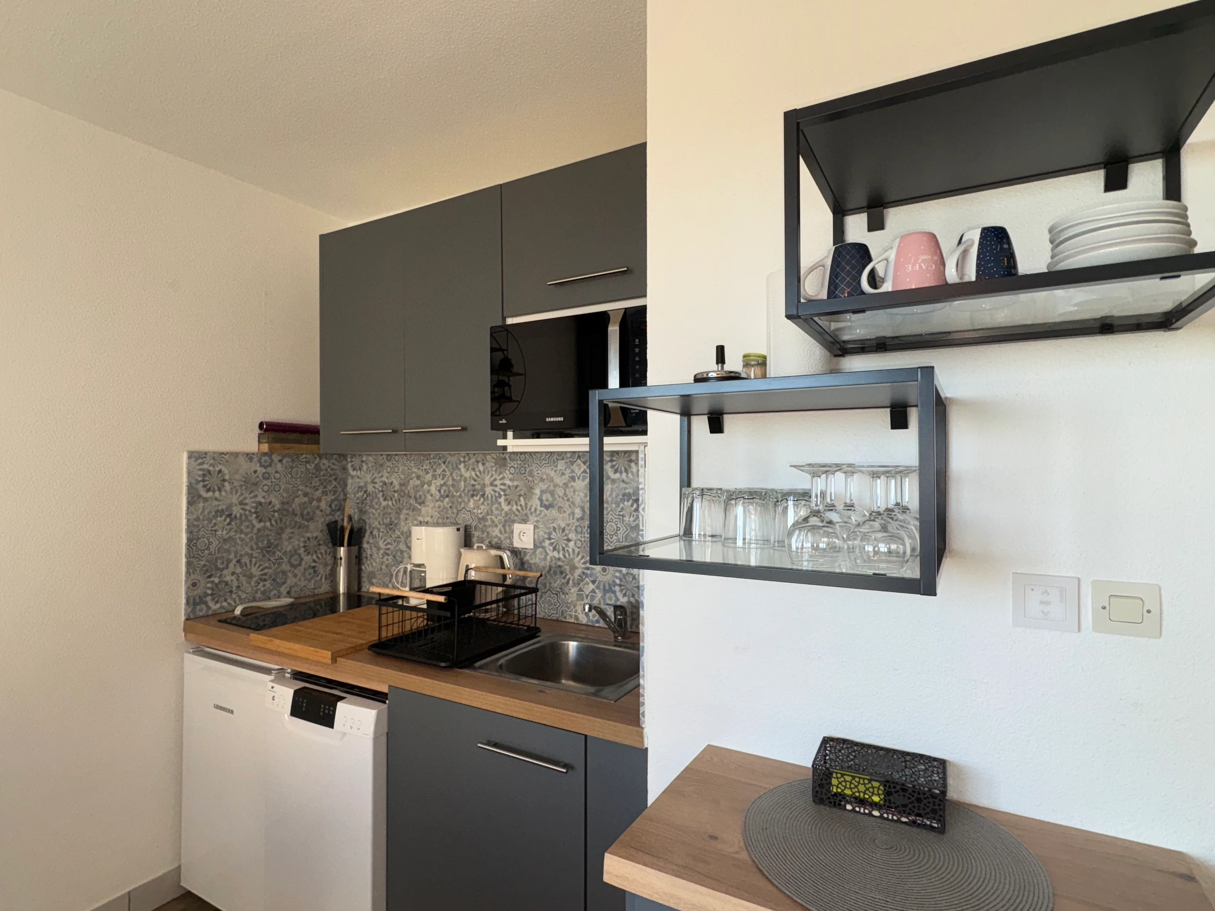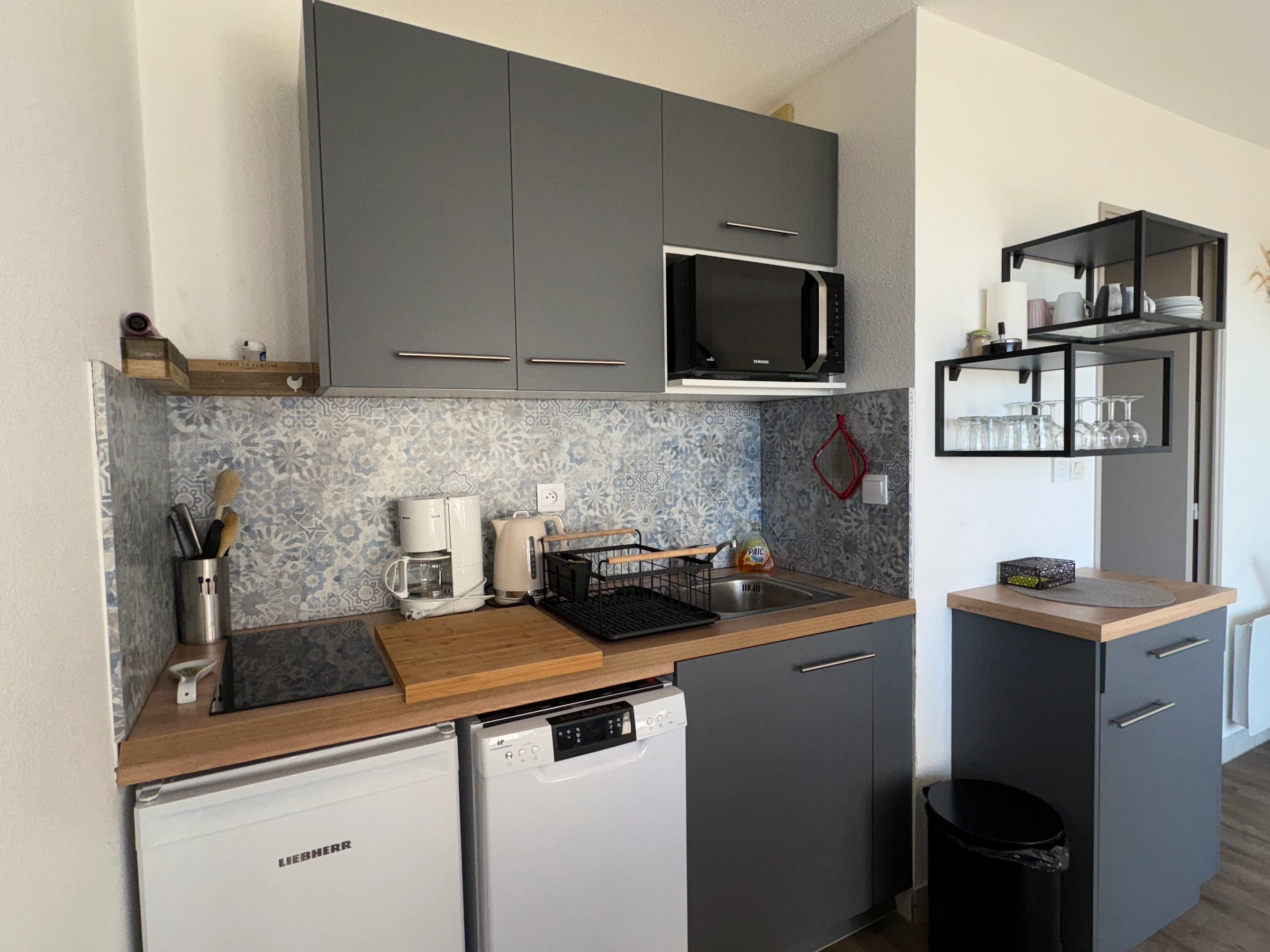 • Living room with fully equipped kitchenette (recently installed in 2020): 2 ceramic hobs, mini oven/microwave, refrigerator (2024), dishwasher, coffee maker, toaster, storage units, clothes drying rack.