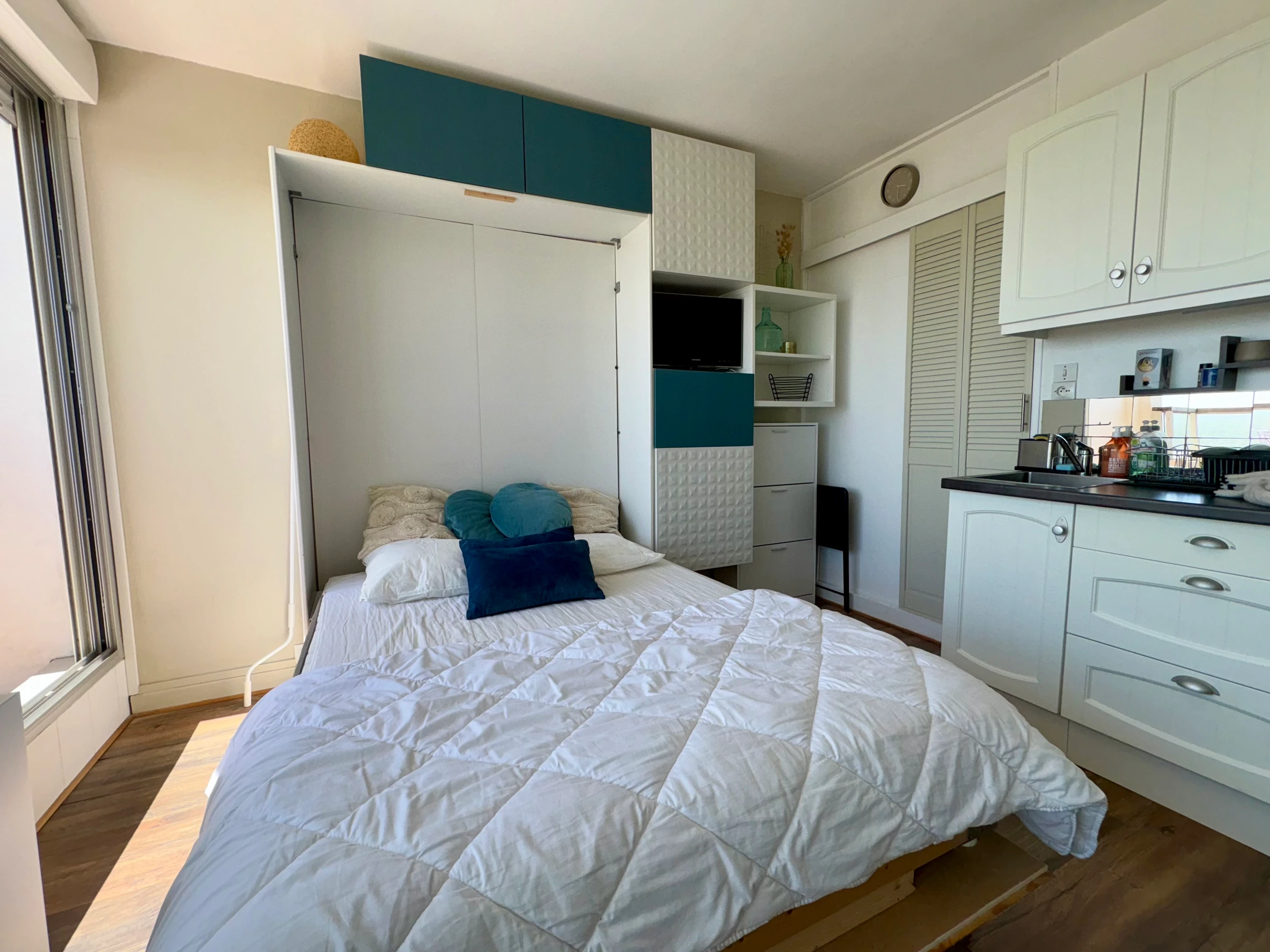 Welcome to this ideally located studio apartment facing the sea, in a well-maintained residence, located in the heart of activities, shops and restaurants, the pine forest and the sailing school.