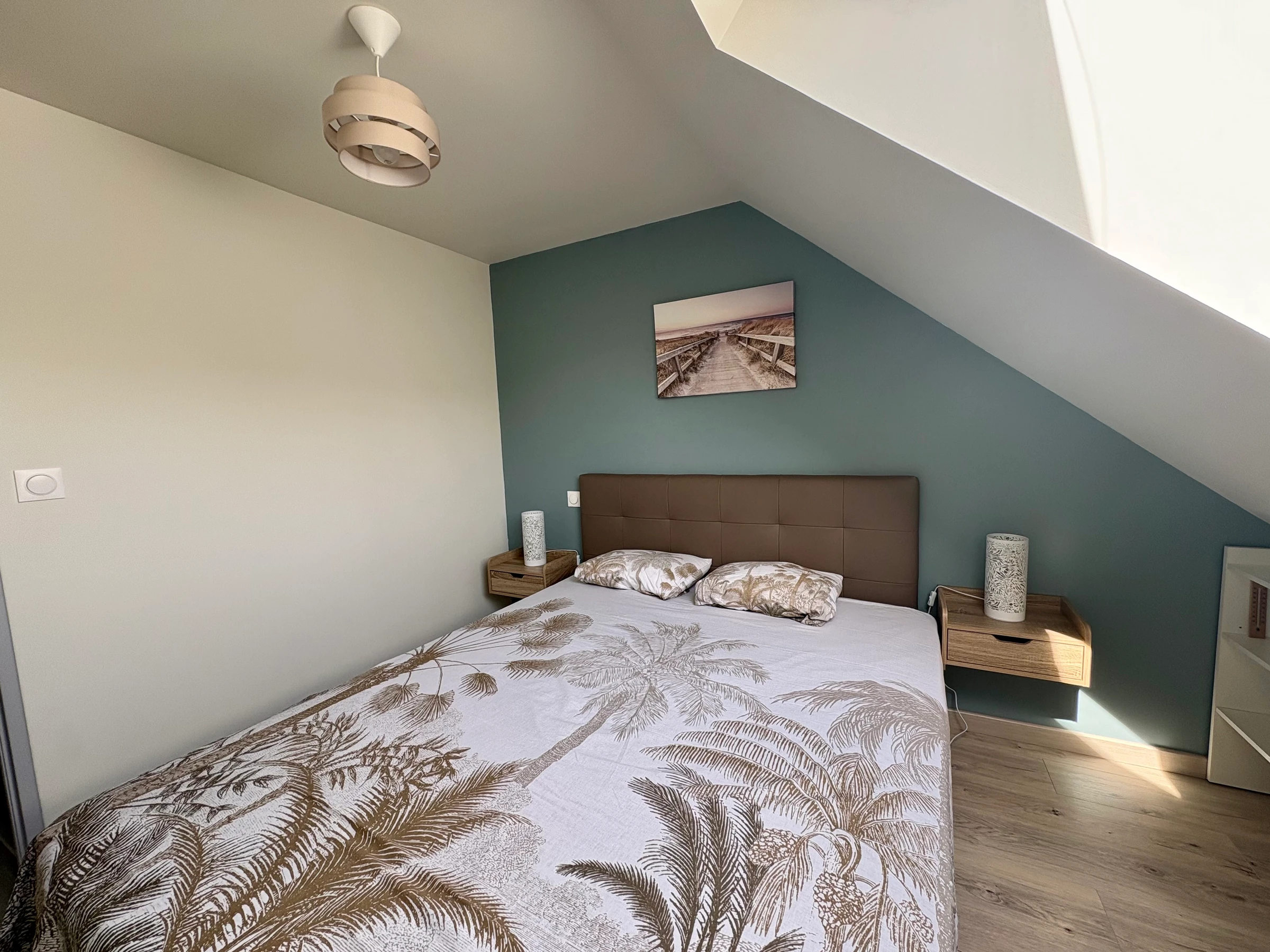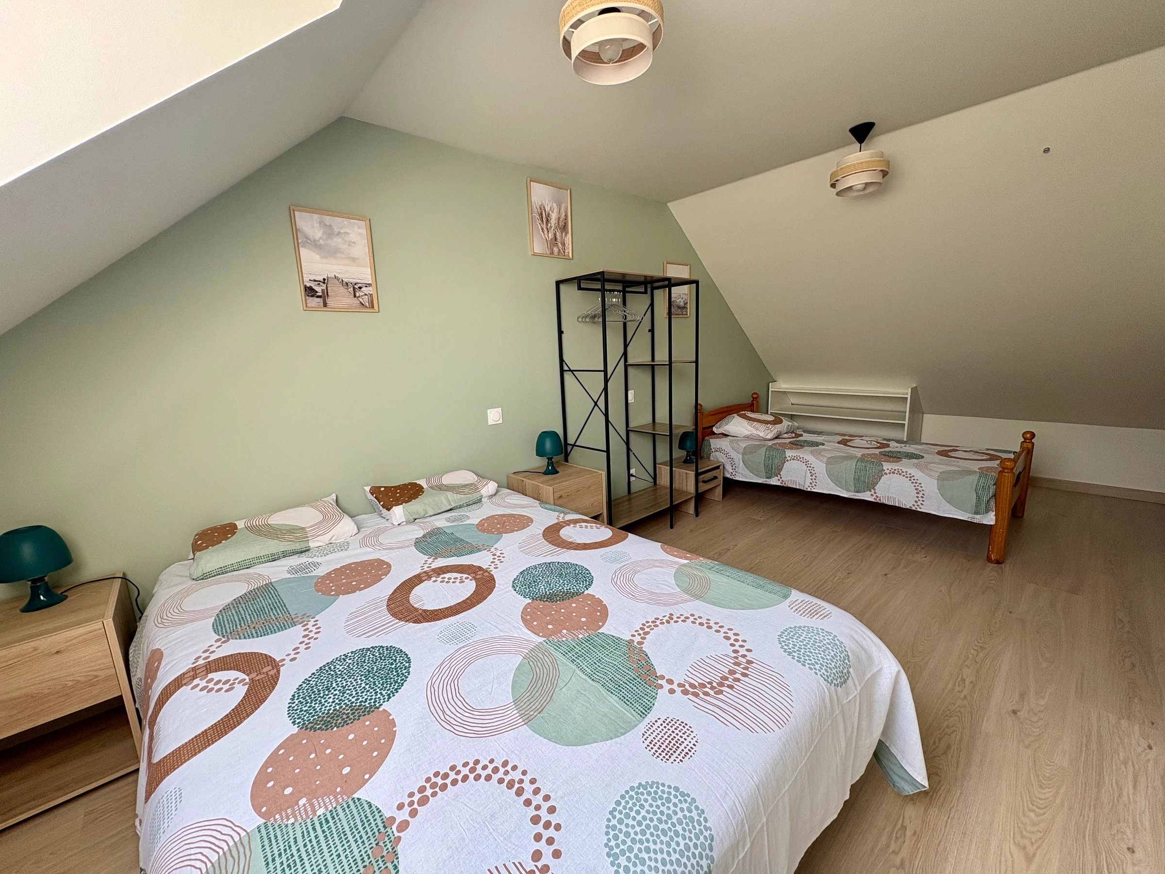 1 family bedroom with a double bed (140x190) and one single bed (90x190), with storage.