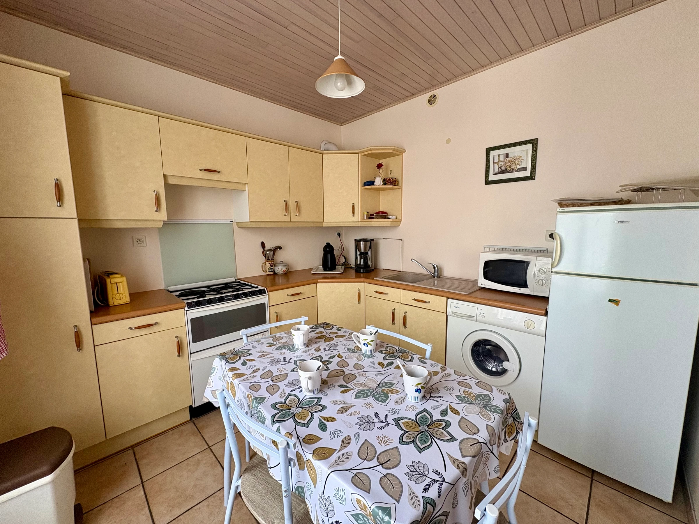 Fully equipped kitchen with microwave, fridge/freezer, dishwasher and everything needed to cook like at home, with dining table and chairs.