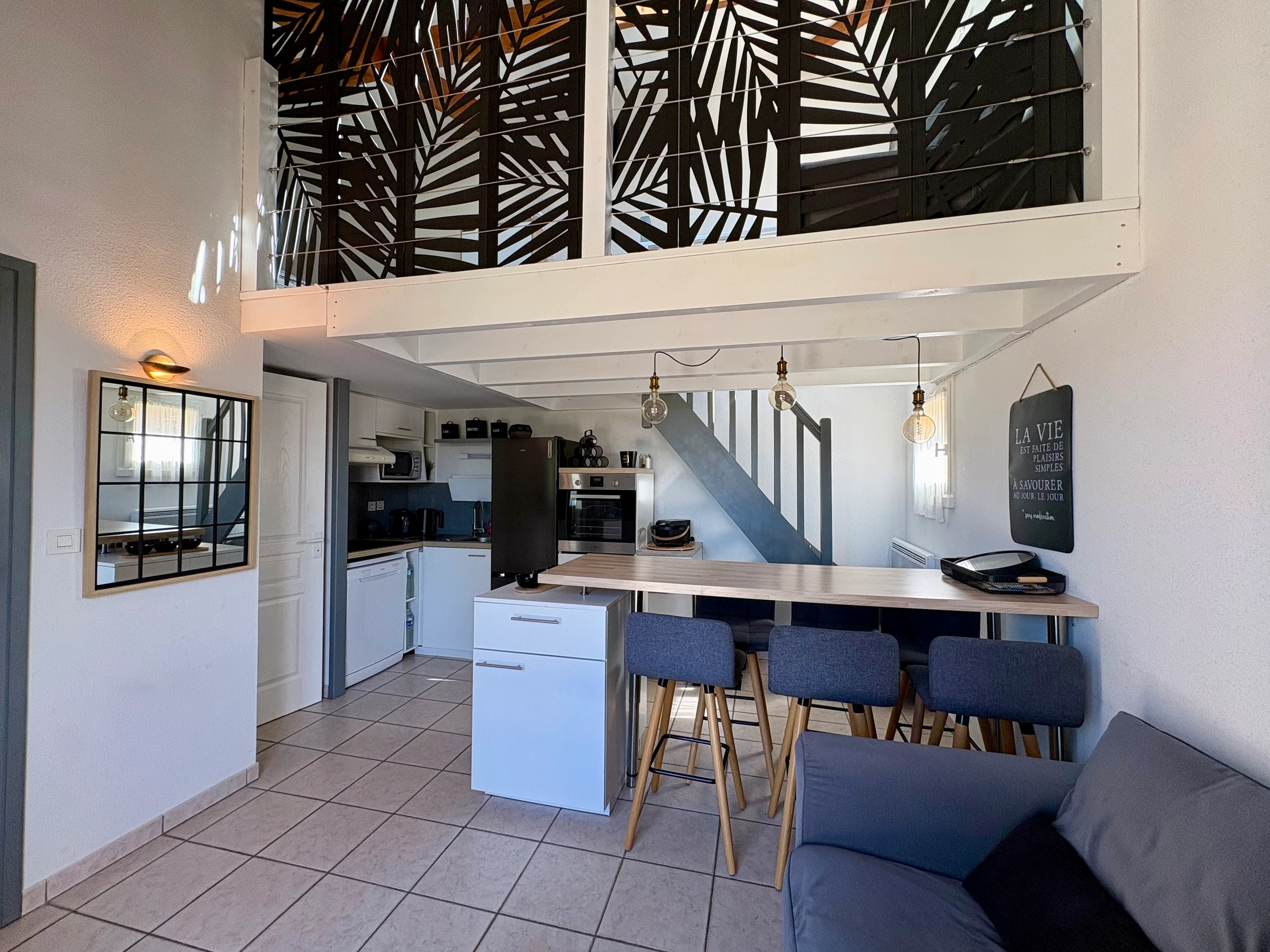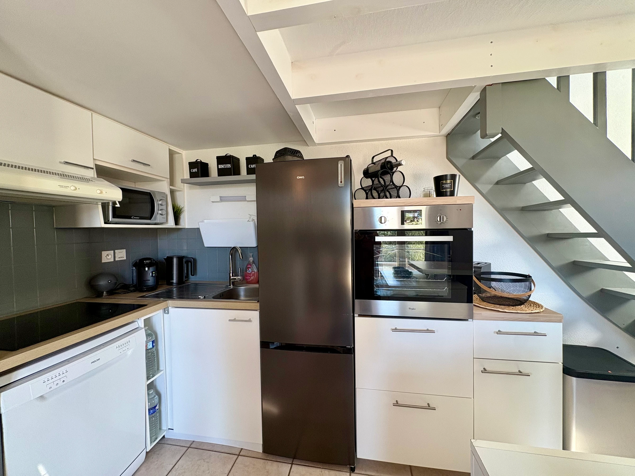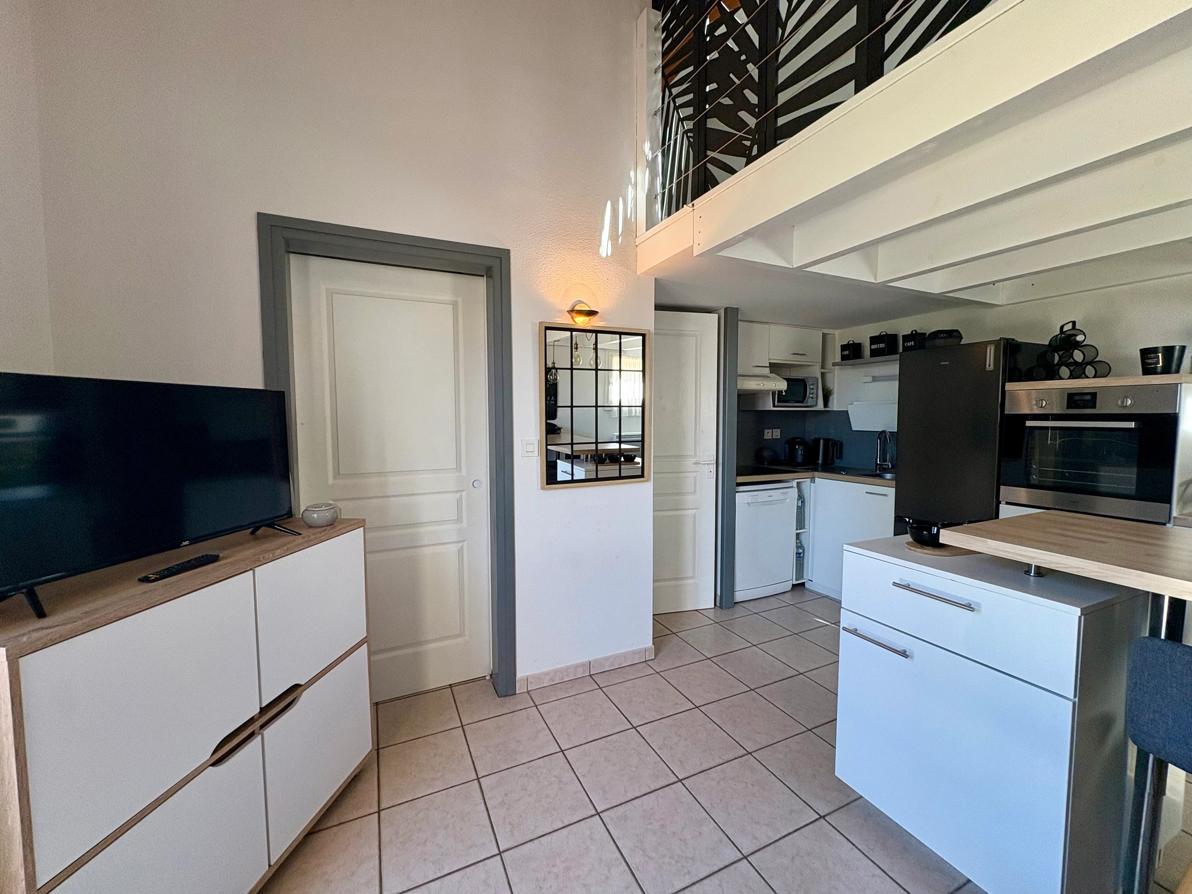 A living room with lounge and fully equipped open kitchen (dishwasher, oven, extractor hood, capsule coffee machine, fridge with freezer…)