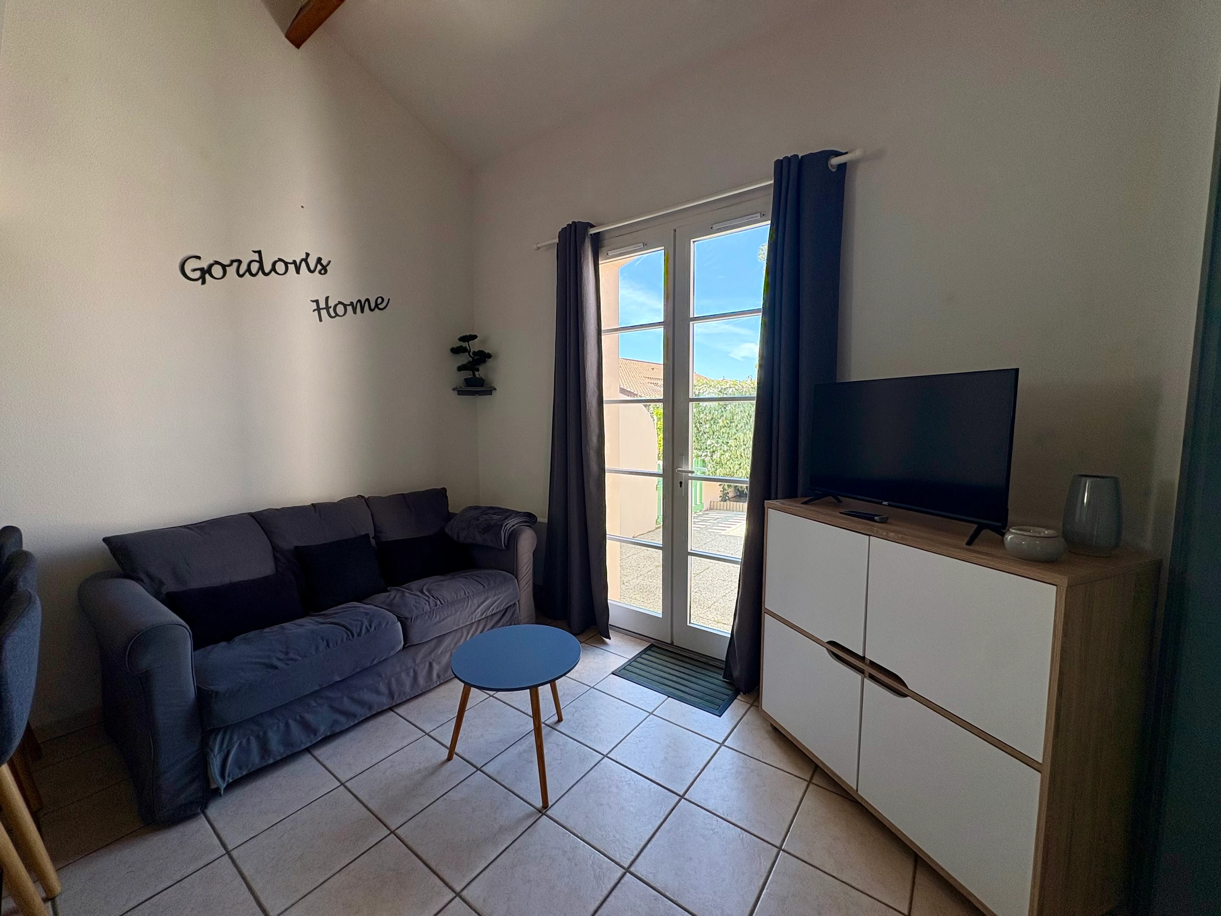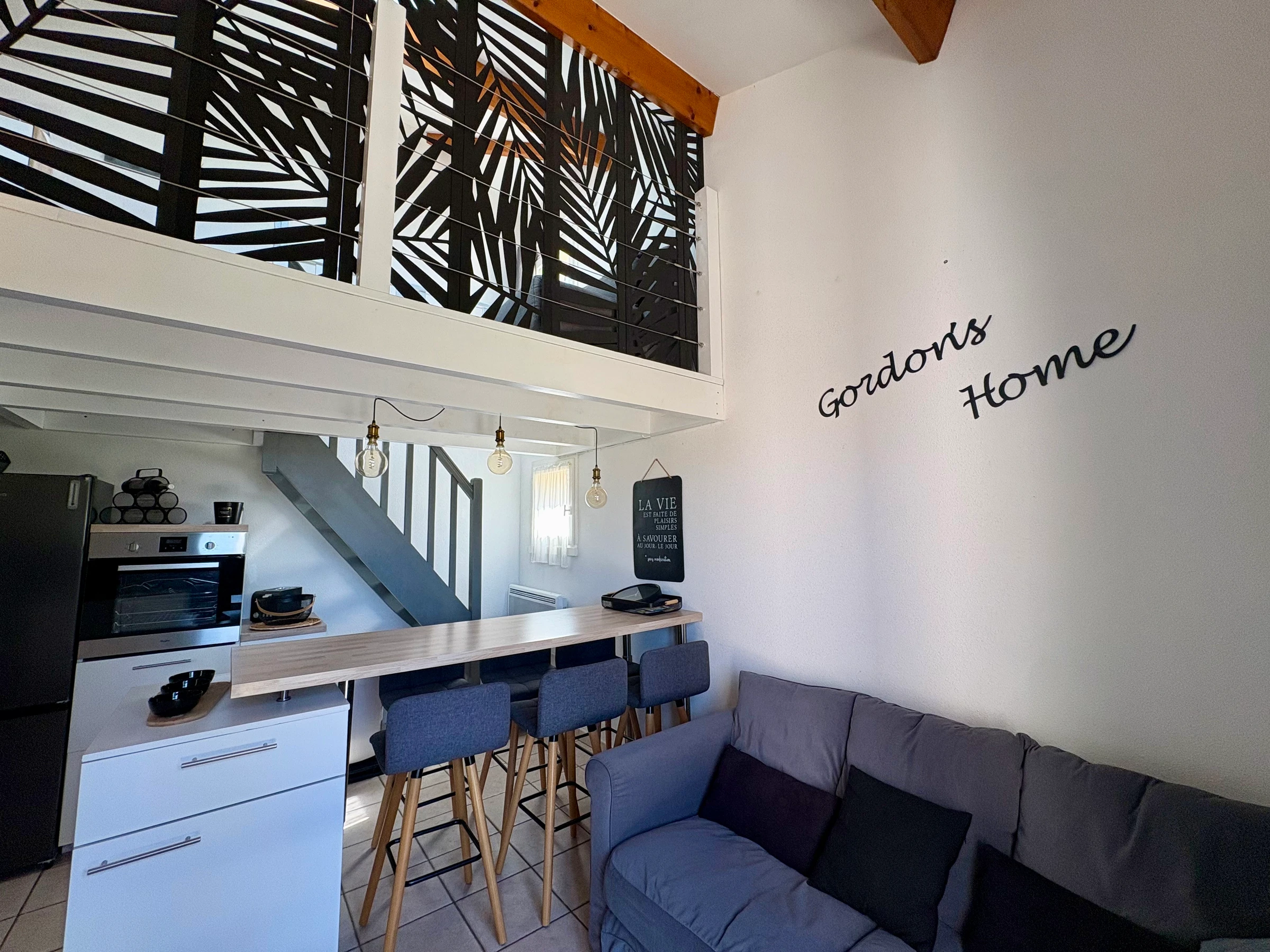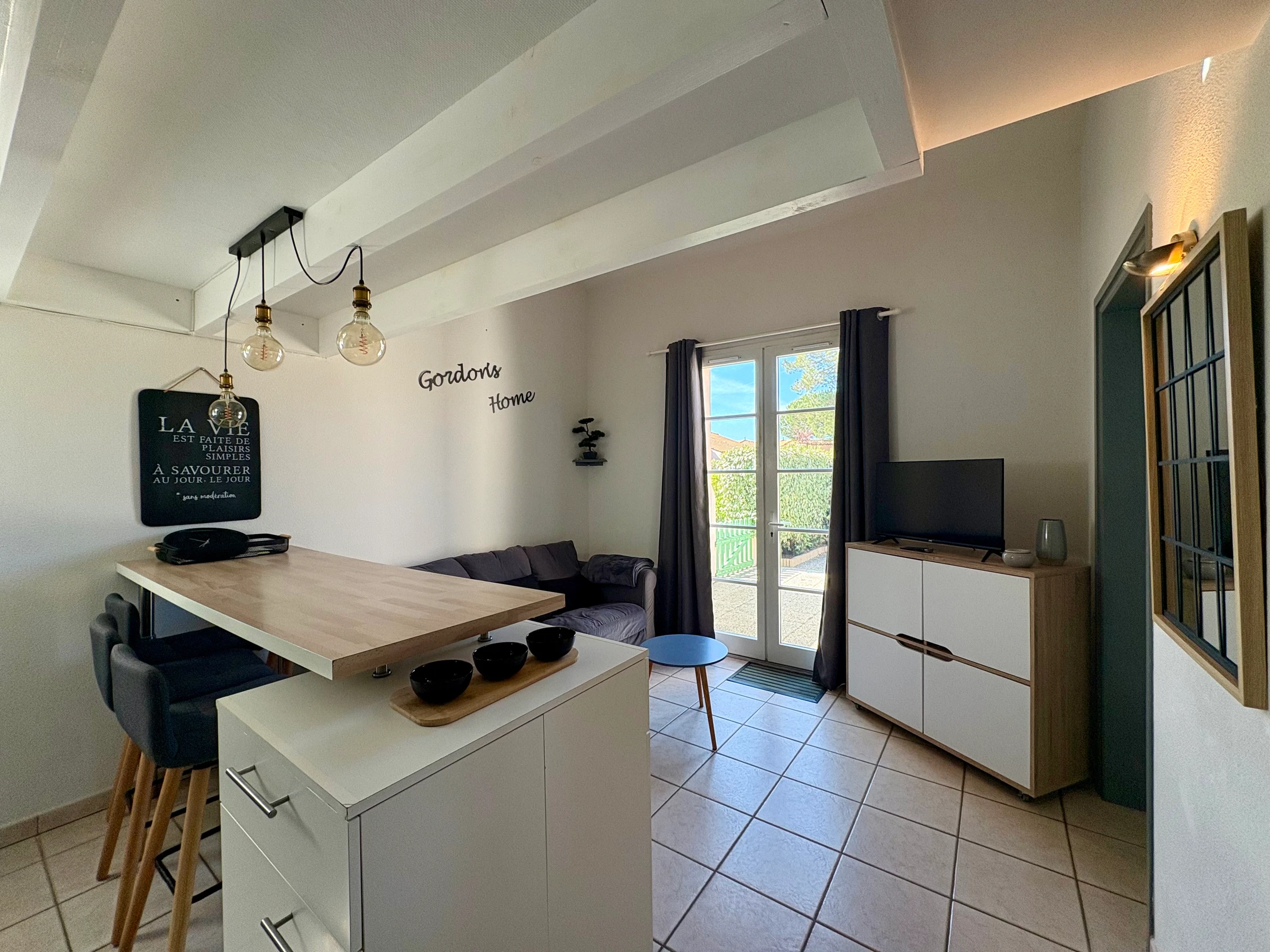 A living room with lounge and fully equipped open kitchen (dishwasher, oven, extractor hood, capsule coffee machine, fridge with freezer…)