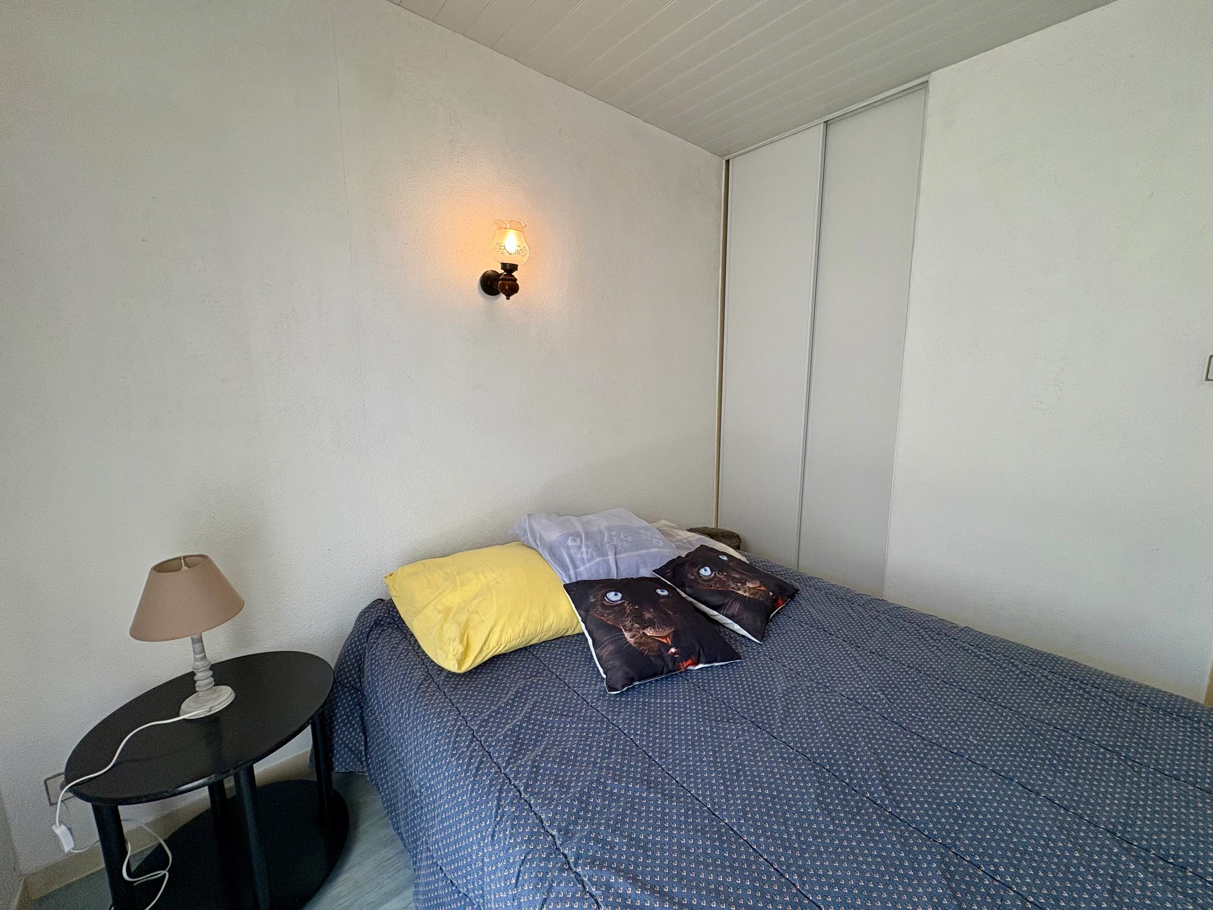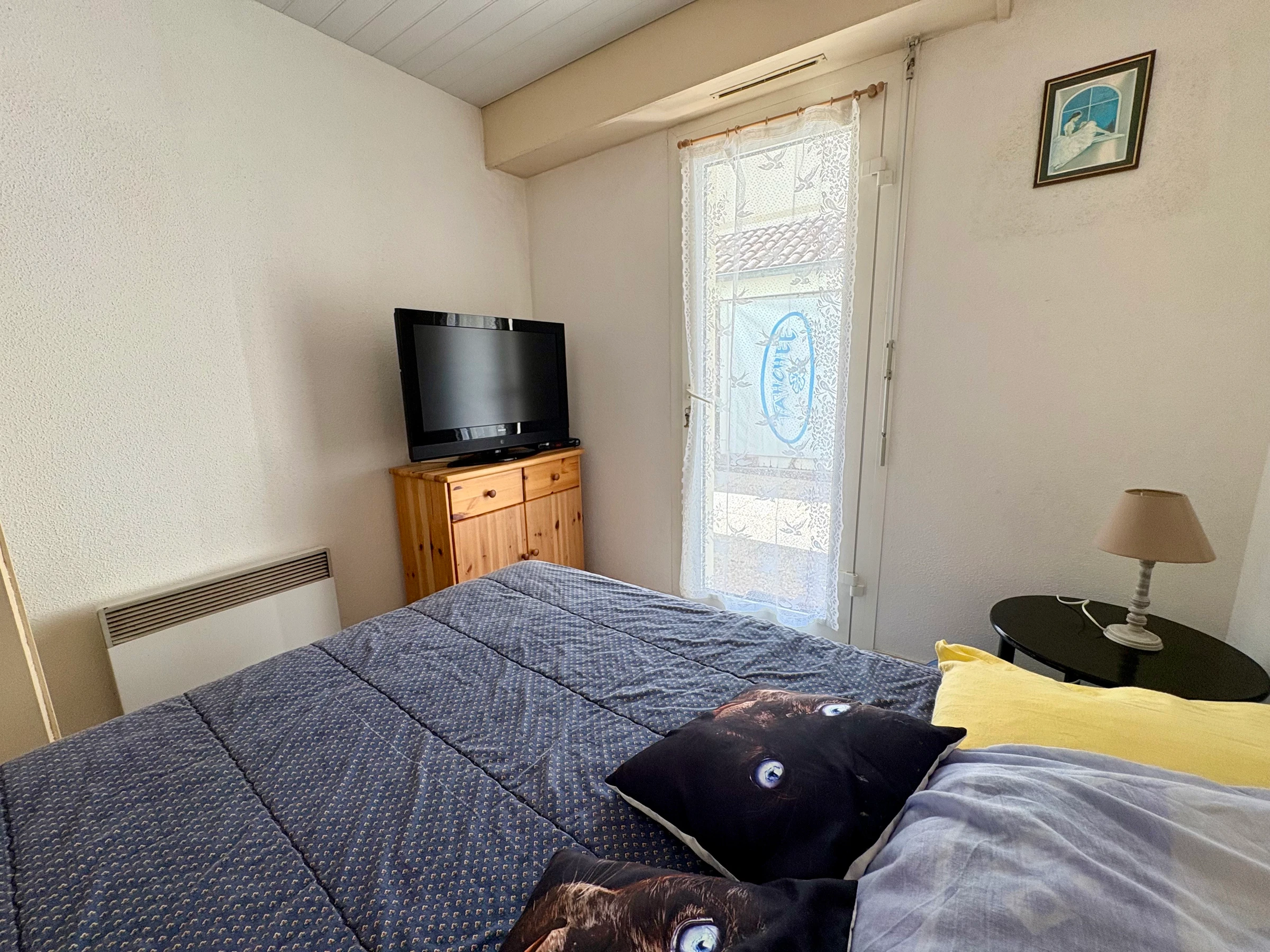 BEDROOM: French doors opening onto the terrace with a double bed (140cm slatted base and foam mattress, NEW 2021), wardrobe/shelves, bedside table, cabinet. Linoleum flooring - Plastered walls.