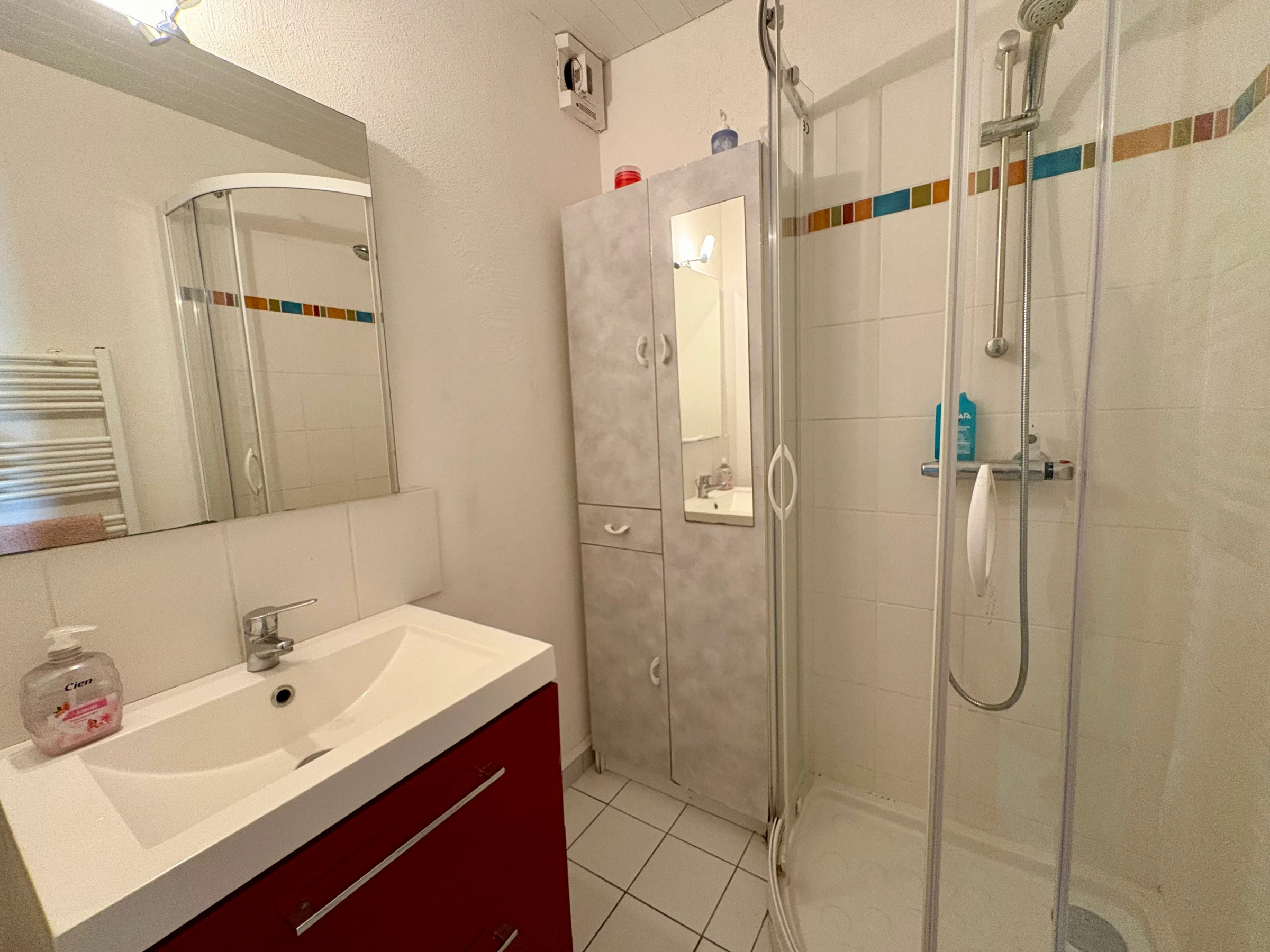 BATHROOM: Sink, shower cubicle, mirror, storage unit. Separate WC.