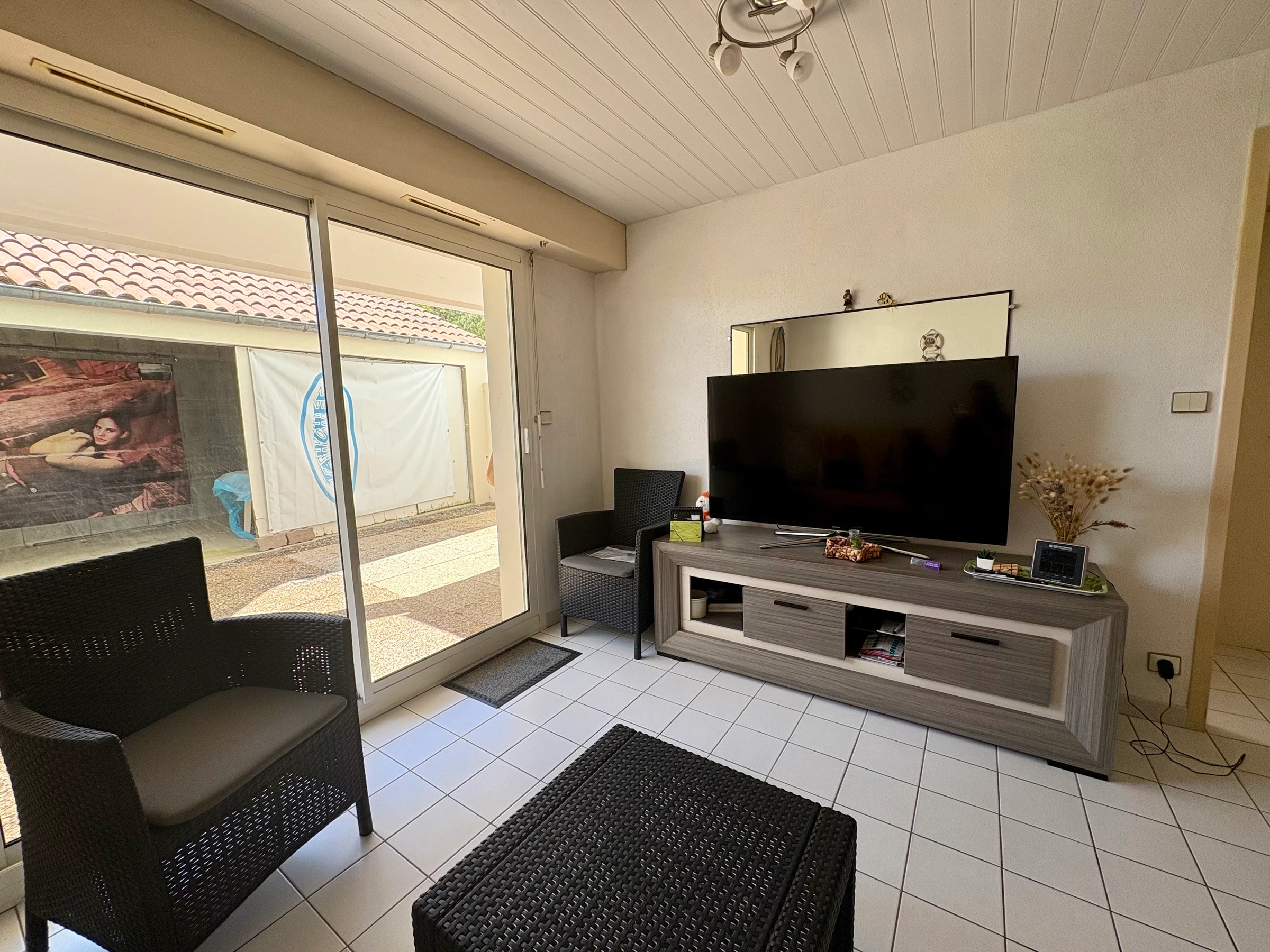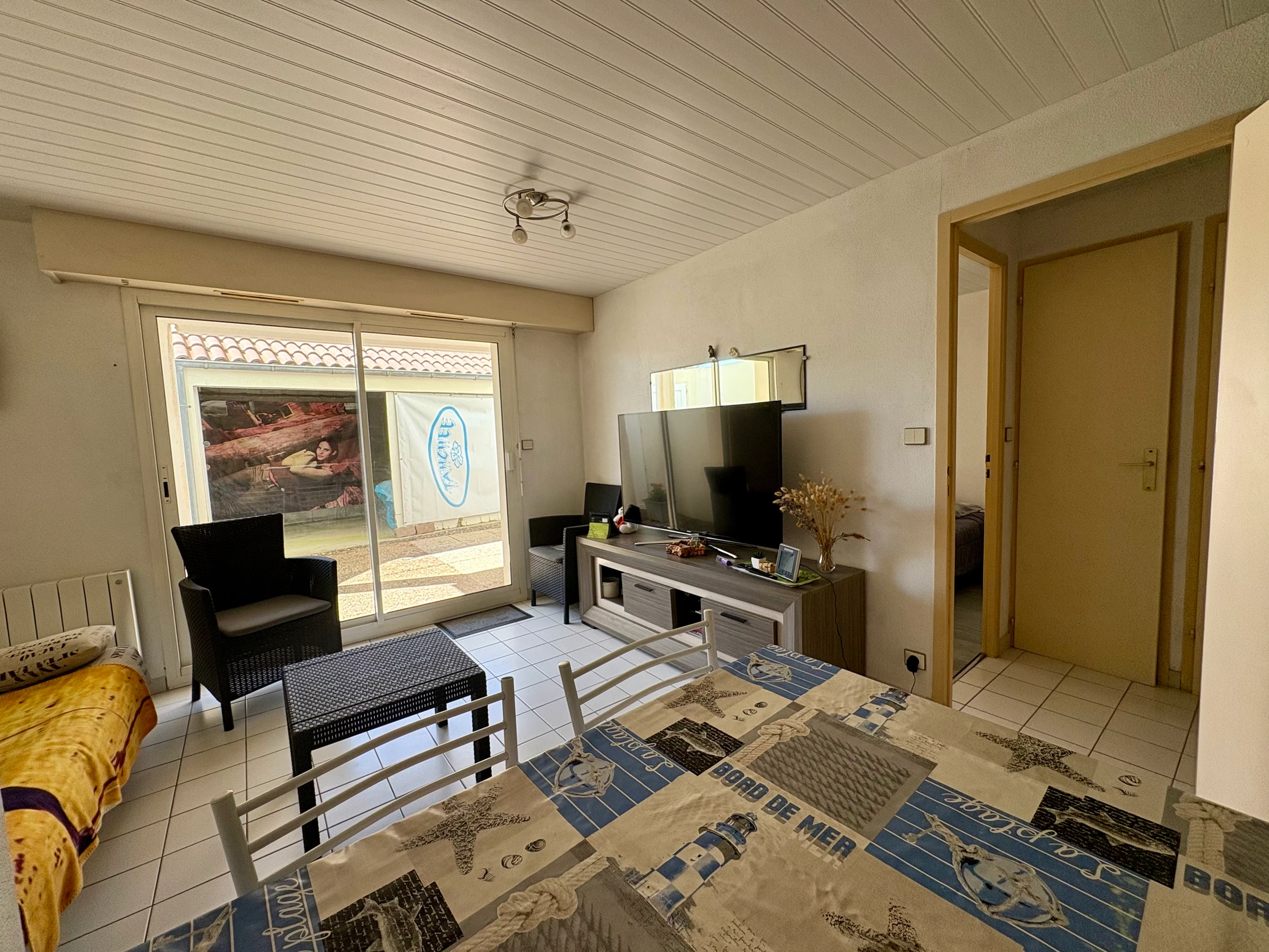 LIVING ROOM: Table + 4 chairs, 1 double sofa bed (slatted base/foam mattress), coffee table, TV with DVD player, TV cabinet, French doors opening onto a west-facing terrace.