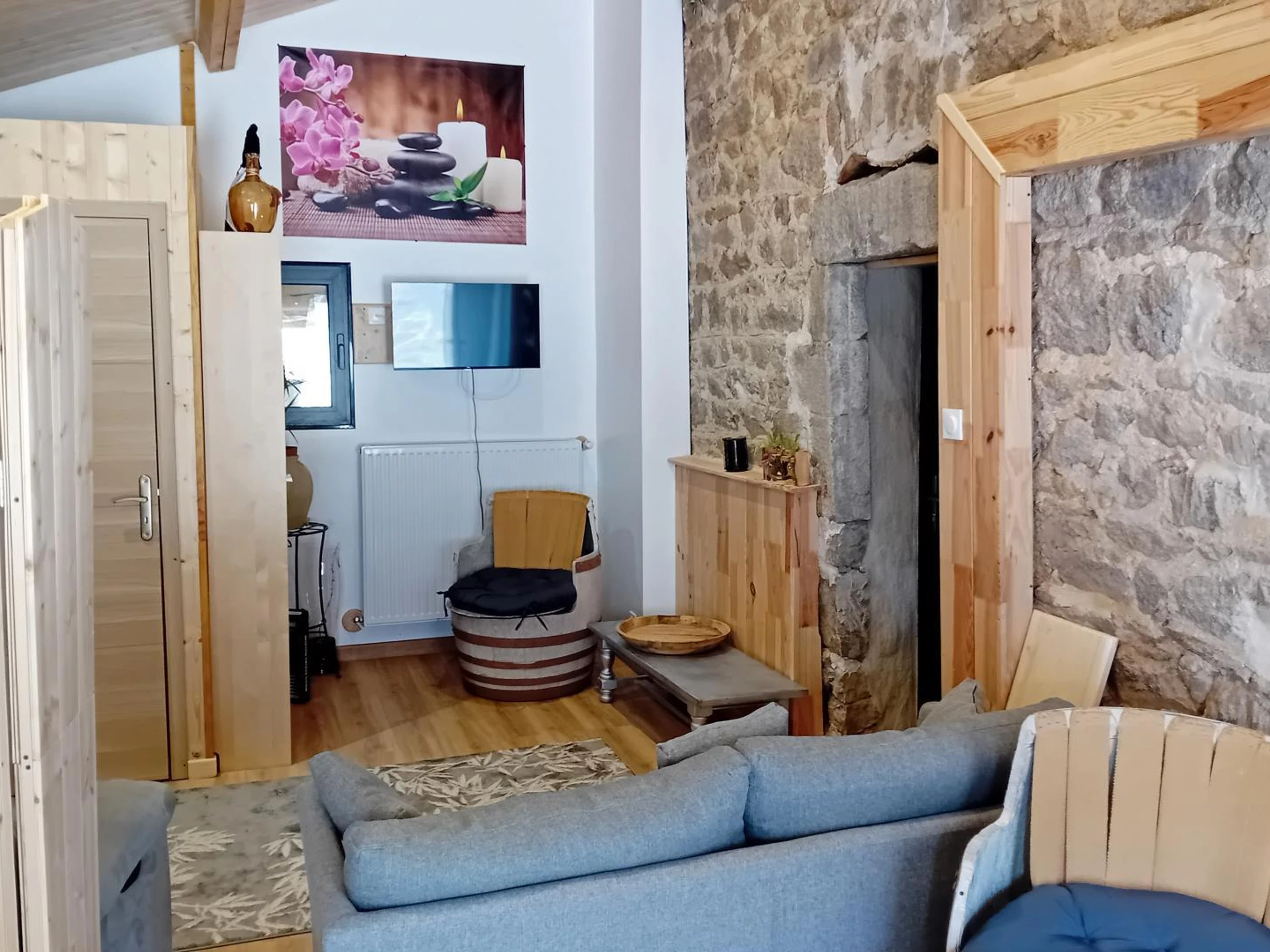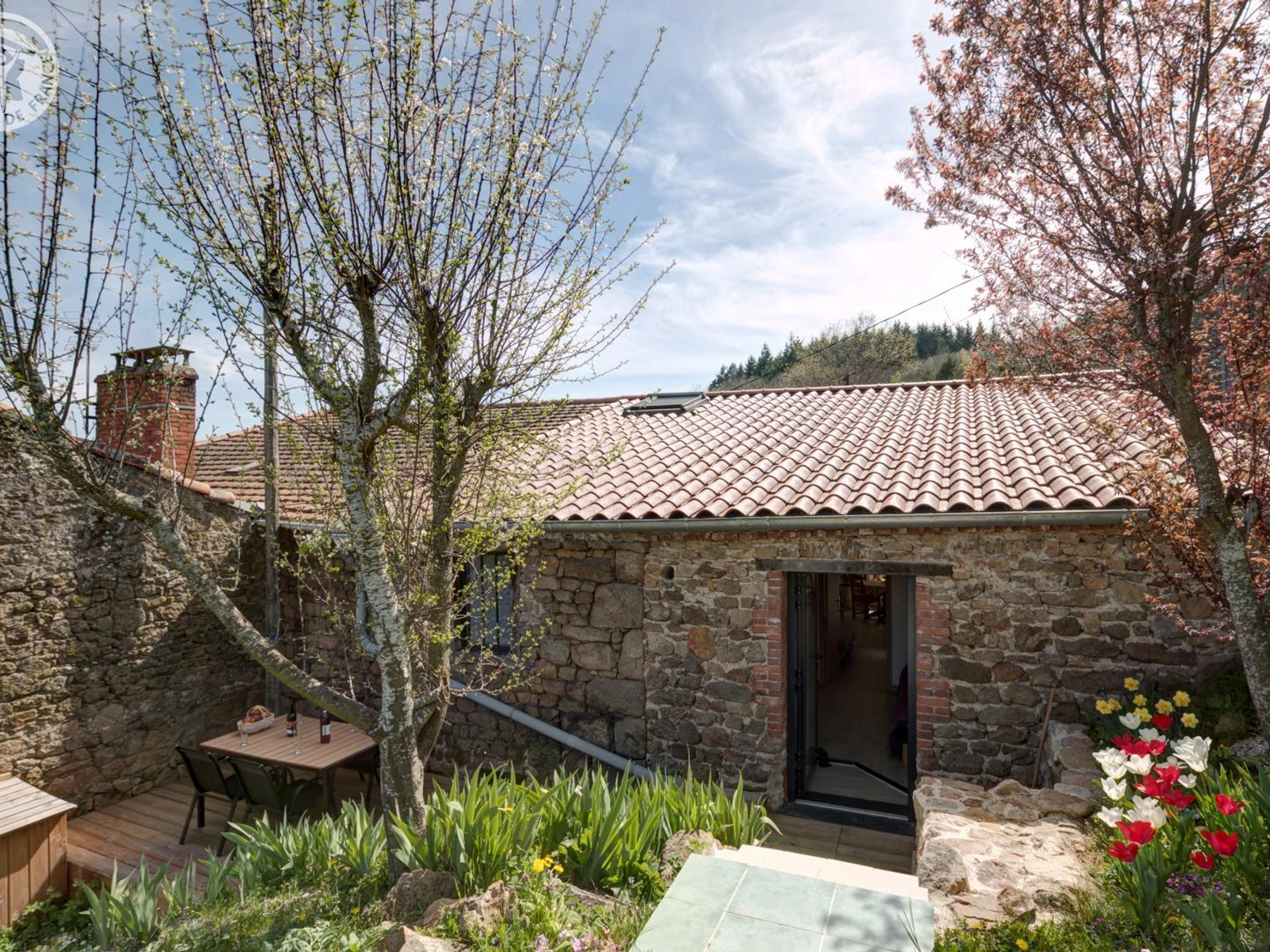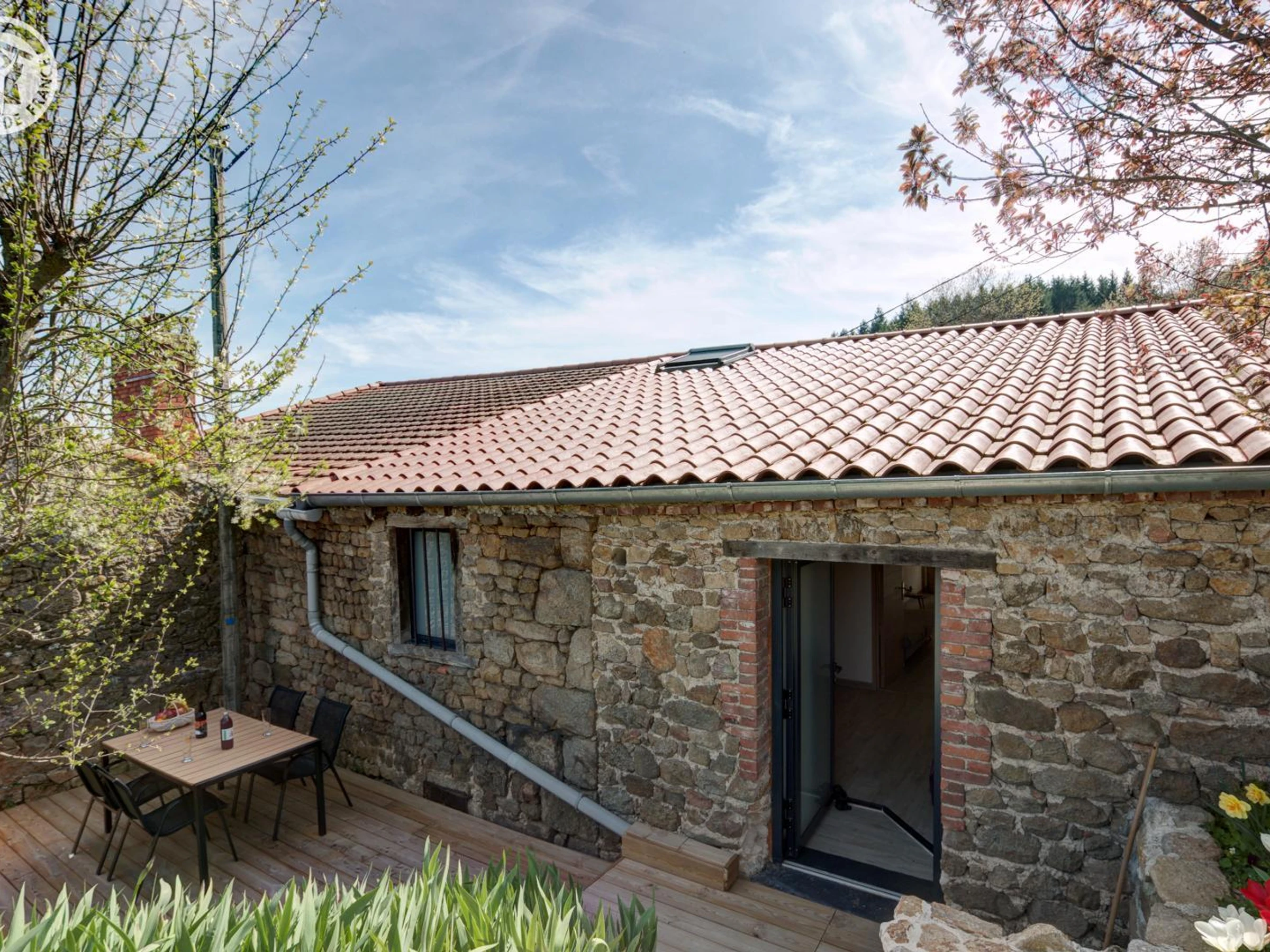 The 40m² "Coron" cottage features a living room with a kitchen open to the dining area and lounge with a sofa bed, a bedroom with two 90cm beds that can be combined into a 180cm bed, a bathroom, and a separate toilet. Between the Loire and Ardèche, in the heart of a peaceful country hamlet, you will be charmed by the calm of the surrounding nature. Discover this charming and authentic 18th-century stone farmhouse, steeped in history and carefully restored and decorated by the owners. "Le chant de l'eau" is the grouping of two adjoining cottages to offer you a cozy stay in a small group. You will find charm and a gentle atmosphere to relax in these places. The accommodation is located opposite the owners' house and overlooks the valley, offering a pleasant view from the terraces and the shared courtyard of the property. To make your stay even more enjoyable, utilities and heating are included, beds are made upon arrival, towels are provided, and the cleaning fee is included!