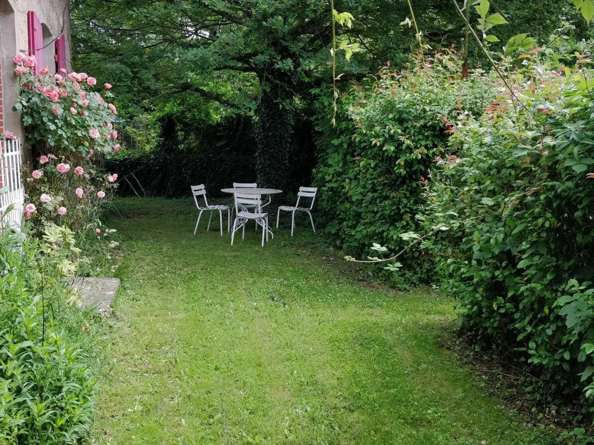 Large courtyard at the back of the house with a terrace perfect for outdoor dining in season. A garage.
