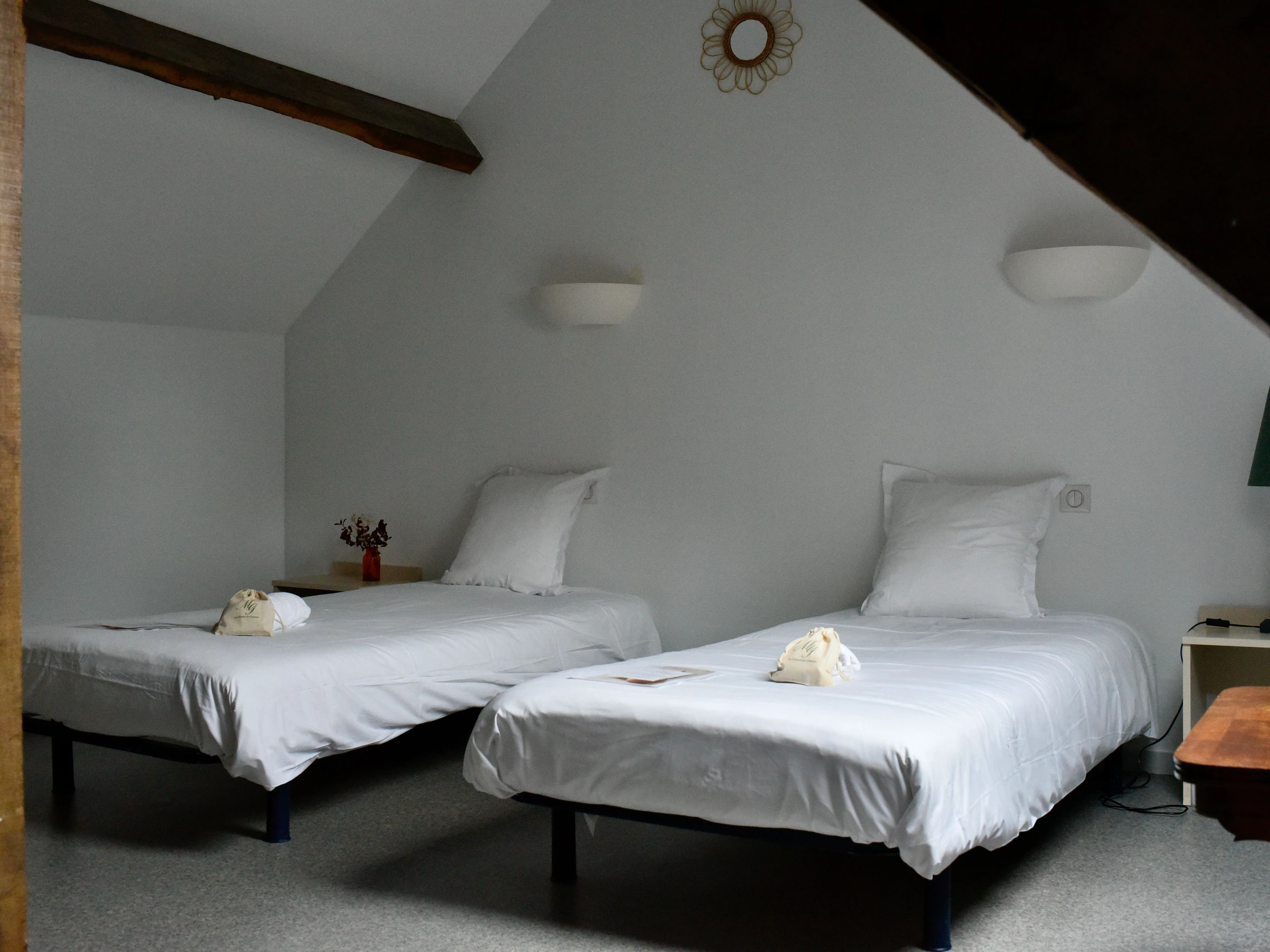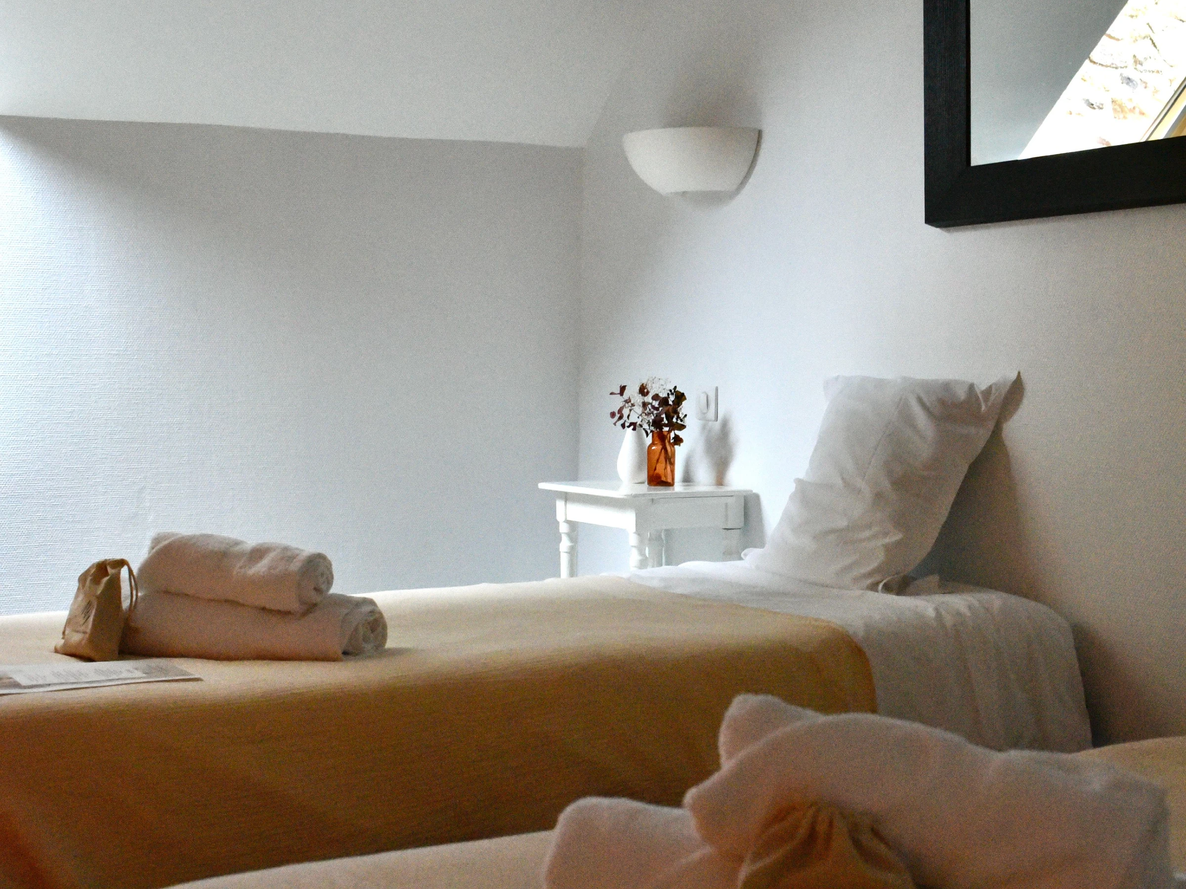 Access to the gîte is via a stone staircase. The fully equipped kitchen with dining area and large living room with two single beds are accessible. There is a bathroom with two sinks and a bathtub. There is a separate toilet. Upstairs: one bedroom with two single beds that can be joined together and one bedroom with three single beds, including two single beds that can be joined together. Beds are made upon arrival, towels are provided.