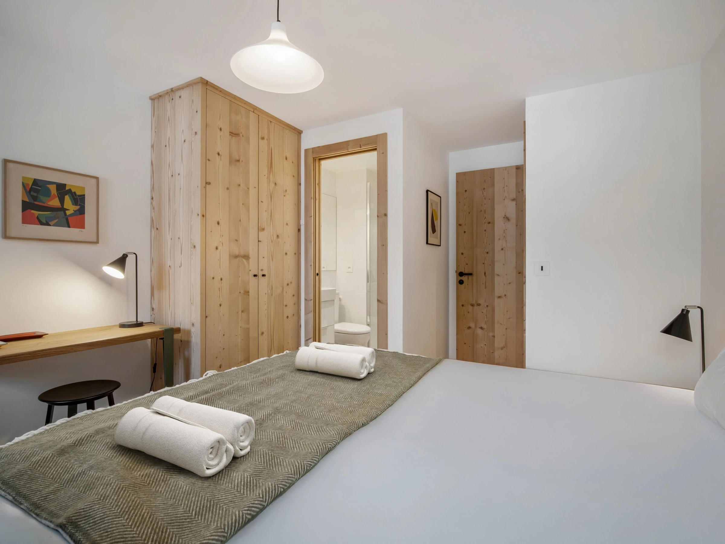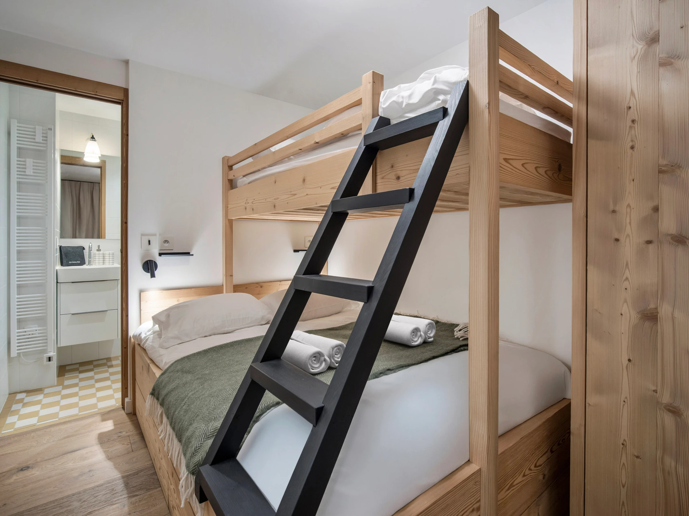 - One bedroom with bunk beds: a single bed on top and a double bed below, with en suite bathroom