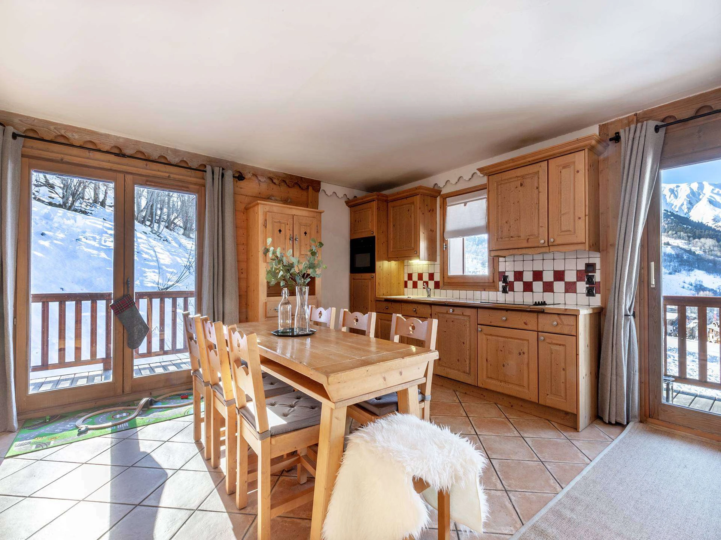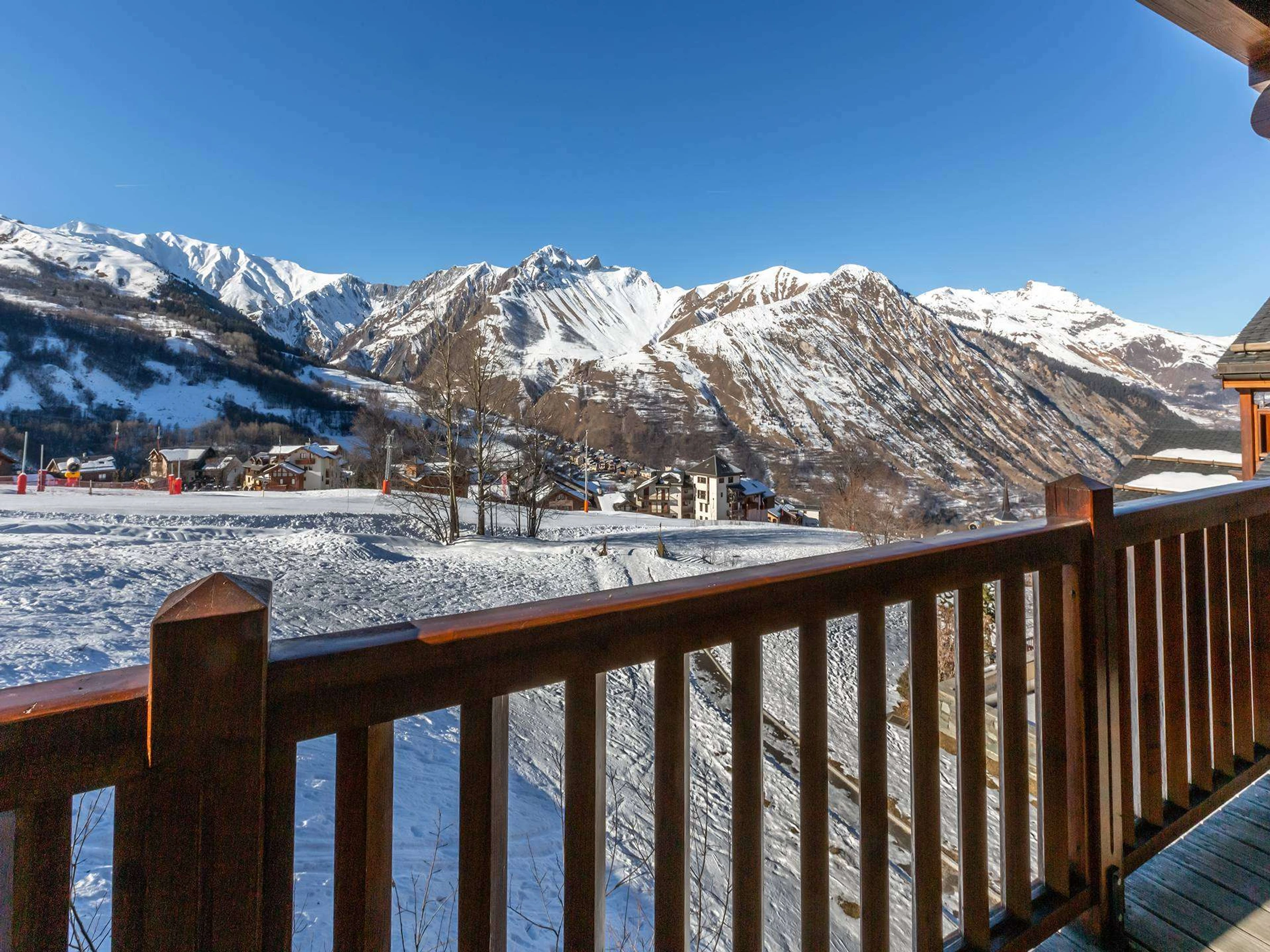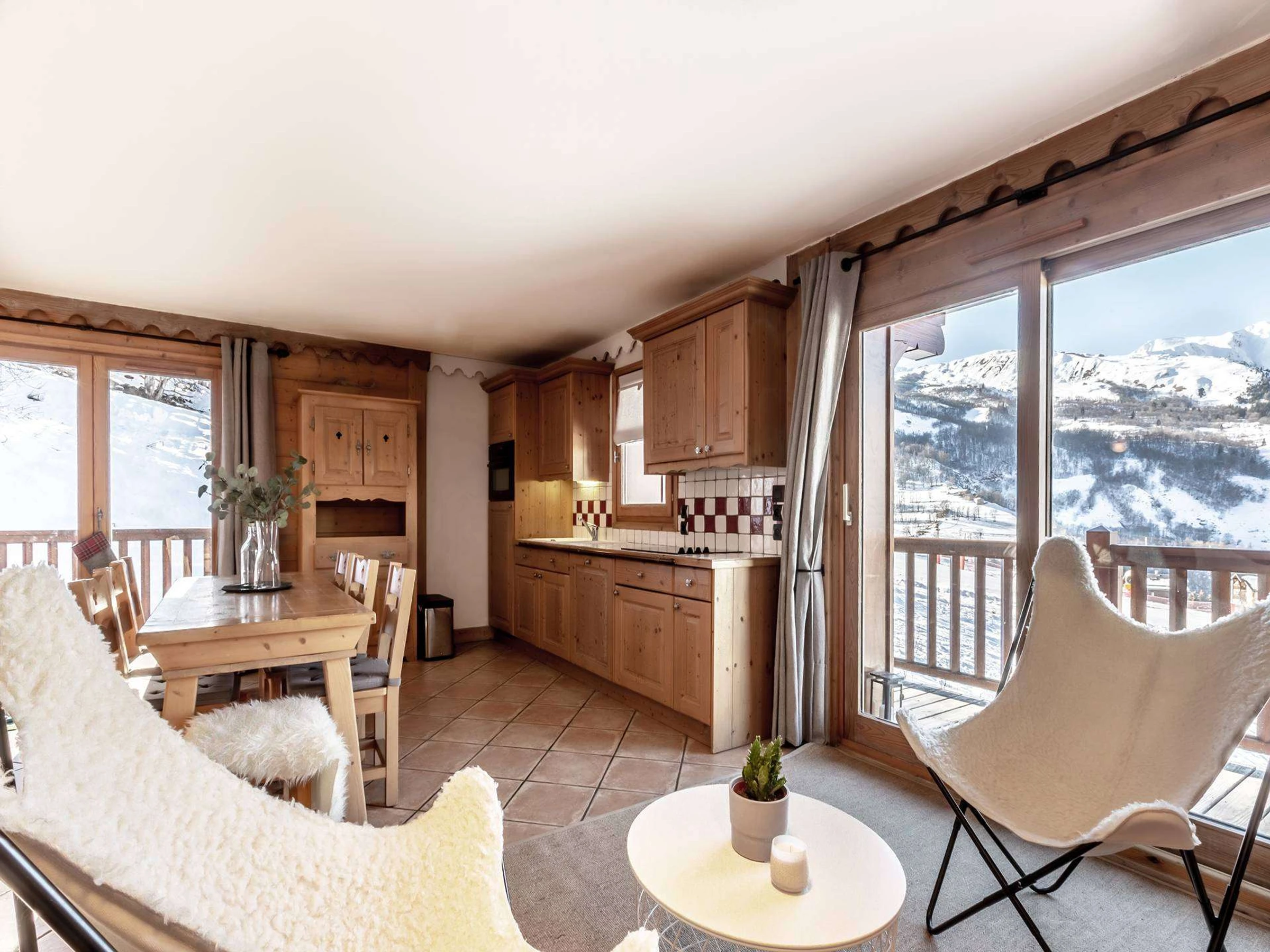 RESIDENCE WITH SWIMMING POOL AND SPA! SKI IN SKI OUT. Exceptional refurbished 104 sqm apartment for 6 guests with spacious dual aspect lounge with 2 large balconies facing South and West. Outstanding panoramic views over the ski slope. Master bedroom with ensuite, two further bedrooms with balcony, separate WC and bathroom. Large wardrobes in all bedrooms. Included services: sheets and towels, final cleaning, 2 parking spaces. WIFI + free access to wellness area with heated indoor swimming pool, sauna, hammam, jacuzzi, fitness room and treatments (on reservation and at an additional cost). T
