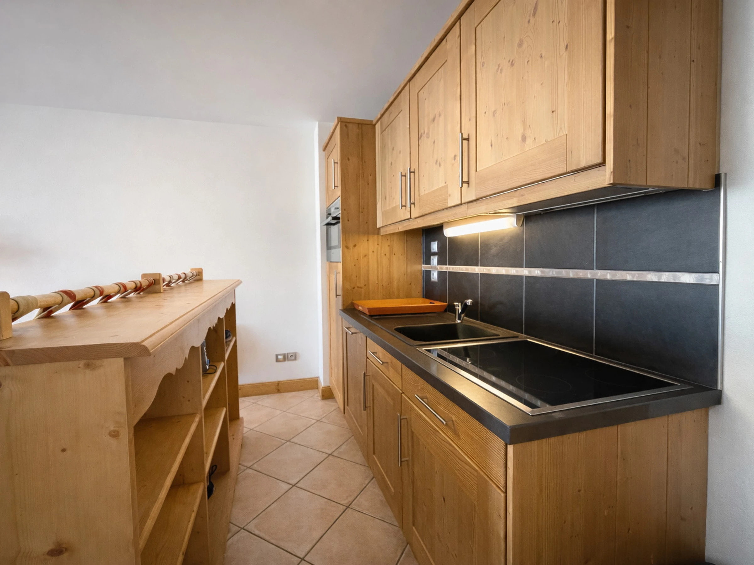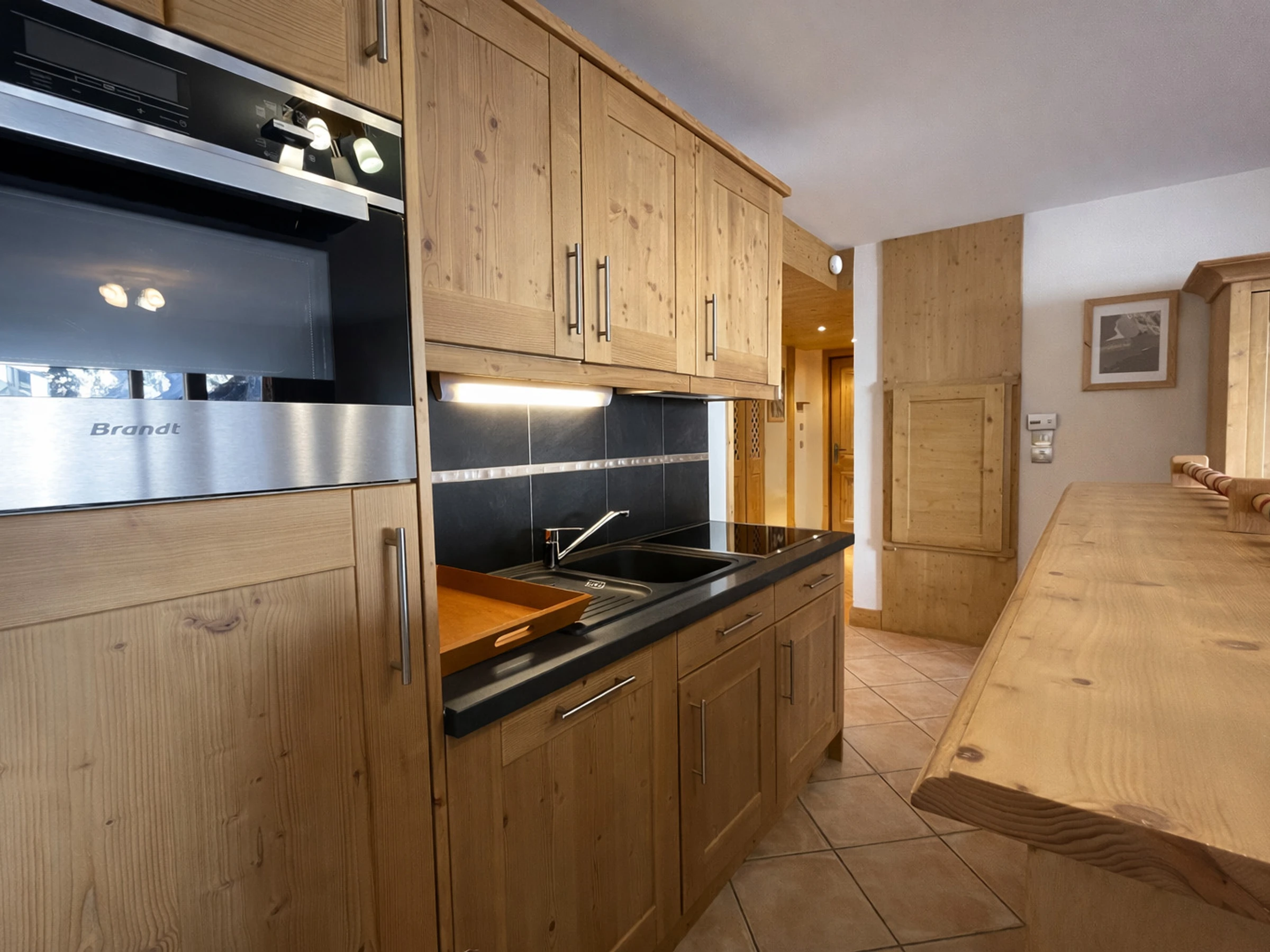 Integrated kitchen open to the living room: induction hob (x4), combined microwave oven, fridge (freezer), dishwasher, coffee maker, kettle, toaster, raclette/ pierrade/ fondue set