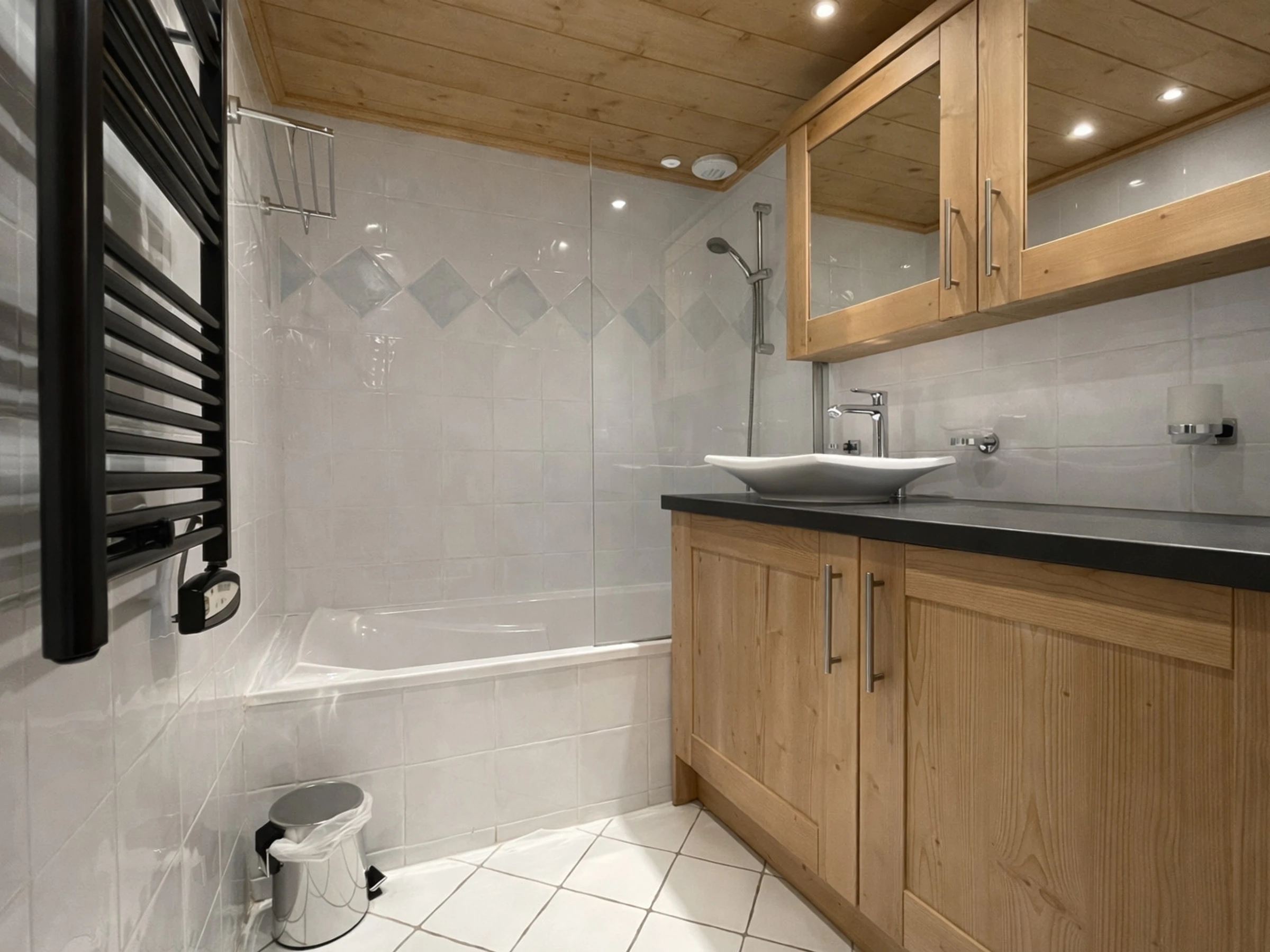 Bathroom: washbasin, bathtub, heated towel rail, combined washing machine / dryer