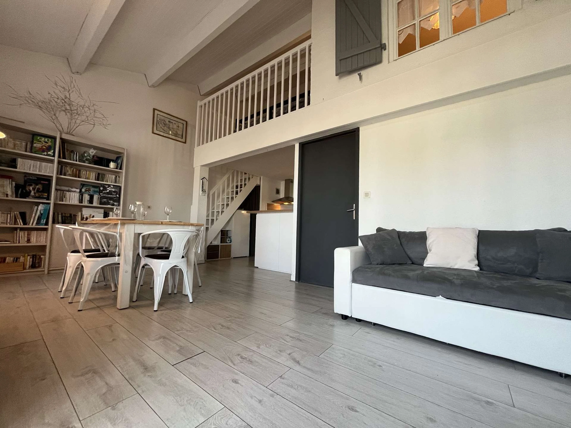 Le logement est au rez de chaussé, il se compose d'un séjour avec canapé, un coin salle à manger pour 6 personnes, un coin cuisine avec four, une machine à laver une salle de bain et WC séparés, à l'étage sur la mezzanine un lit tiroir pour 2 couchages en 90cm ainsi qu'une chambre avec un lit en 140cm pour 2 couchages supplémentaires .